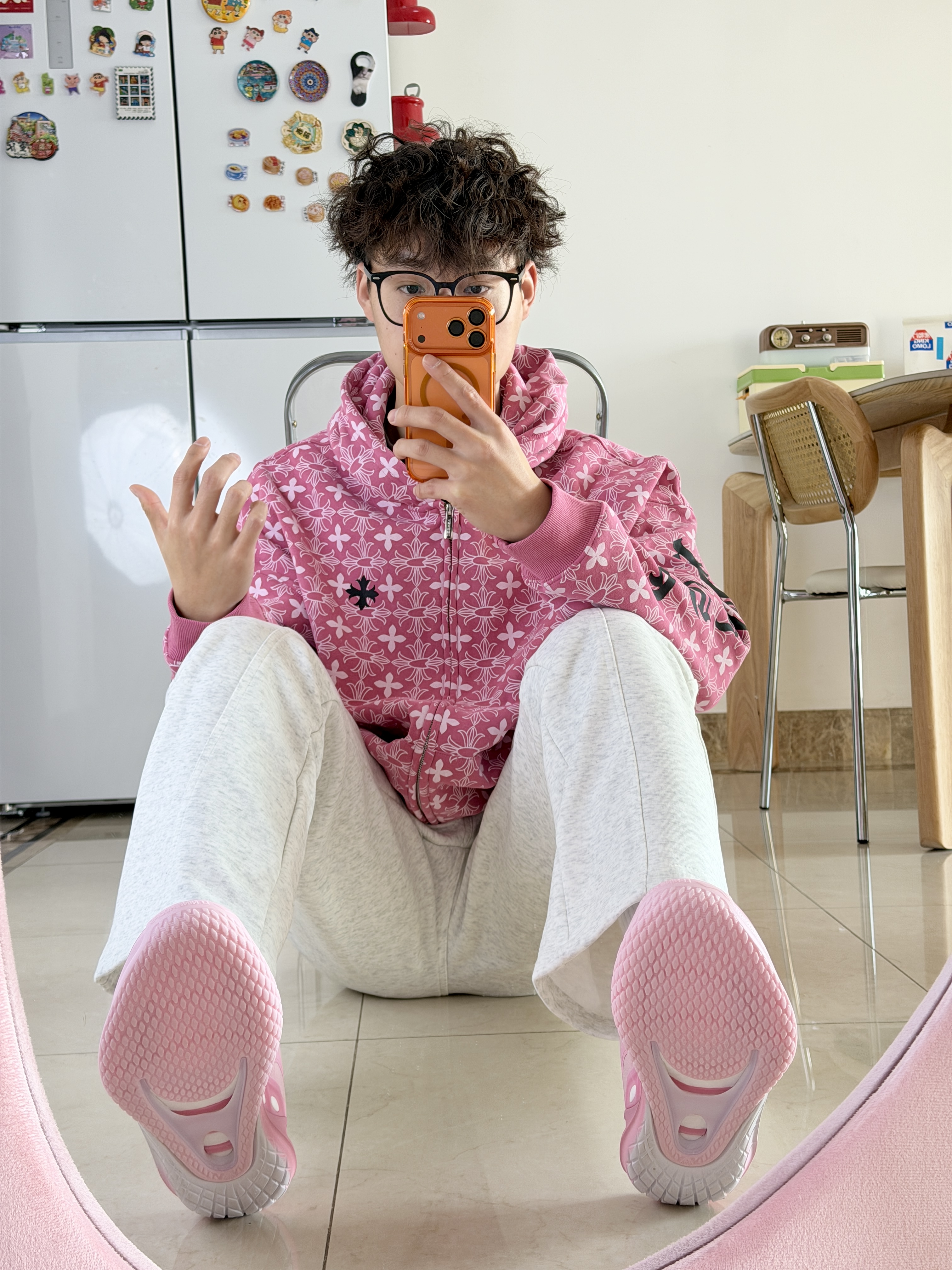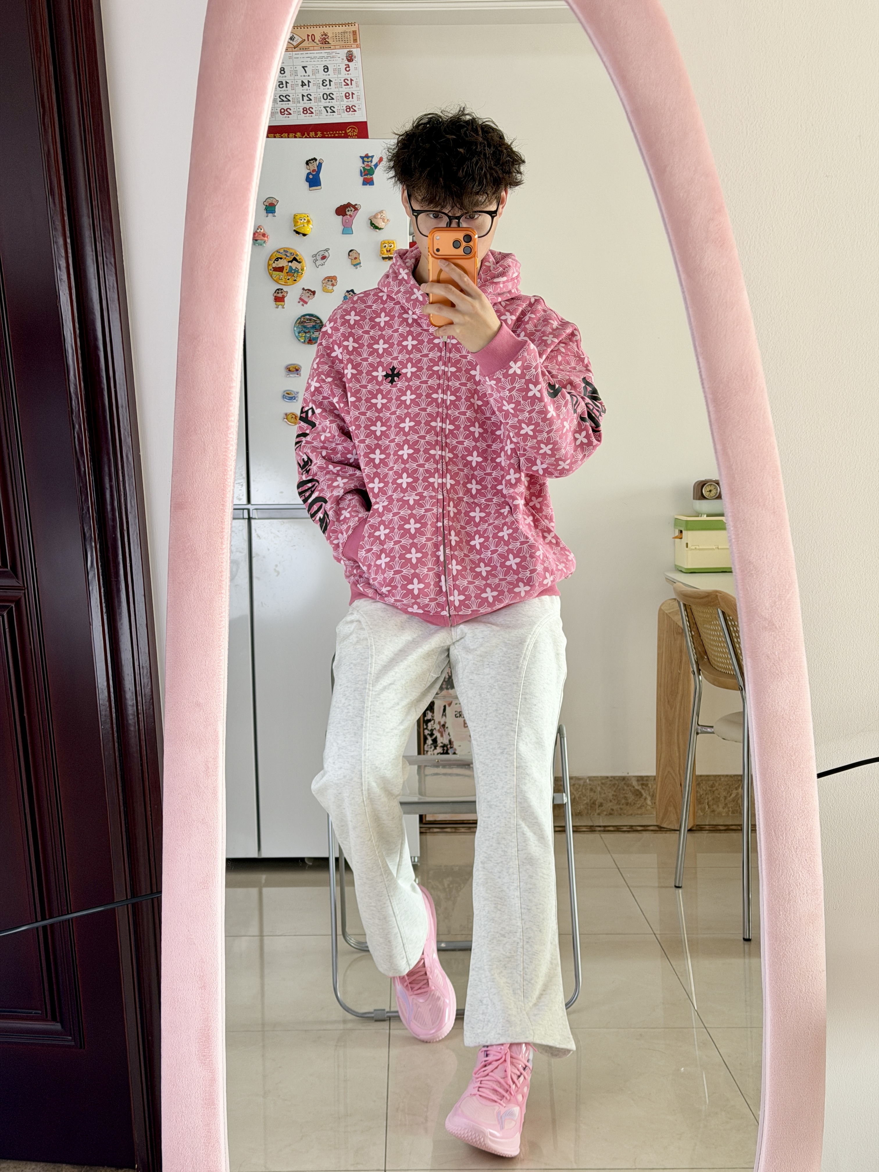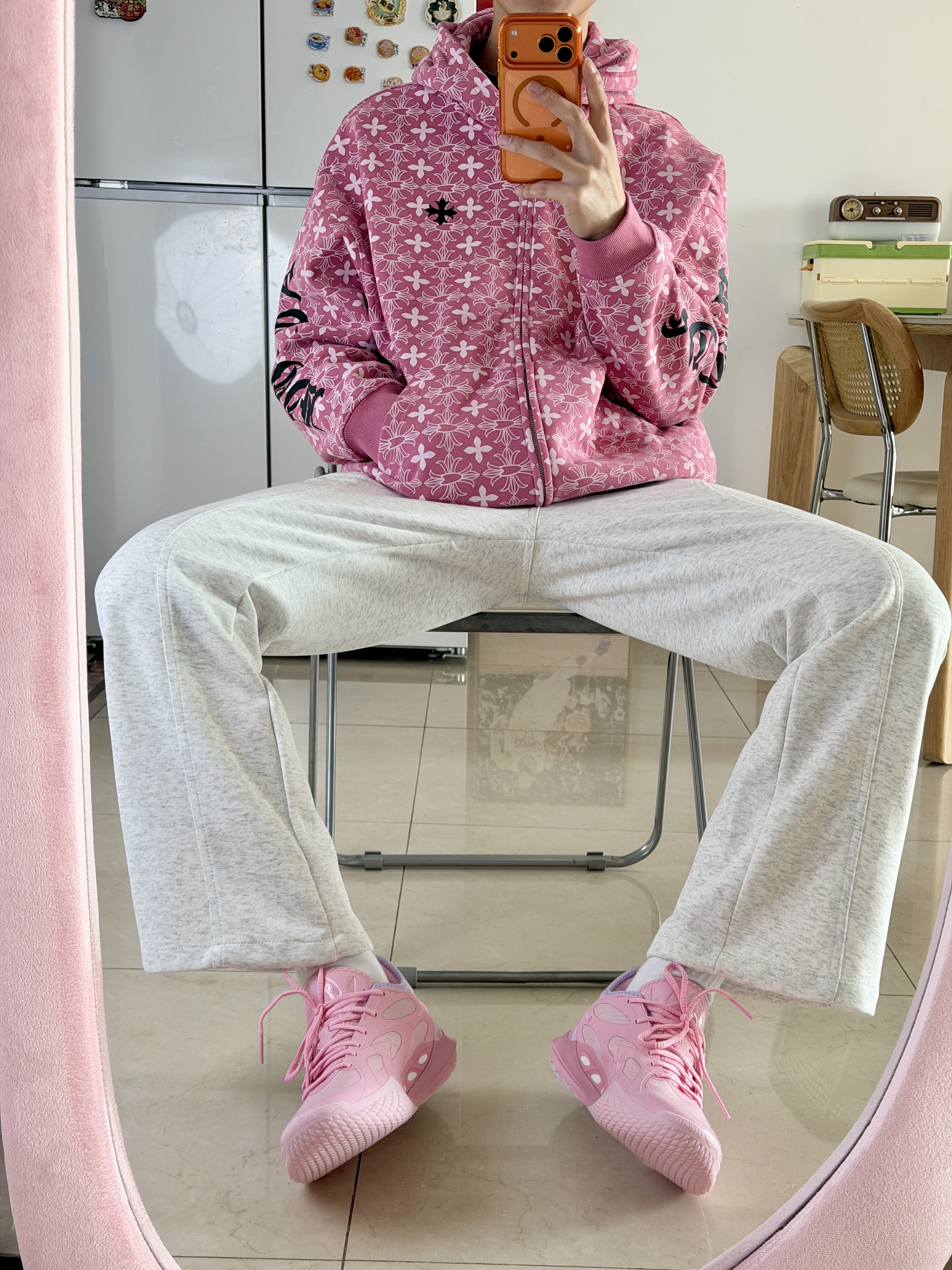 今日份粉色系穿搭太爱了!能上街能上球场粉白 满印的连帽卫衣软乎乎的搭浅灰色直筒 卫裤慵懒又显瘦脚踩樱花粉球鞋颜值真的爱了