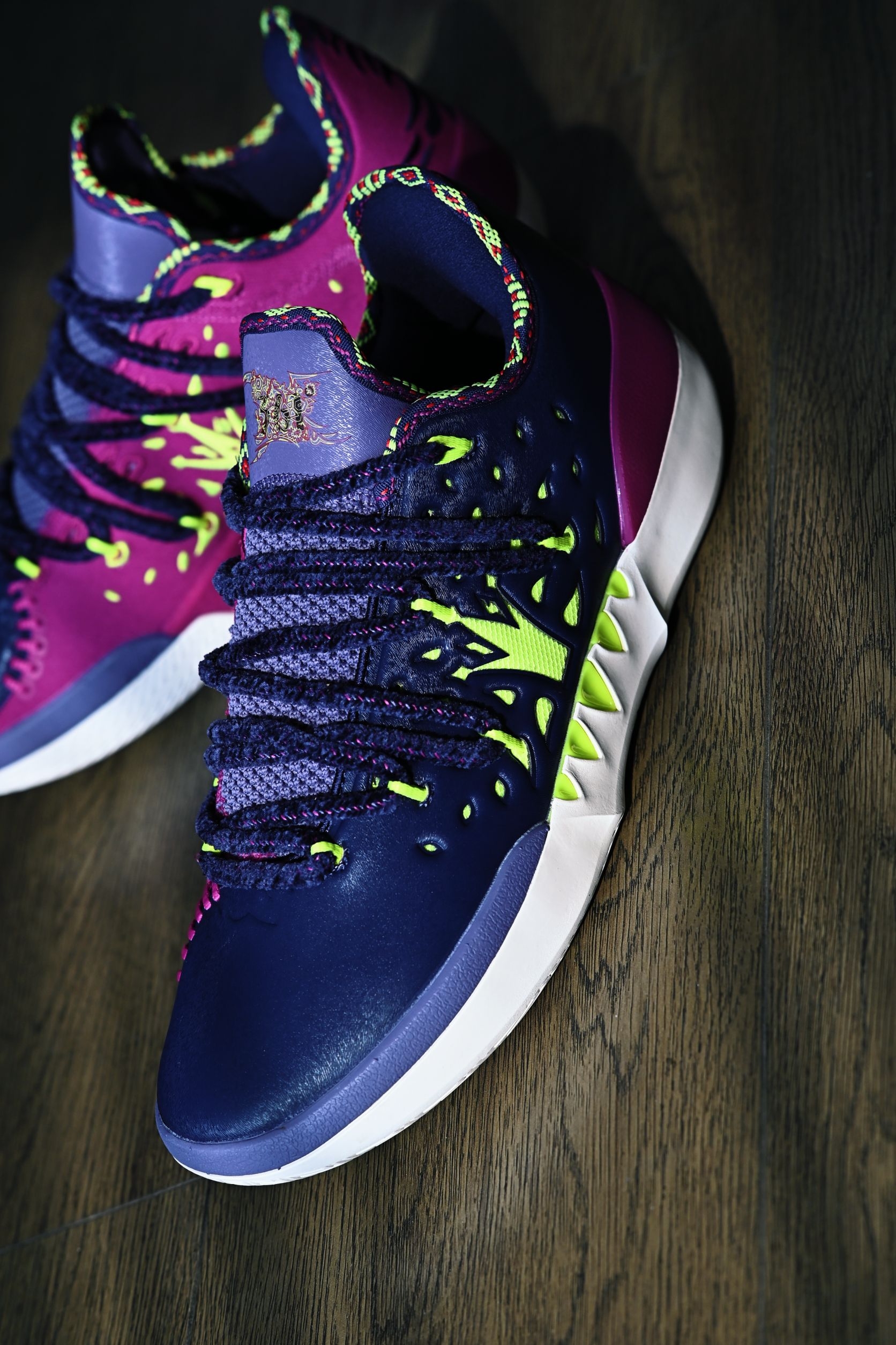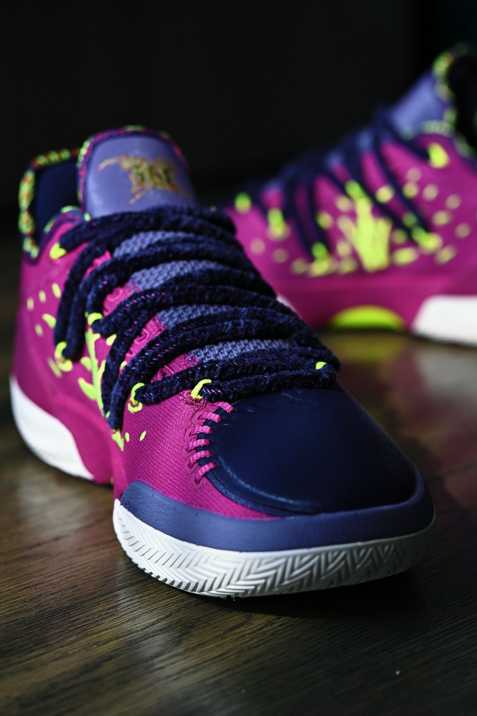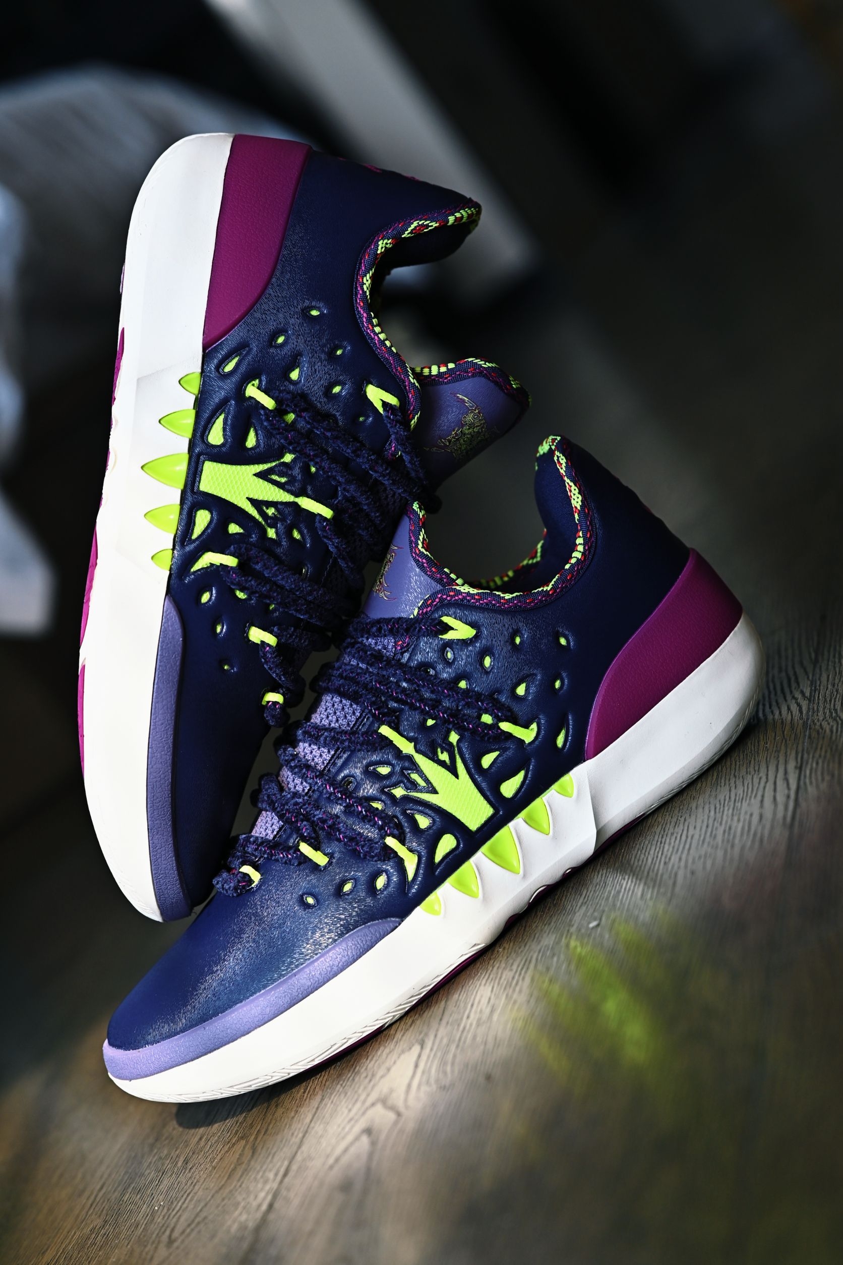作为361°家的旗舰实战款,Joker2的整体质感都让我十分惊艳 外观设计一眼看去就知道是约老师的战靴 标志性的JOKER Logo,麂皮和皮革的拼接材质再加上这个毛茸茸的鞋带、和一代同款的马鞍元素,颜值这块完全挑不出刺啊 当然为了实战考虑,也配有一副常规的替换鞋带,全新的绑带系统包裹感非常好 这回二代同时推出了高低帮两个版本,兄弟们按照自己需求选择即可