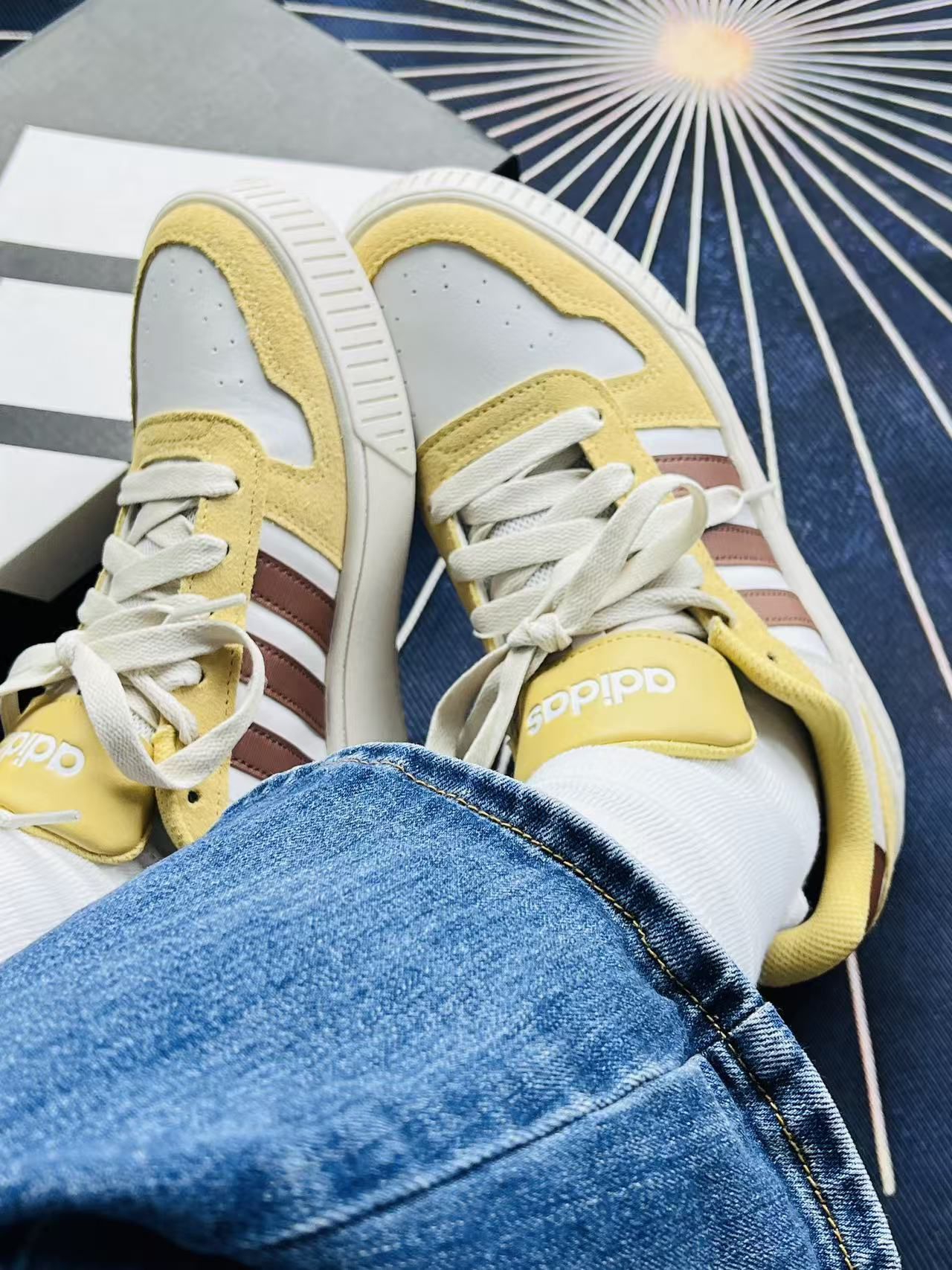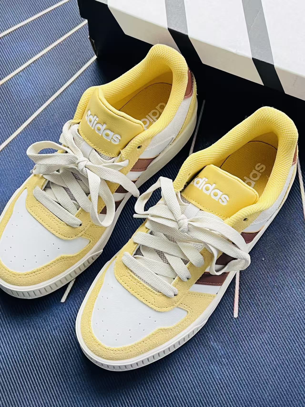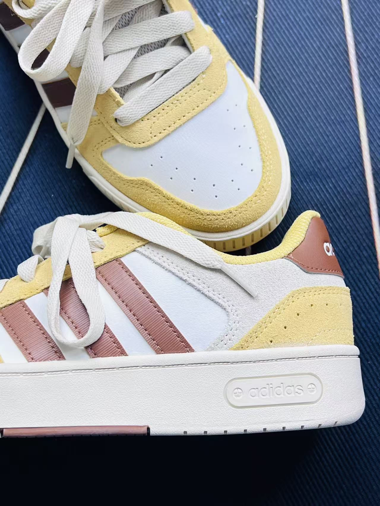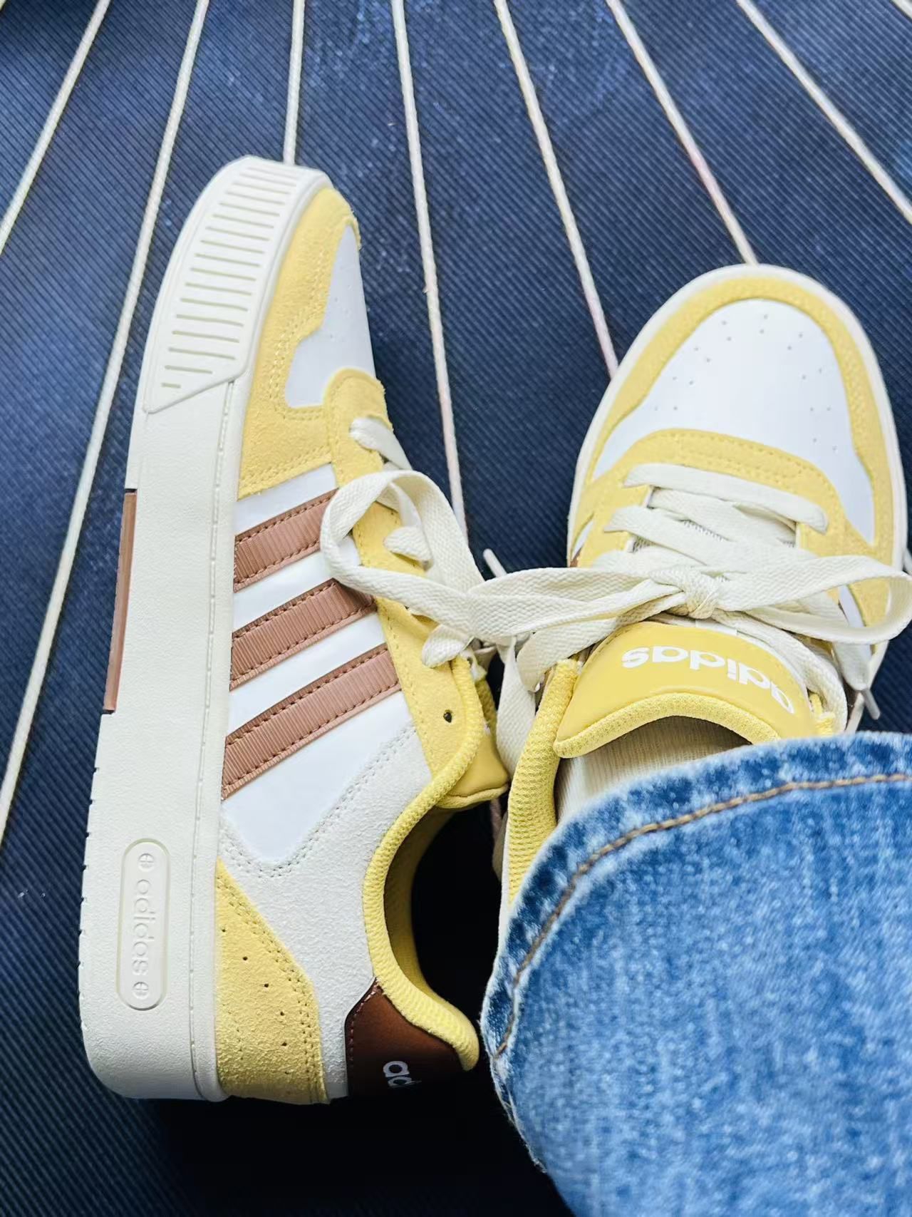 入手这双阿迪的黄白拼色板鞋有段时间了,说说真实上脚感受吧🍋 首先是脚感,鞋身的网布和麂皮拼接还挺透气的,夏天穿不会闷脚,鞋垫的软度也刚好,日常走路逛个街没什么压力。黄白棕的配色很戳我,搭牛仔裤、运动裤都很和谐,不会太跳脱,日常出街的适配度挺高的。鞋型也比较合脚,正常码数选就可以。 不过也有明显的小缺点,麂皮的材质太容易沾灰了,稍微蹭到点脏东西就很明显,清洁起来得费点劲🧹;另外鞋帮处的填充偏...