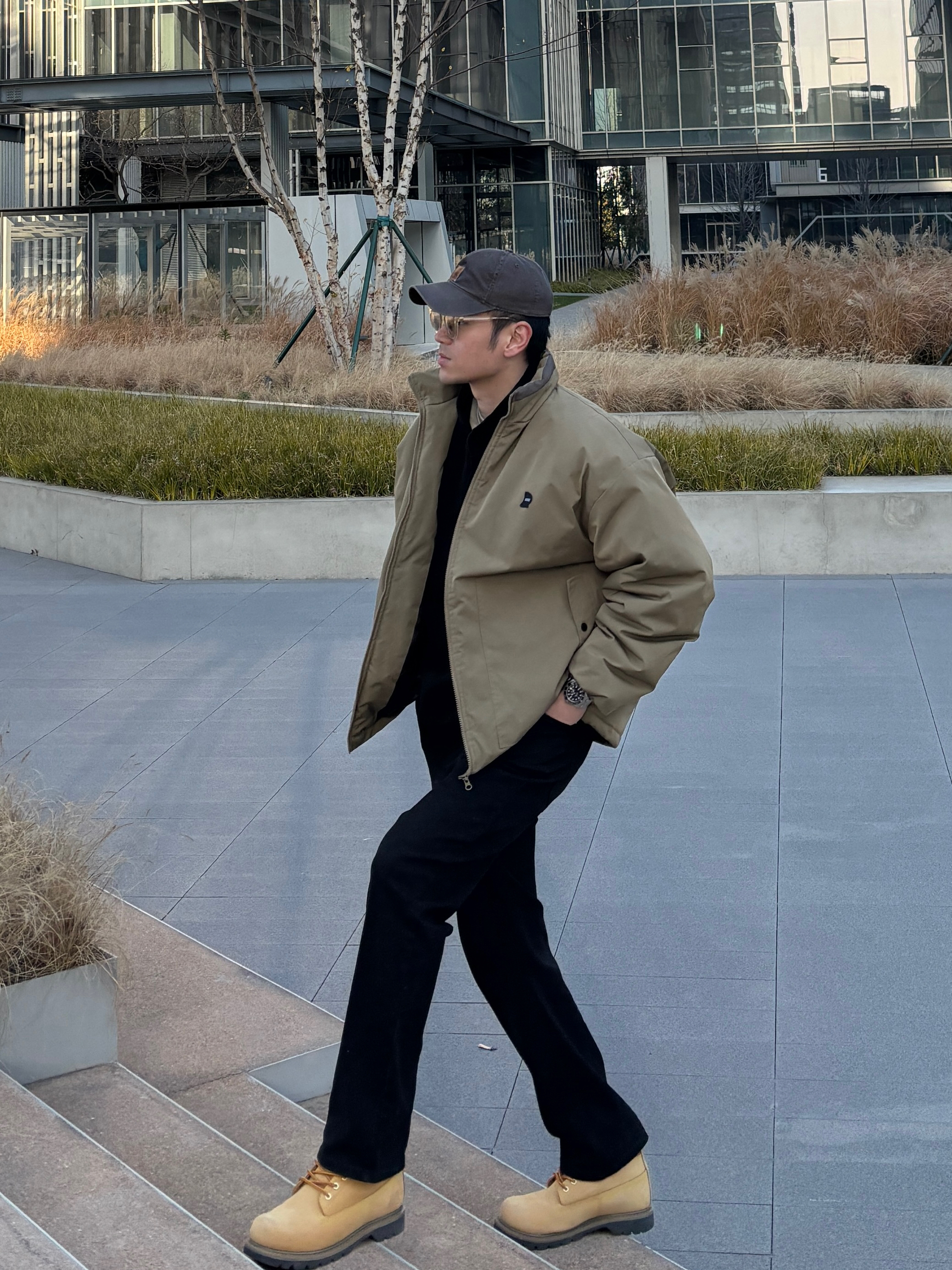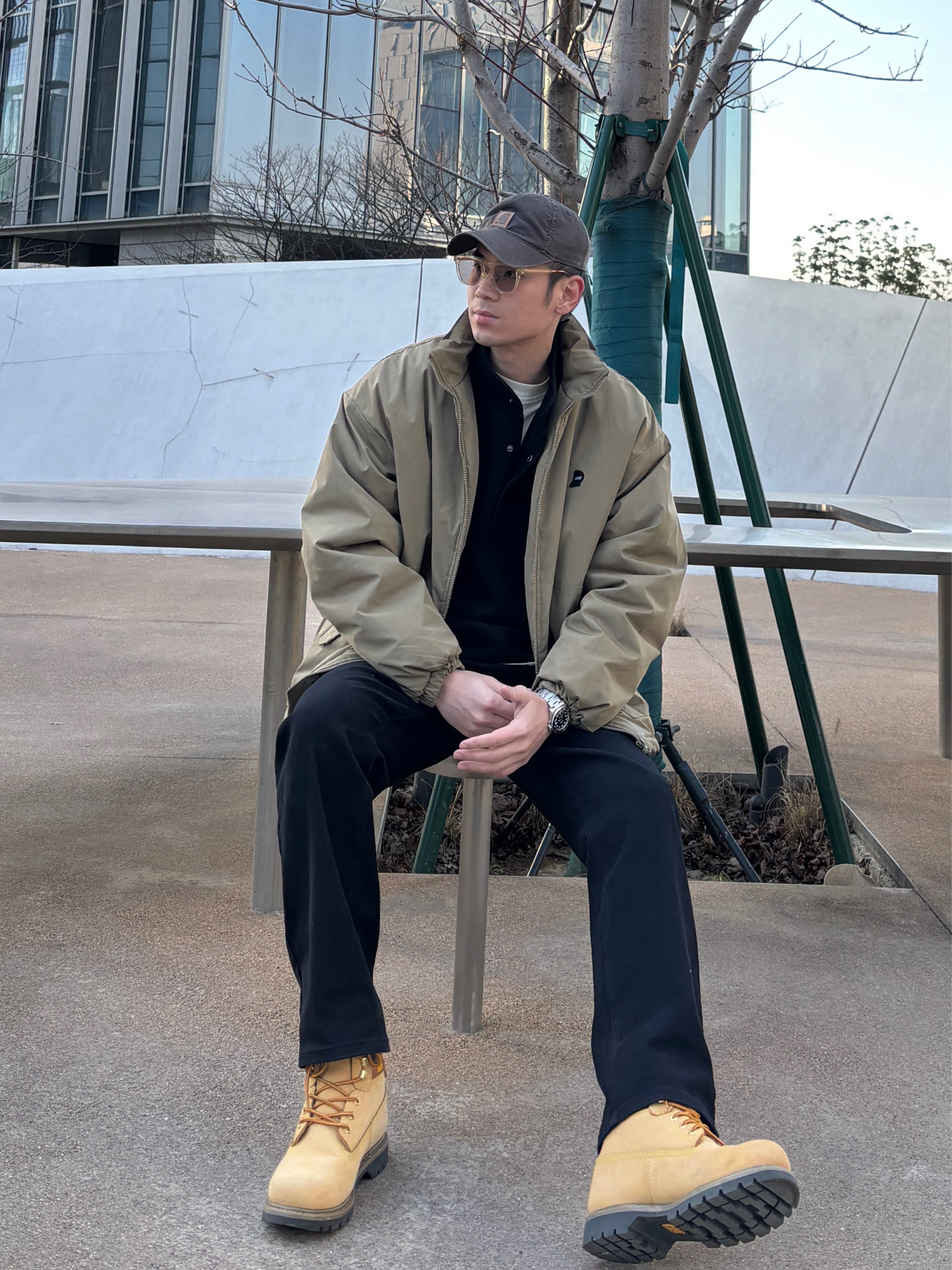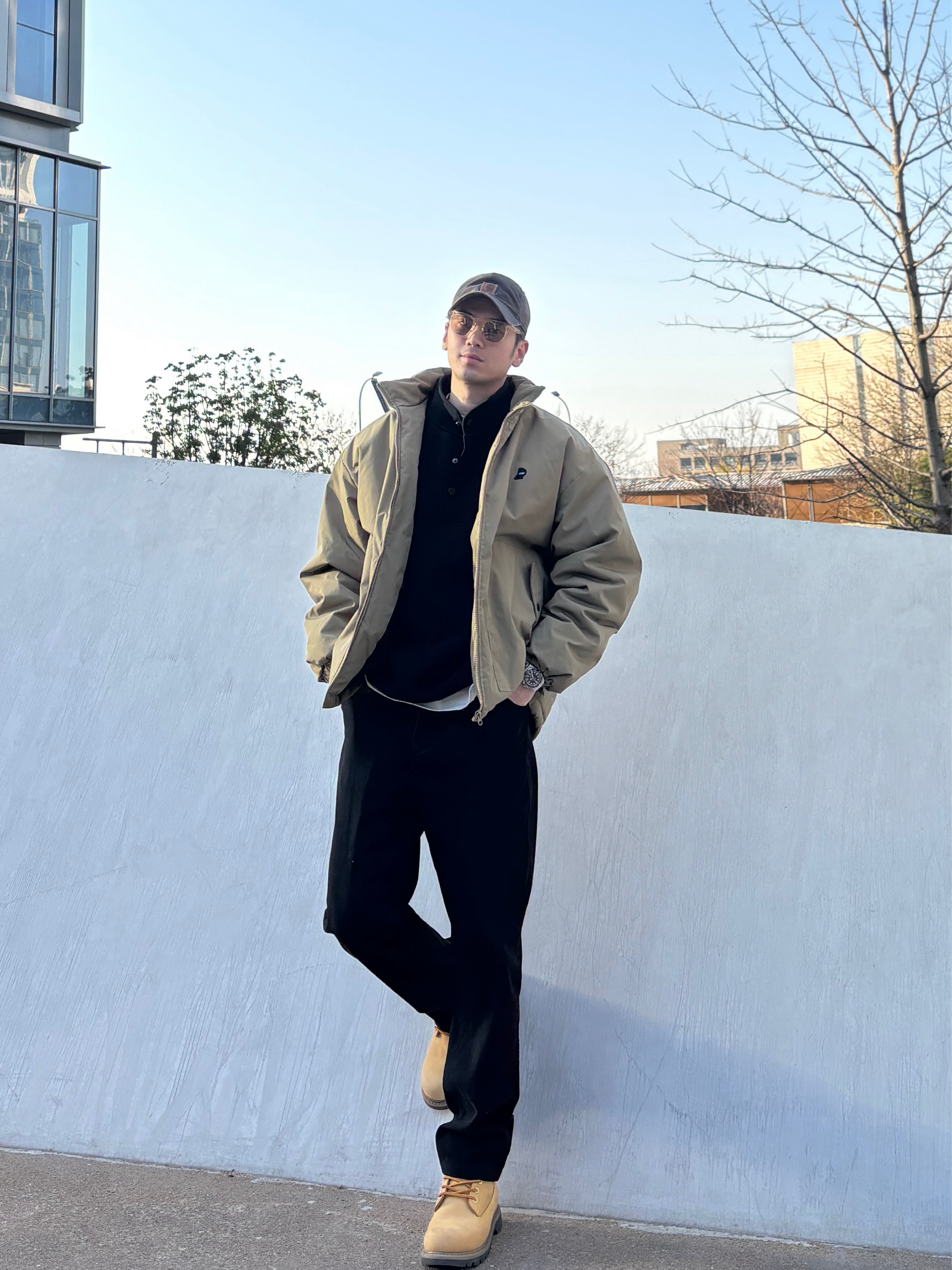 男生冬季硬核穿搭还得看工装风叠穿😎 卡其绿立领棉服版型超正,小刺绣点缀不单调。 内搭黑色开胸纽扣卫衣,解开领口随性又自在。 黑色直筒水洗牛仔裤利落又百搭 最后穿双冬季必备的沙漠黄复古中帮工装靴,配色高级又能显腿长✌ 整体风格硬朗又带少年感,随便搭个棒球帽,美式复古那范儿不就有了嘛🙋♂️ 这套工装叠穿look,你们觉得搭棒球帽还是冷帽更有型,评论区里聊聊吧🫡 - 今日搭配 衣服裤子:NICE L...