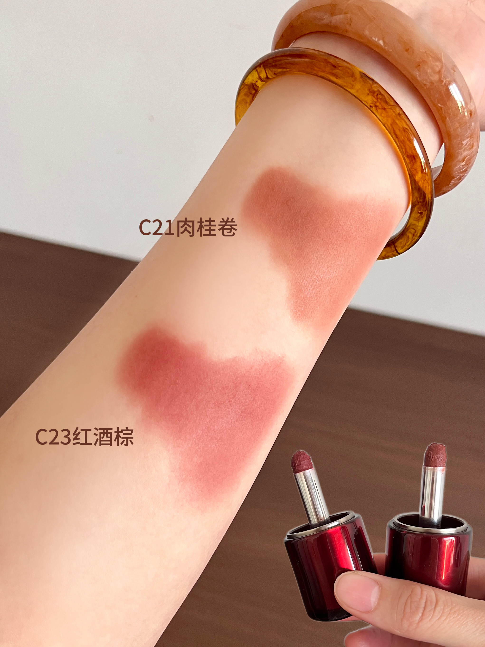 包装做的这么美也就算了,怎么色调也做的如此权威! 两支是能带来冬日温暖的肉桂热红酒氛围色 每次完妆透着气血十足的红润感 简直是本淡人天选氛围色多用霜!!