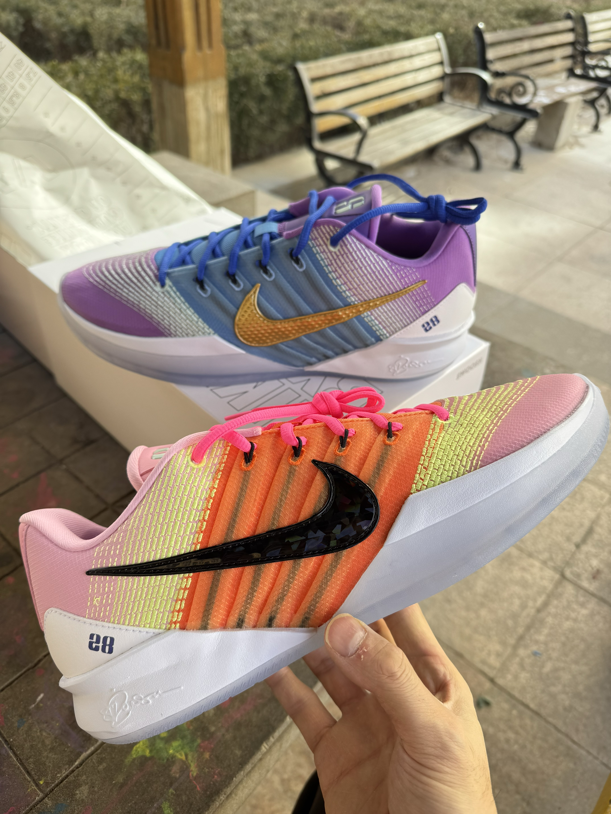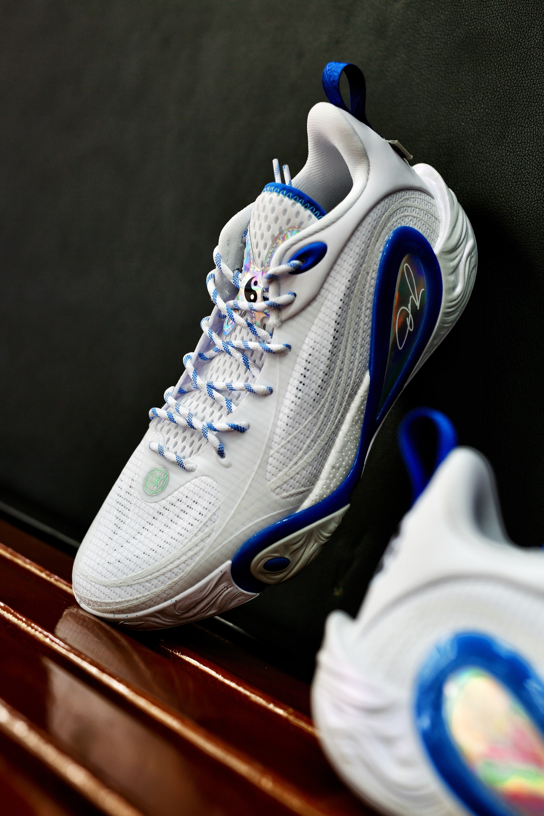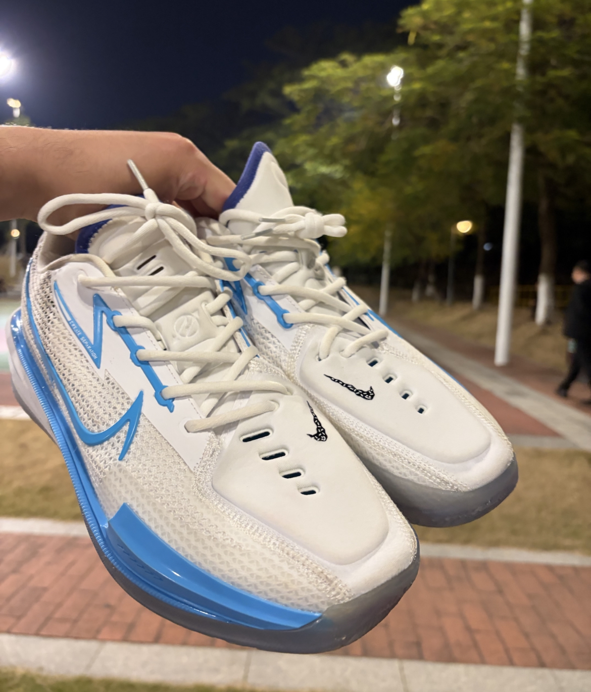 首先说颜值,白蓝配色还是蛮干净了 网眼鞋面看着就透气 蓝色的钩子和中底线条一搭 晚上在球场灯光下也是蛮亮眼 还没开打就已经赢了一半回头率 上脚第一感觉就是轻 比我之前穿的球鞋都要轻 启动的时候完全没有拖沓感 前掌的Zoom Air气垫反馈蛮直接, 突破、急停的时候能明显感觉到弹 落地缓震也够稳,打了一下午膝盖没觉得酸