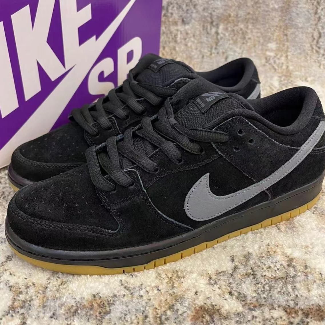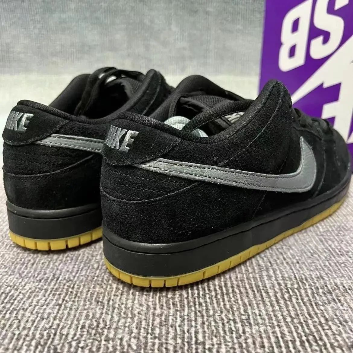 Nike Dunk SB Pro "fog" 第一眼就被这双的质感拿捏住。整体采用全黑麂皮鞋面,细腻绒感在光线下层次非常明显,低调但不沉闷;侧面搭配浅灰色 Swoosh,在黑色基调中跳出来,耐看又有辨识度。 鞋头与鞋身大面积麂皮覆盖,日常通勤、街头穿搭都很稳;打孔鞋头保证透气性,长时间上脚也不闷。鞋舌与内衬延续 SB 一贯的加厚填充设计,包裹感扎实,对滑板玩家非常友好。 中底部分采用经典黑...