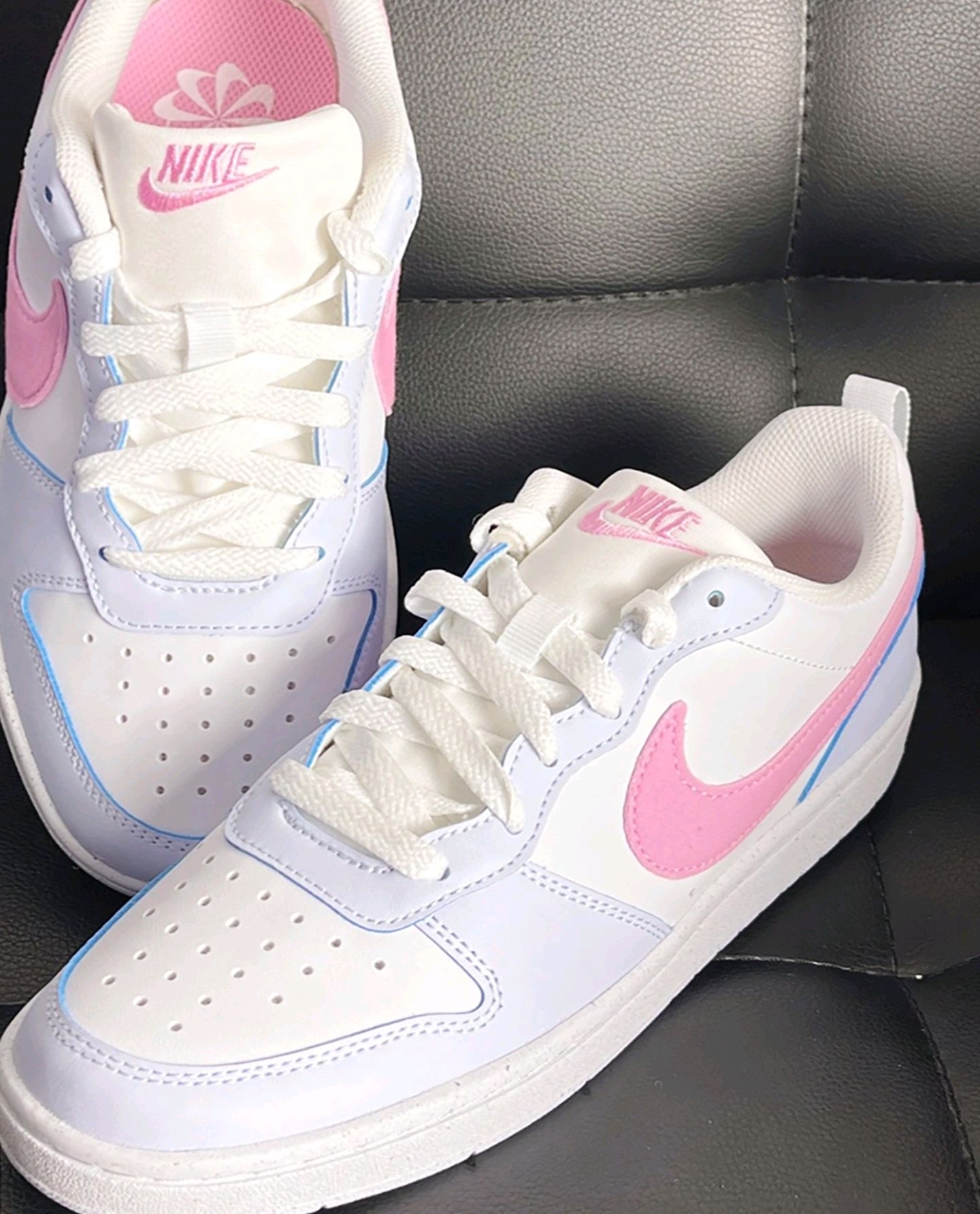 周末和闺蜜去公园晒太阳☀️,穿了新入的Nike Court Borough Low Essential+酷菠萝板鞋~粉白蓝配色好温柔💗,蓝皮质鞋面摸起来质感不错,鞋舌和鞋垫藏着小花🌸细节超戳! 我搭浅粉卫衣+白色百褶裙,闺蜜说我今天像颗甜甜的蜜桃💕~走路逛了两小时都舒服,尺码正常我37码刚好,瘦脚宽脚都合适
