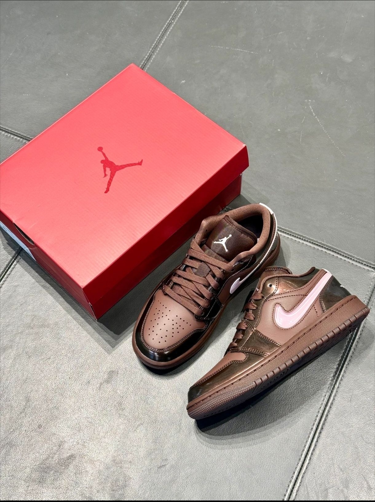 这双2026情人节限定AJ1是低帮设计,主体是深浅棕拼色,部分鞋面用了漆皮材质,光线下会泛出细腻的光泽感,鞋侧的勾子是淡粉色,和棕色搭配起来不甜腻,反而透着点复古温柔,鞋舌的白色飞人标也刚好做了点缀。实际穿在脚上,鞋型很贴脚面,不会磨后跟,鞋底的弹性也适中,日常逛街走半天脚也不酸,漆皮部分也没有硬邦邦的磨脚情况,整体脚感很舒服 你们觉得这双棕粉AJ1搭牛仔裤还是运动裤更好看呀?