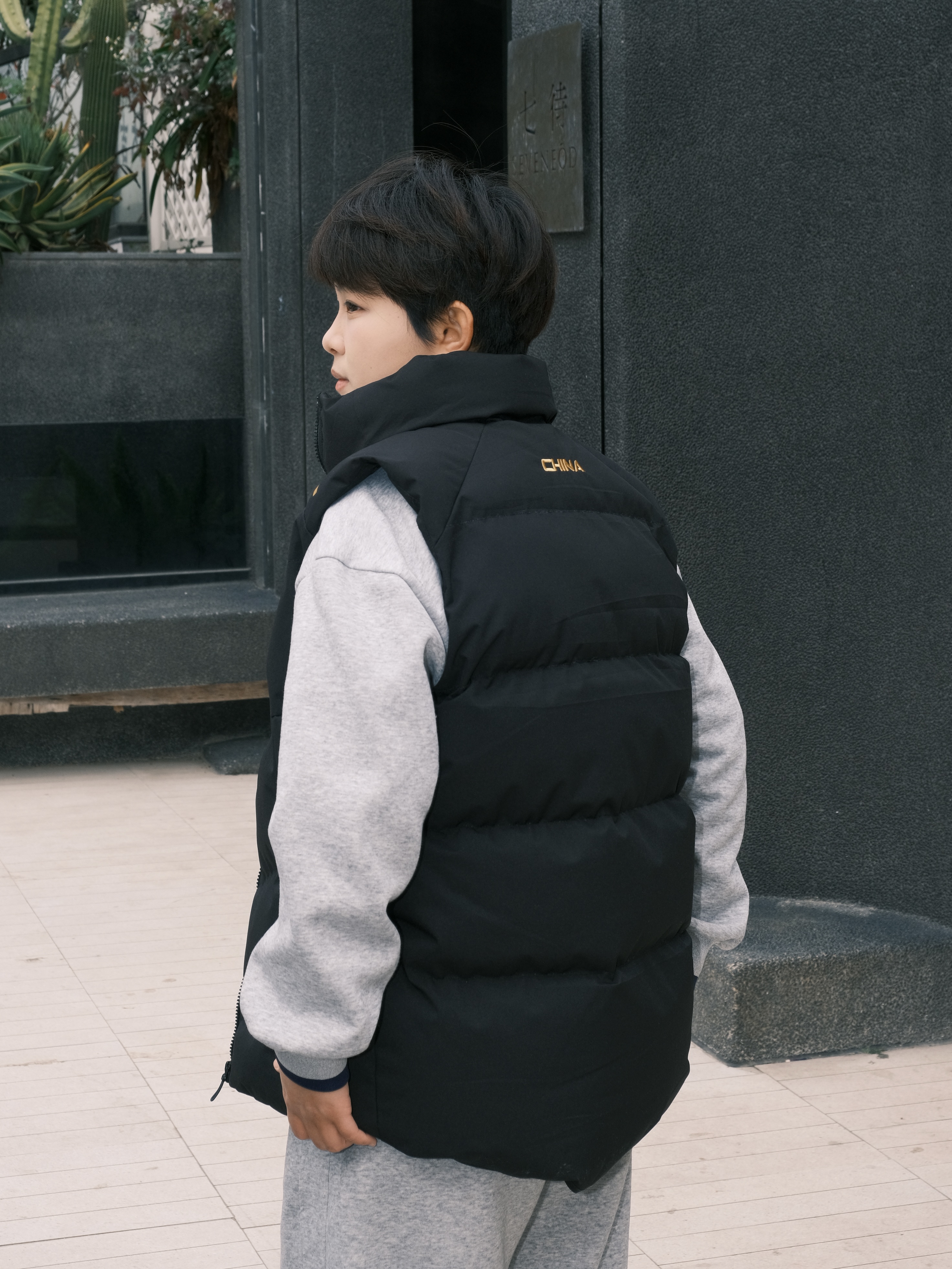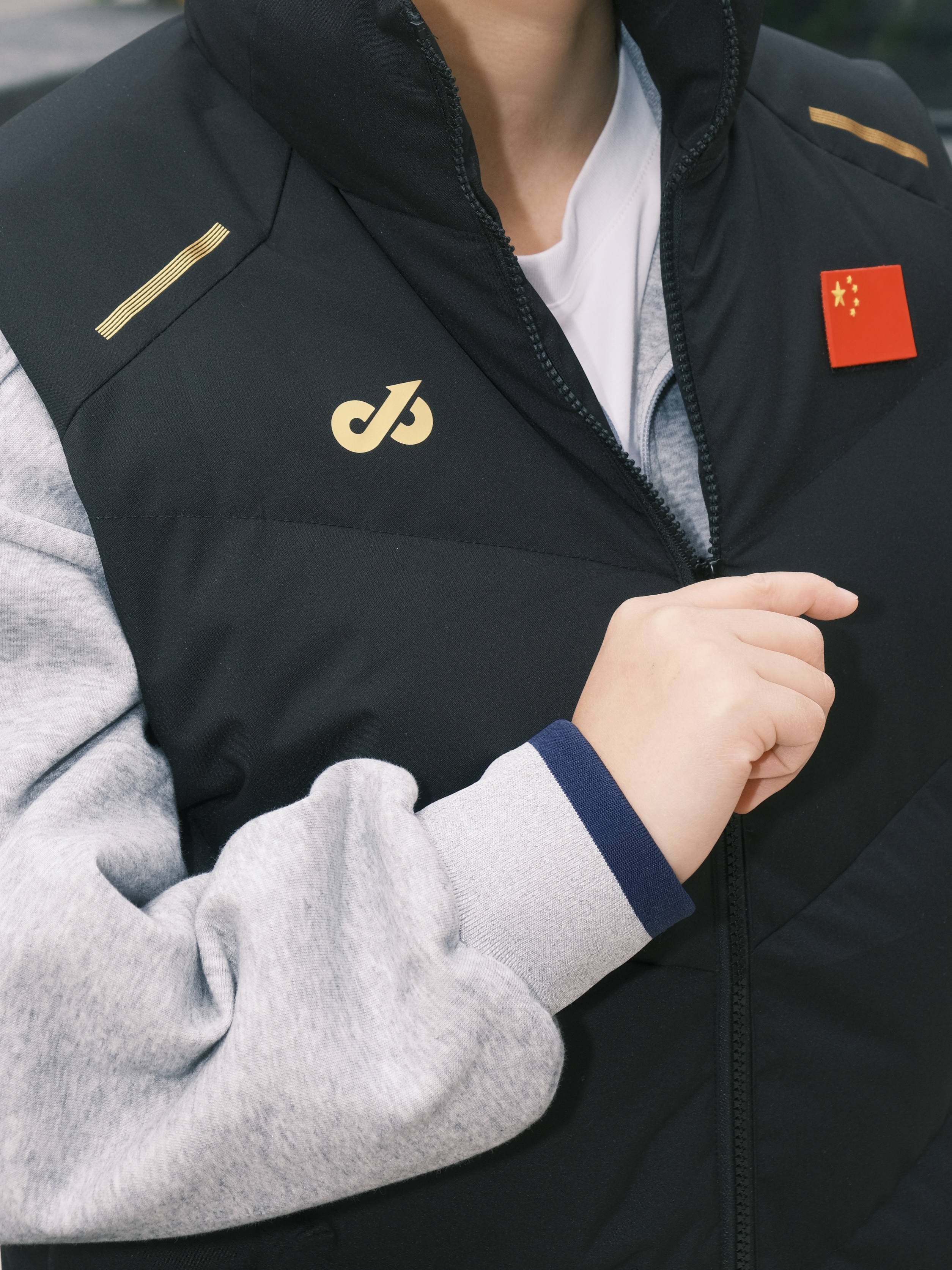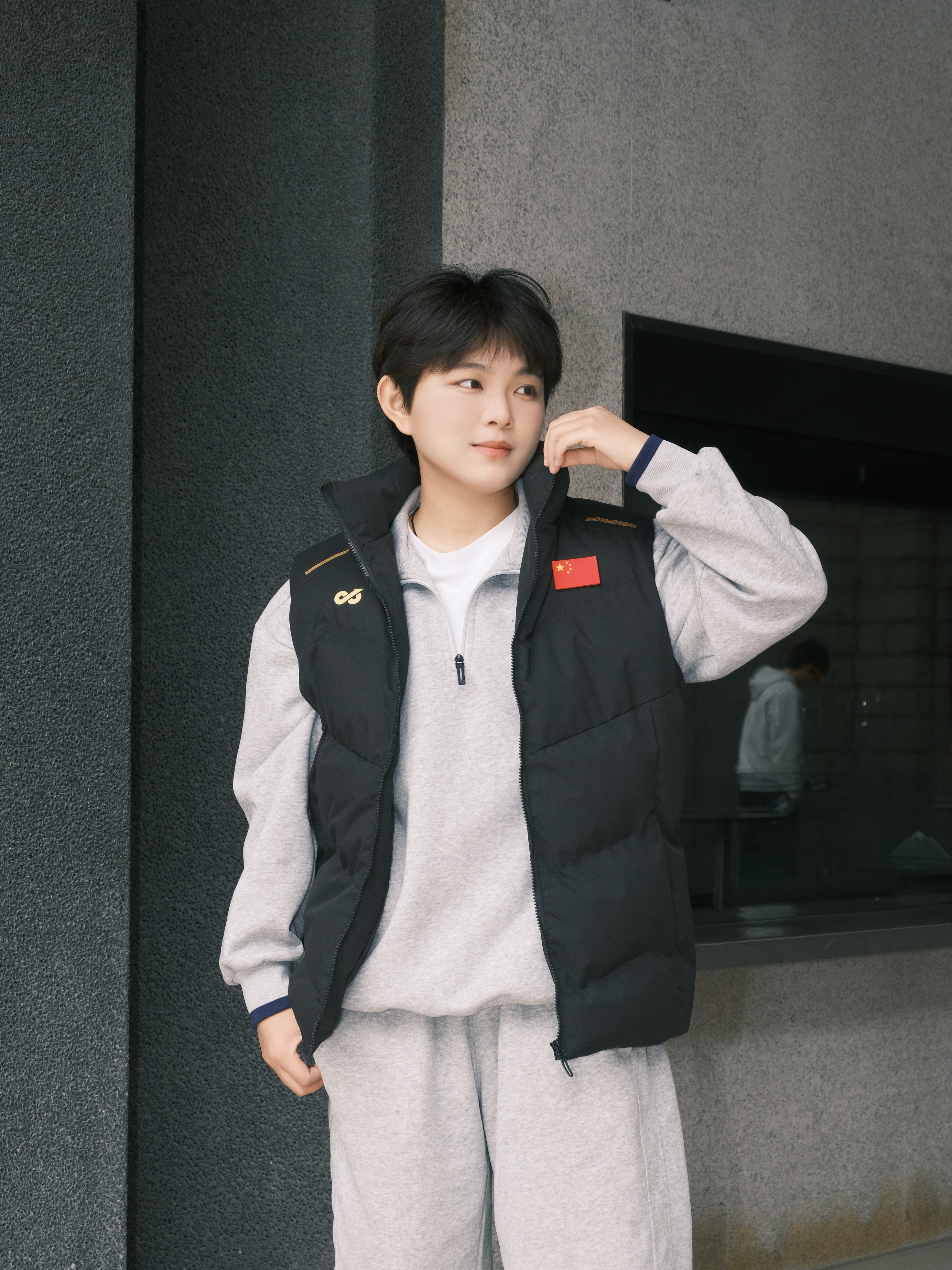 ✨ 降温不用裹成熊,一件马甲就够搭。 • 经典黑金配色马甲立住气场 国旗标+金属线条点缀,低调又有辨识度 • 内搭浅灰半拉链卫衣+同色系卫裤 软乎乎的质感自带松弛感,少年感直接拉满 • 脚上踩一双小白鞋 整套look干净利落,出街回头率稳了