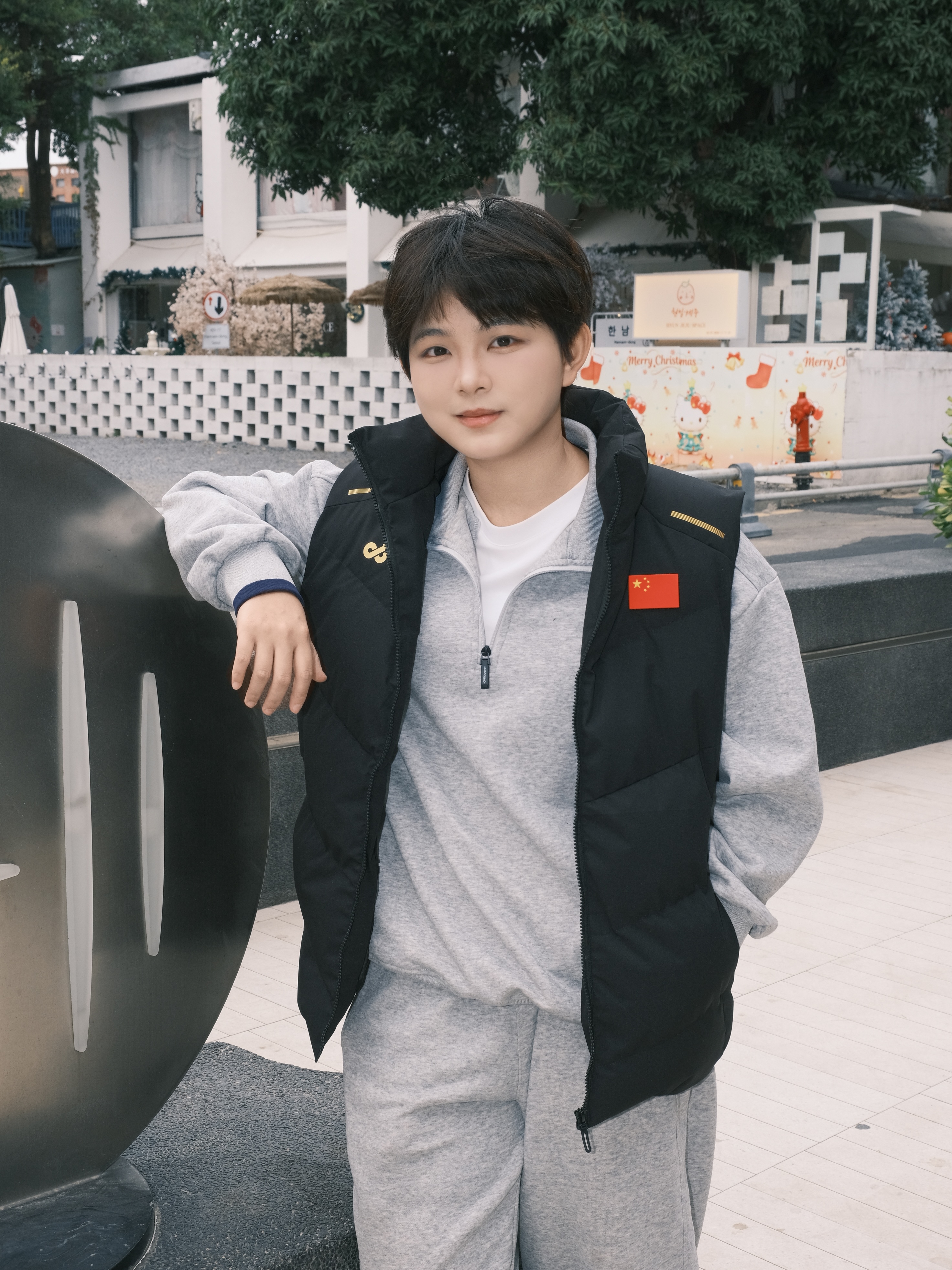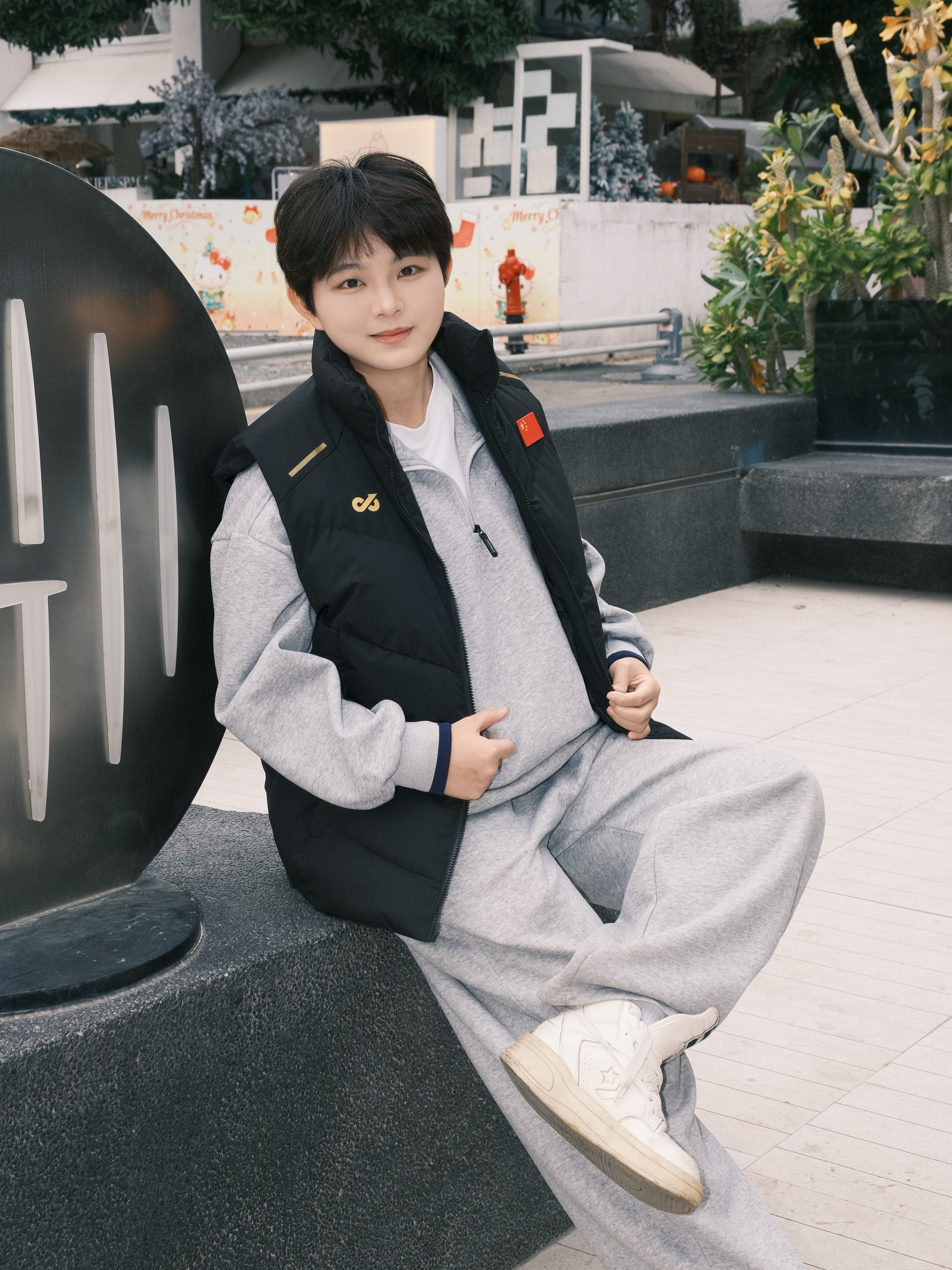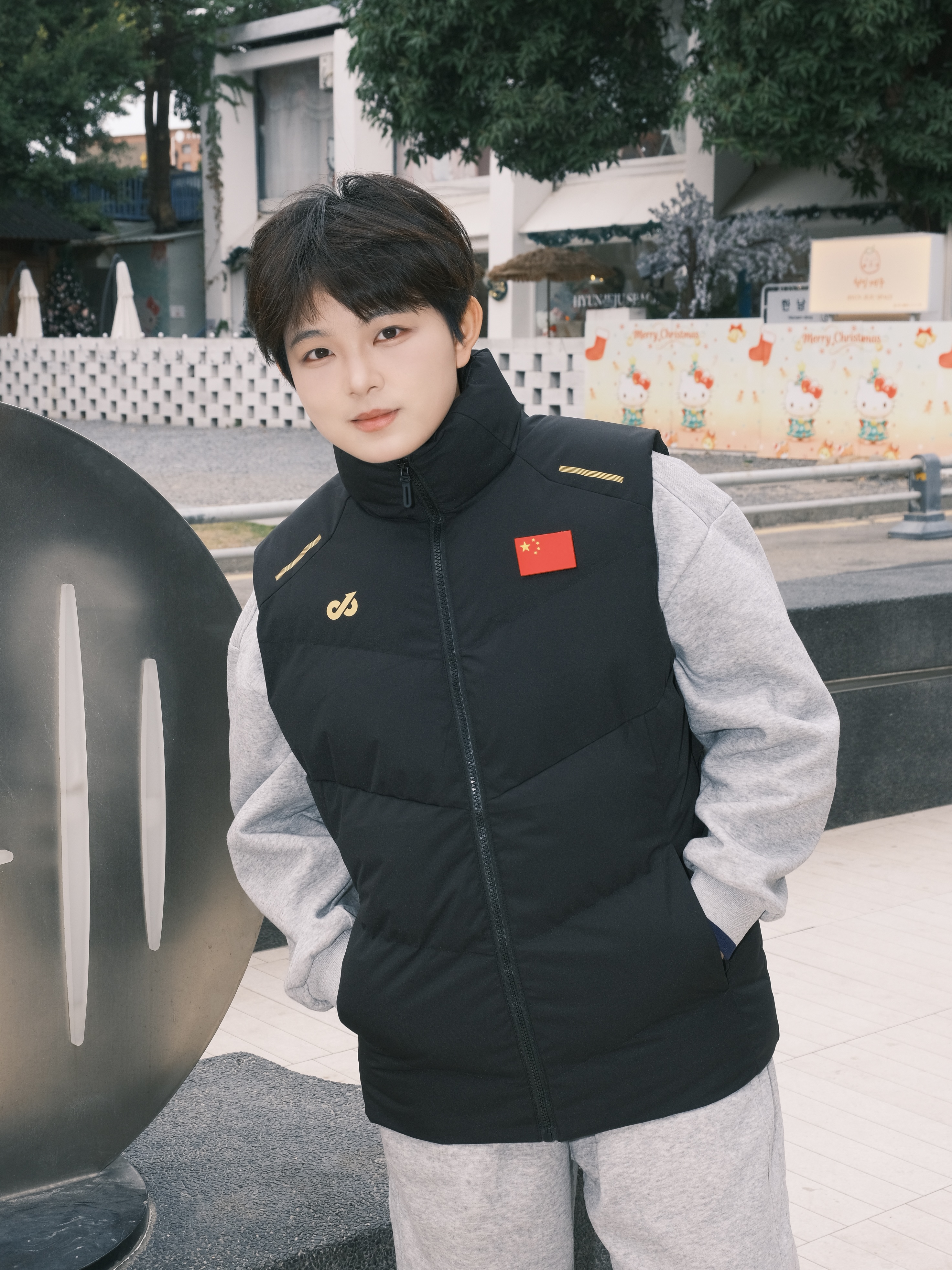✨ 降温不用裹成熊,一件马甲就够搭。 • 经典黑金配色马甲立住气场 国旗标+金属线条点缀,低调又有辨识度 • 内搭浅灰半拉链卫衣+同色系卫裤 软乎乎的质感自带松弛感,少年感直接拉满 • 脚上踩一双小白鞋 整套look干净利落,出街回头率稳了