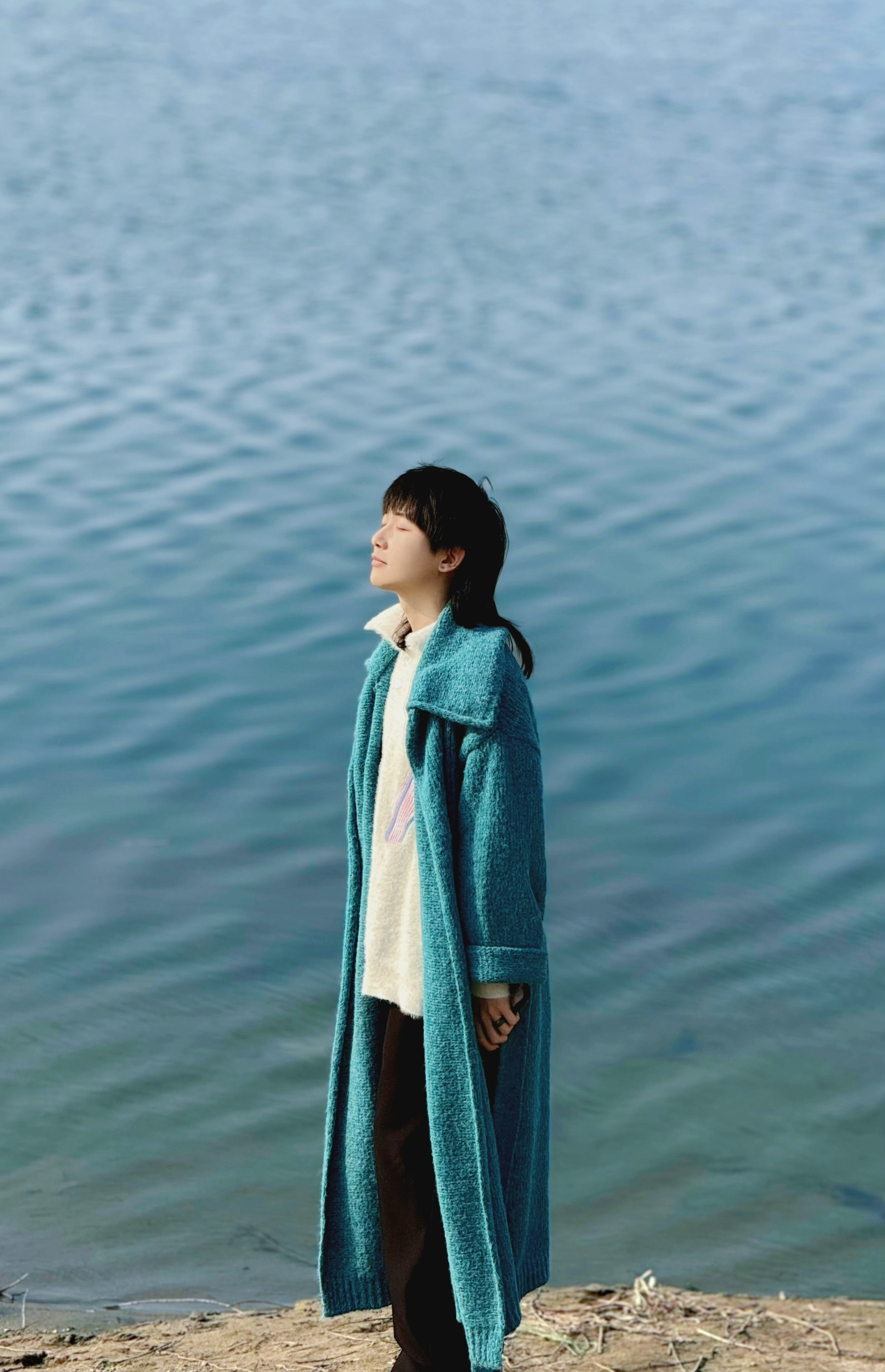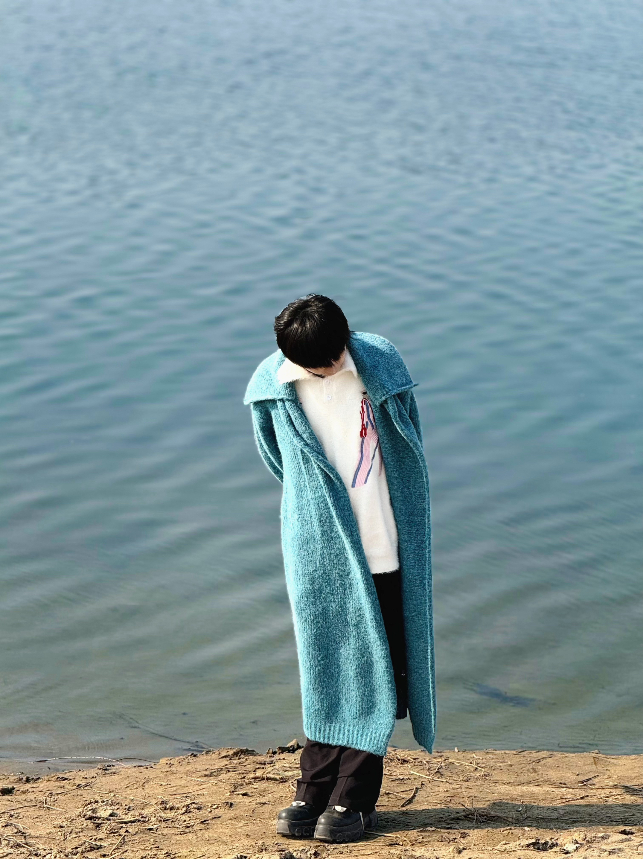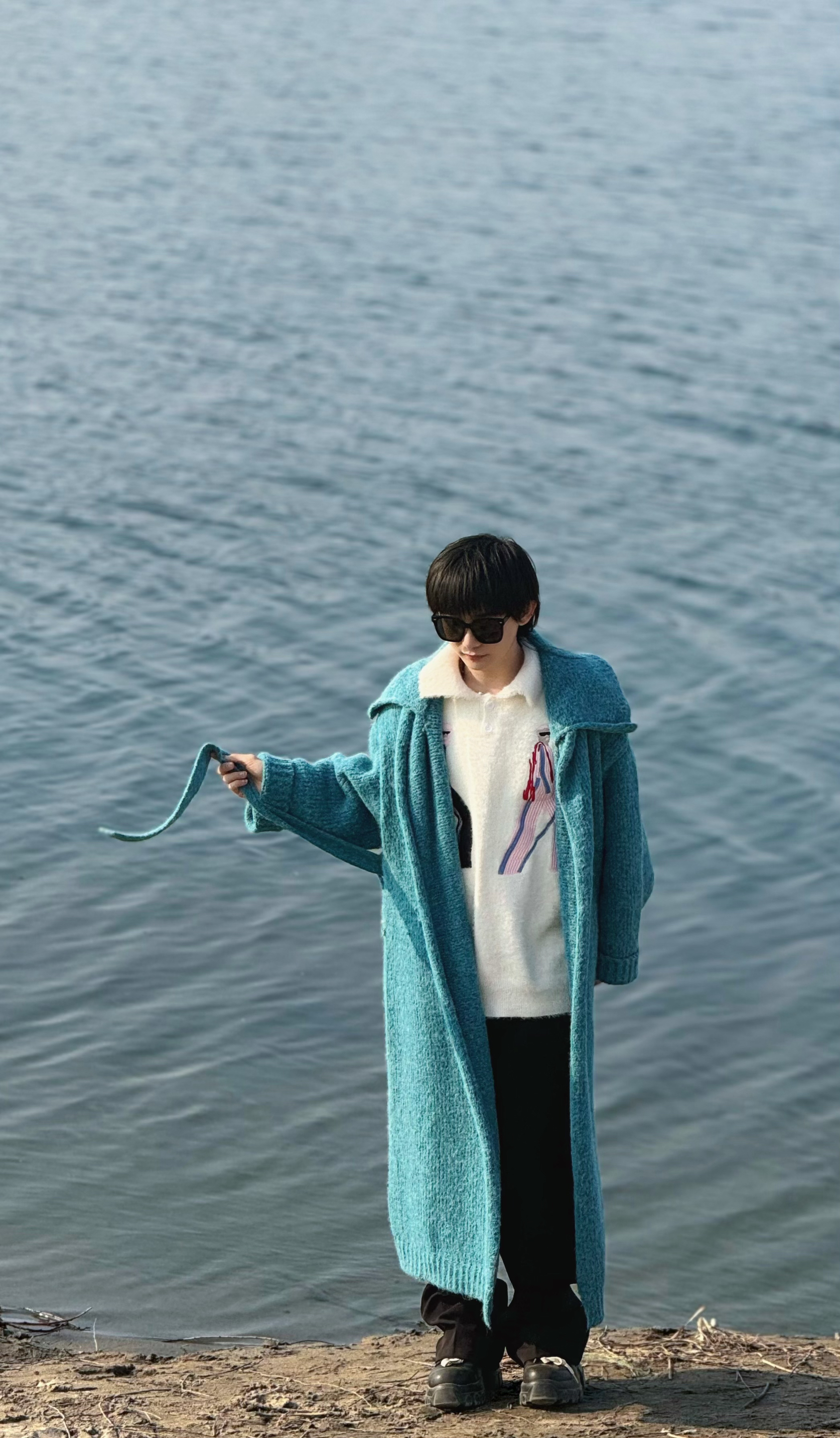 松石绿长款针织大衣是冬日的点睛之笔,软糯的毛绒内搭中和了大衣的硬朗,站在湖边任风拂过,慵懒的氛围感直接拉满。 把湖水的蓝揉进穿搭里,oversize的针织大衣自带随性气场,内搭的毛绒翻领衫添了几分软乎乎的温柔,冬日户外也能自在又有型。