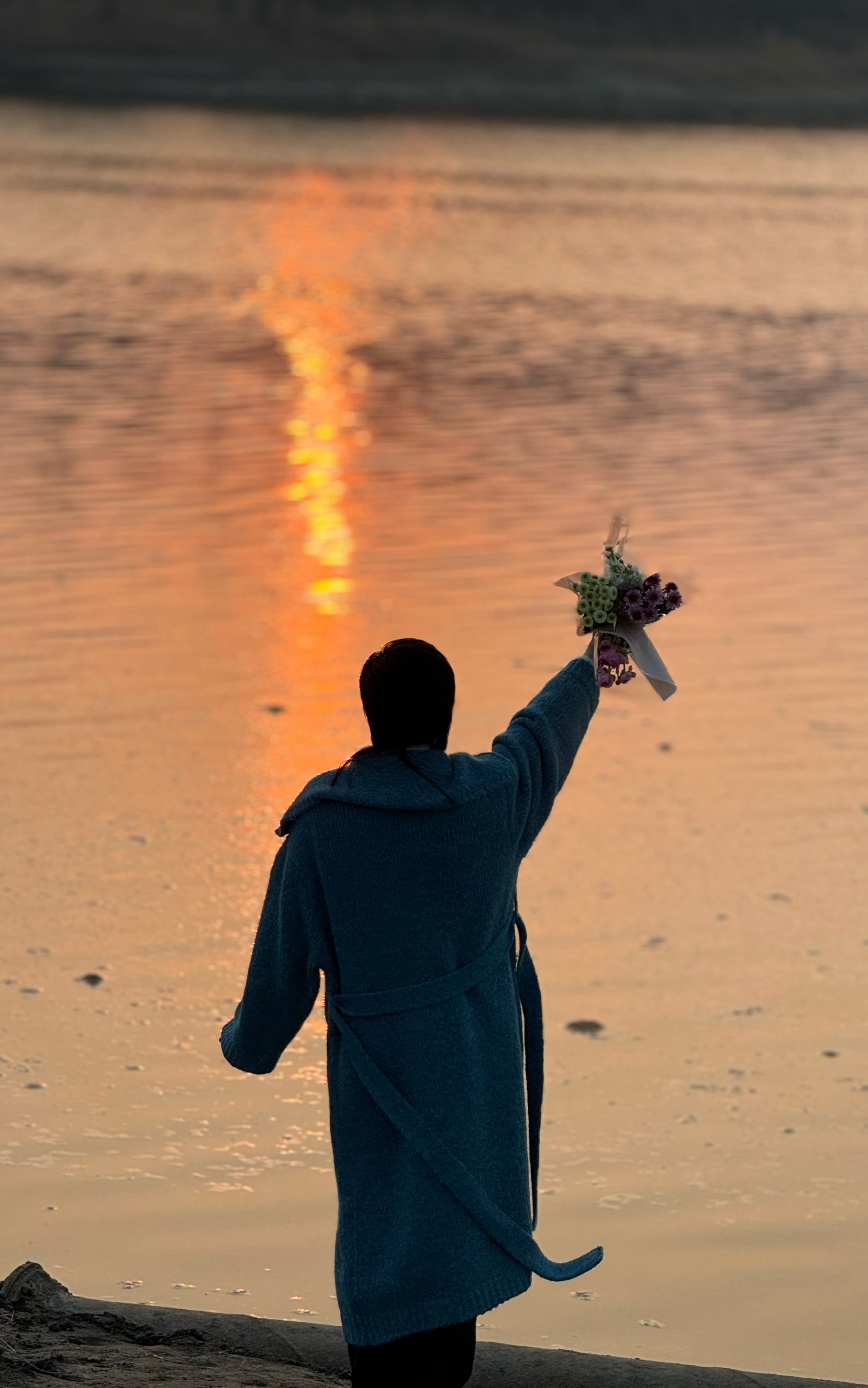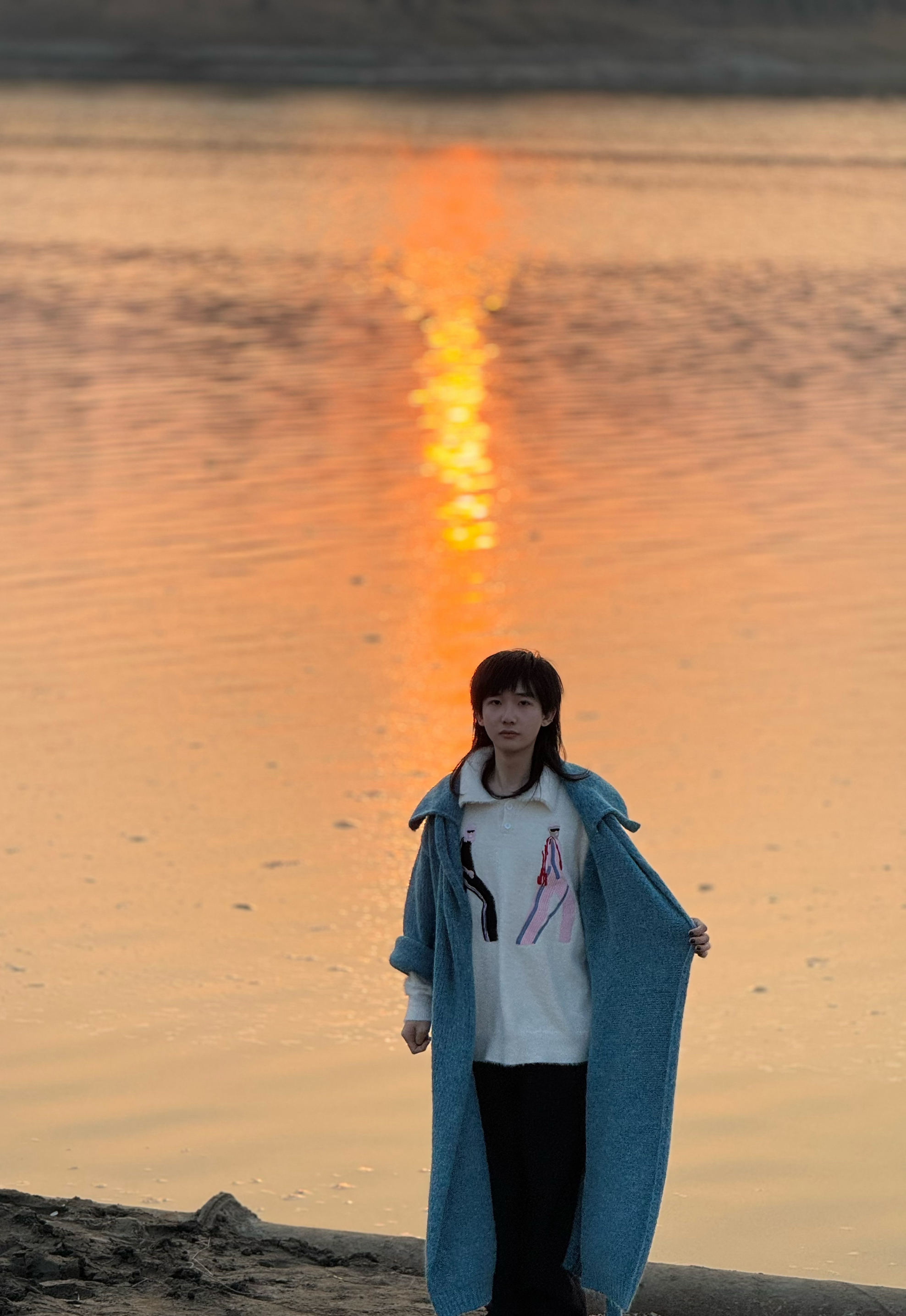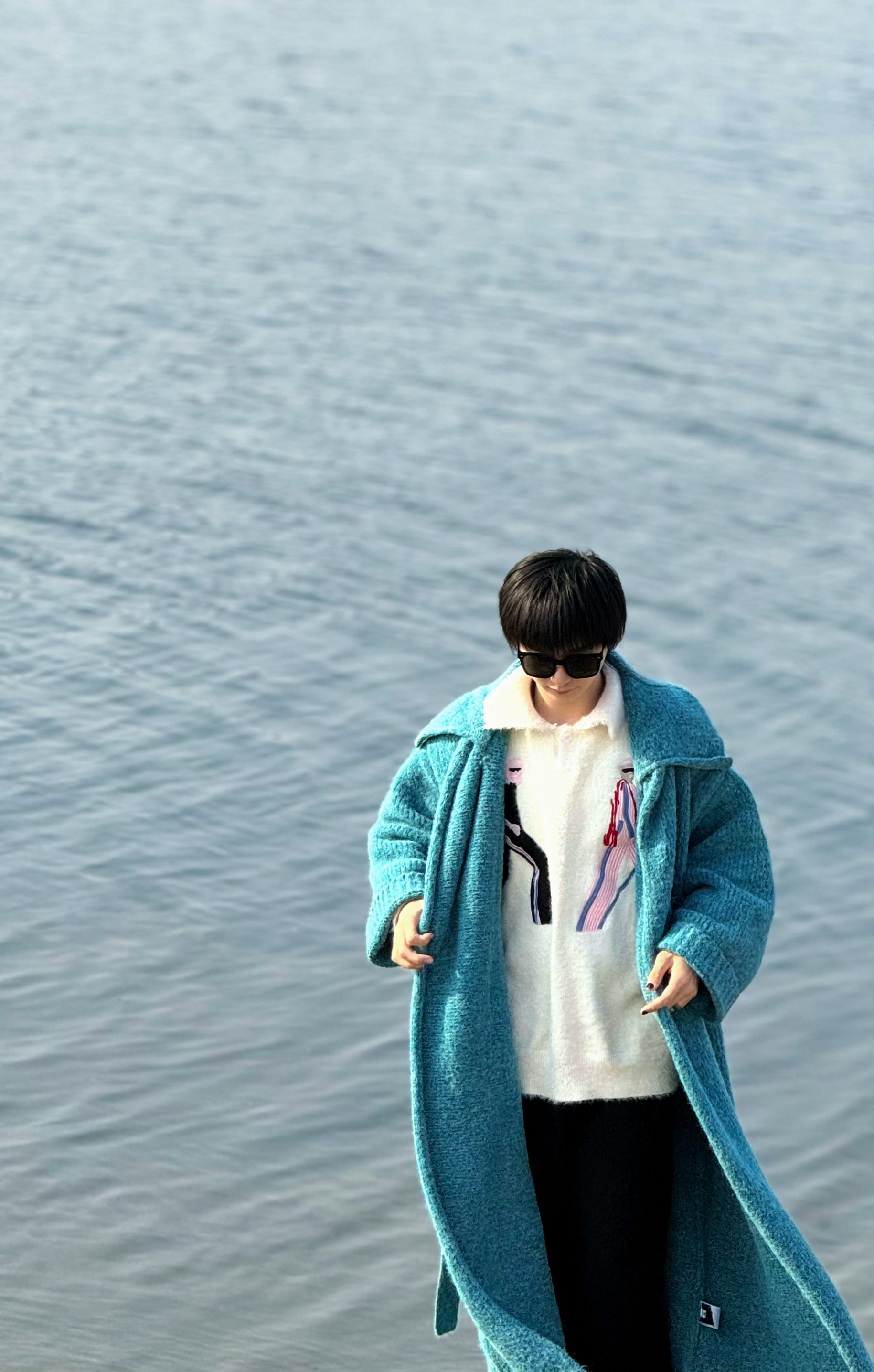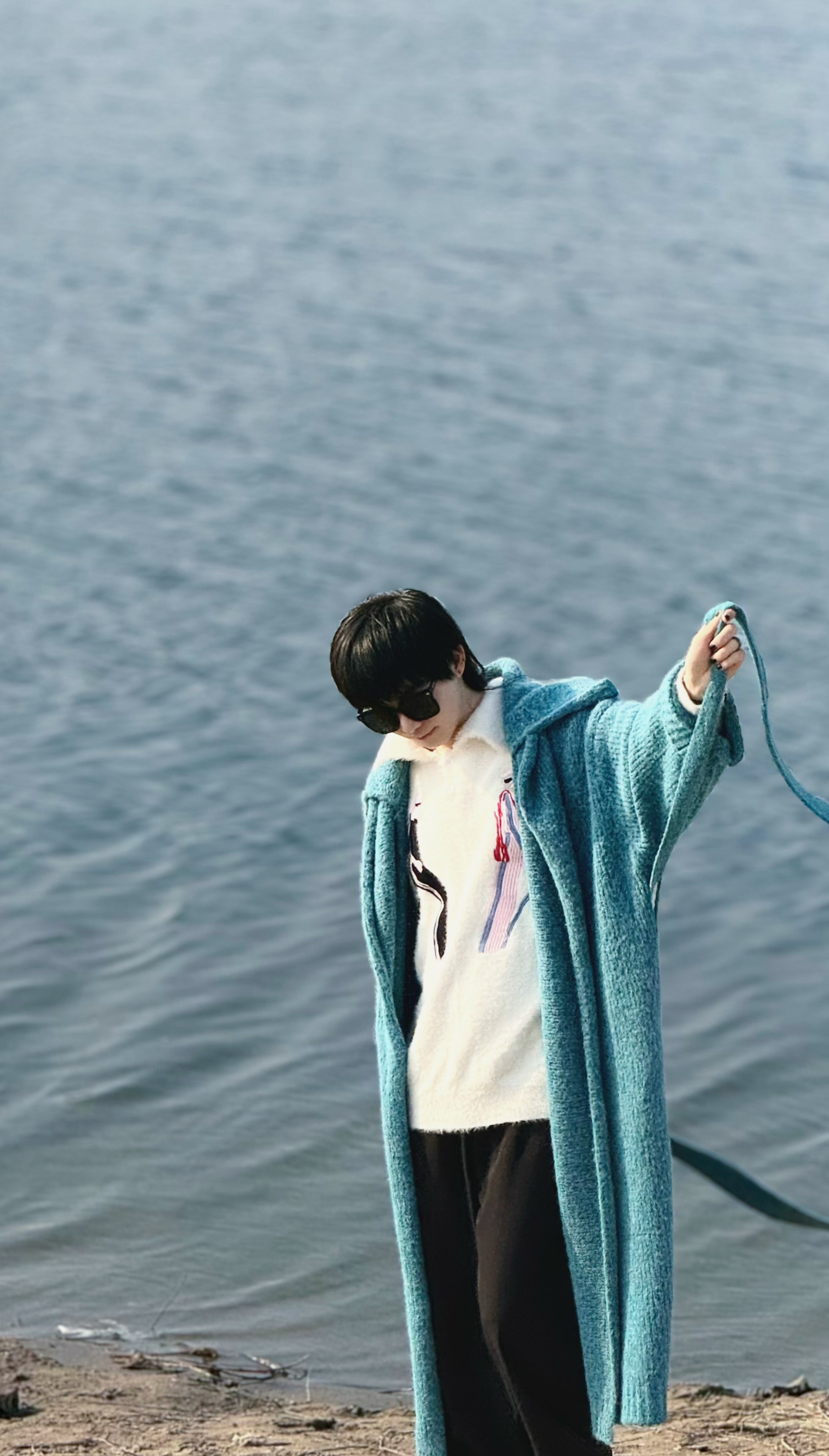 松石绿长款针织大衣是冬日的点睛之笔,软糯的毛绒内搭中和了大衣的硬朗,站在湖边任风拂过,慵懒的氛围感直接拉满。 把湖水的蓝揉进穿搭里,oversize的针织大衣自带随性气场,内搭的毛绒翻领衫添了几分软乎乎的温柔,冬日户外也能自在又有型。