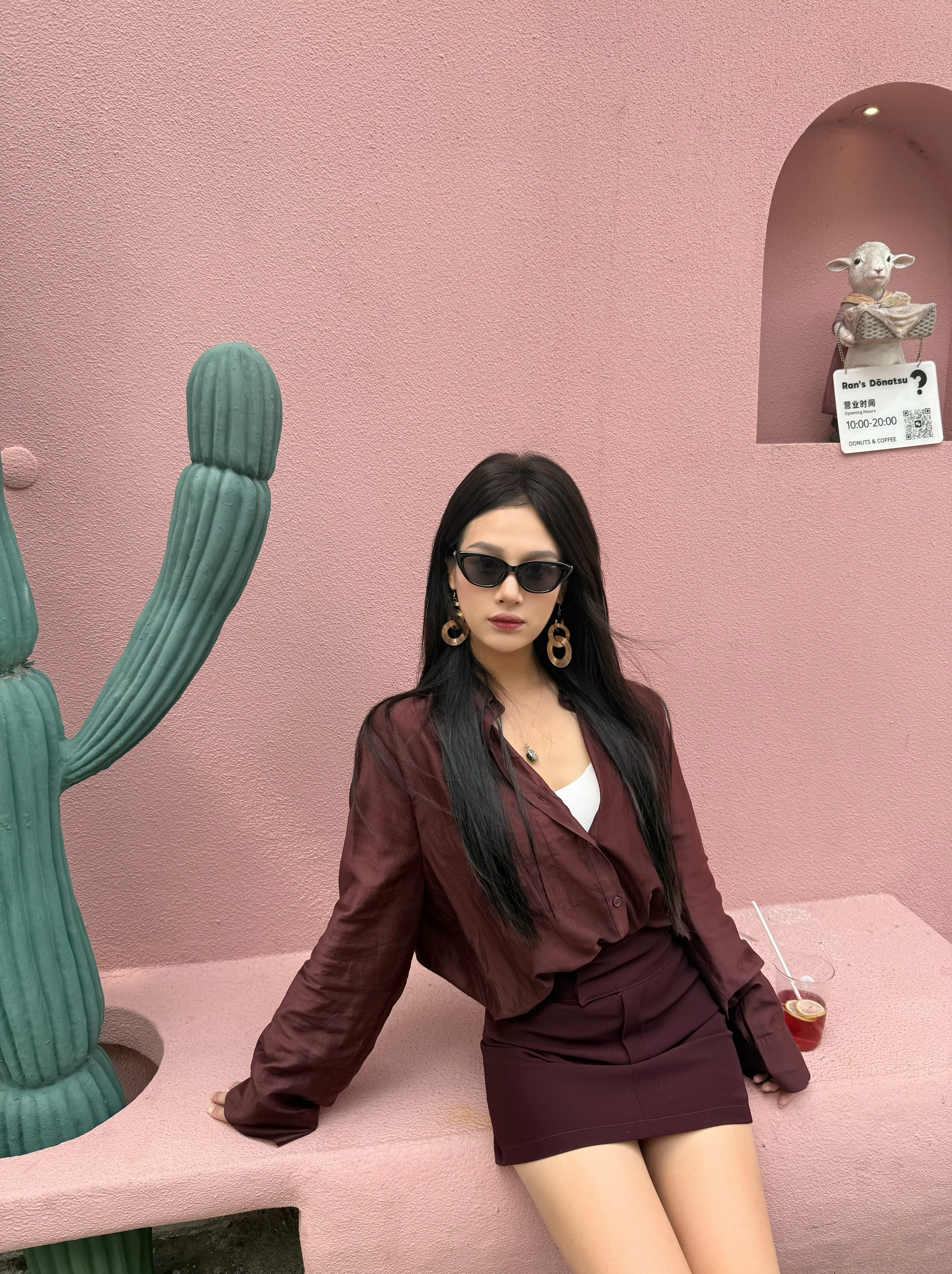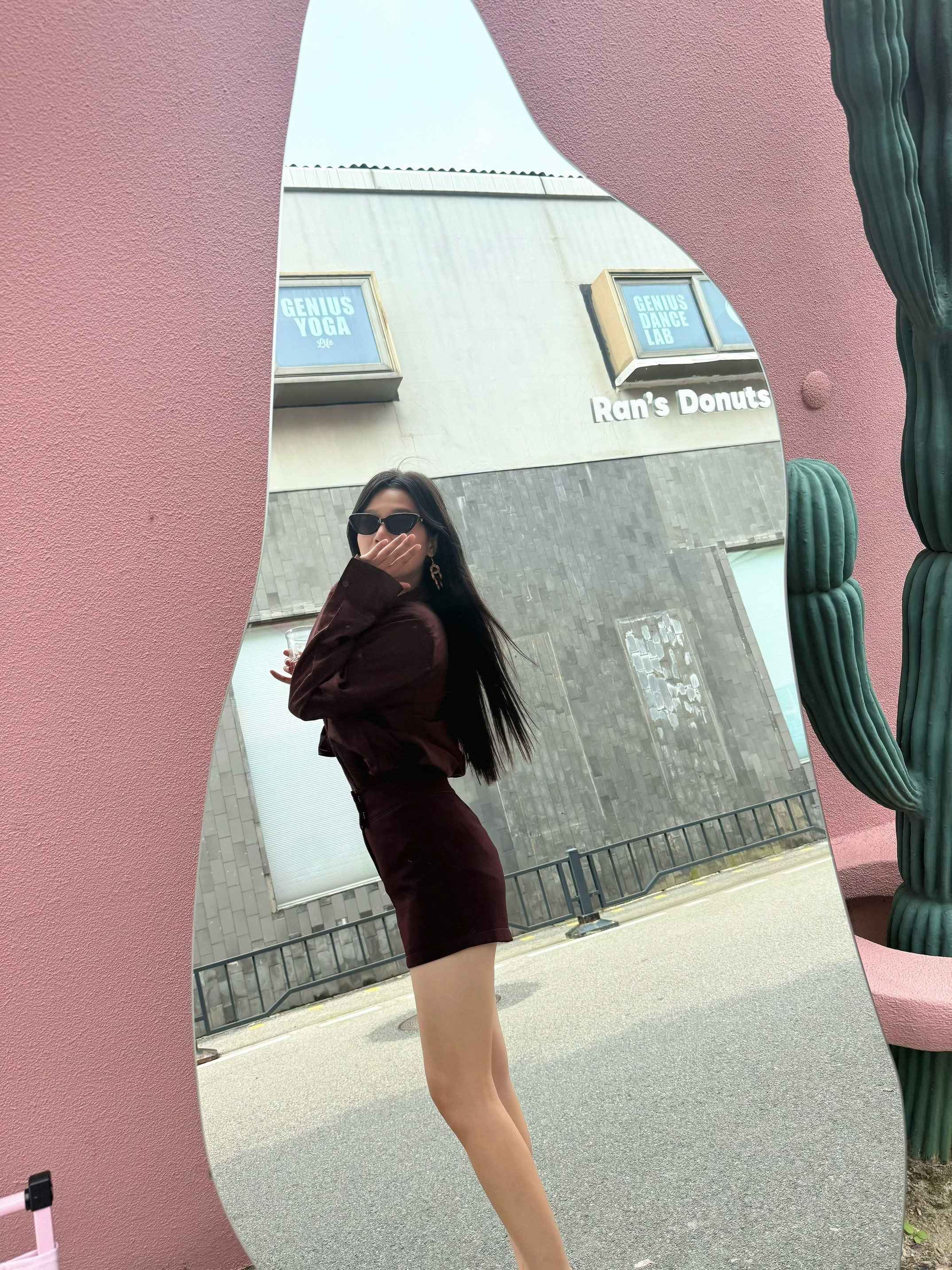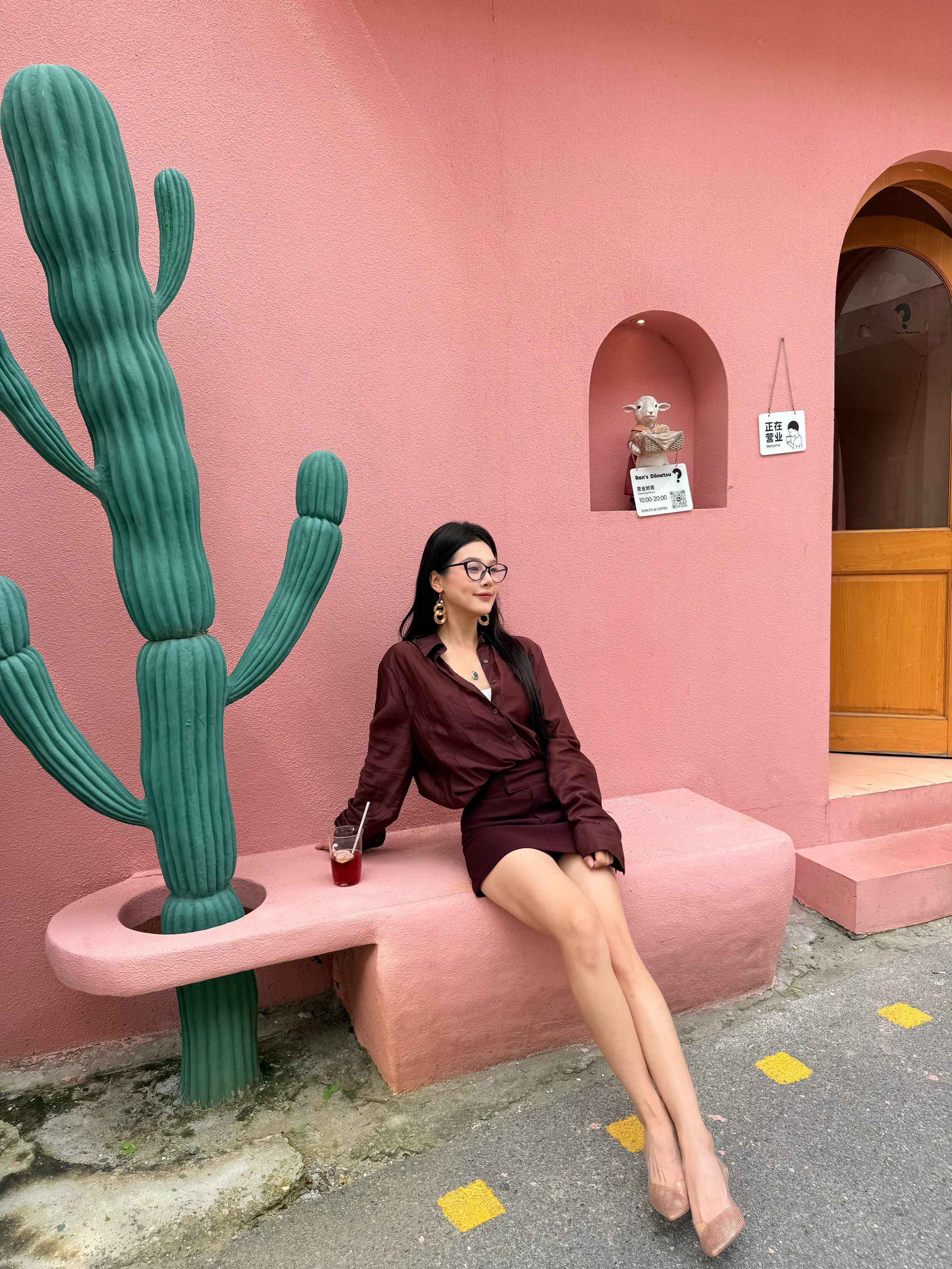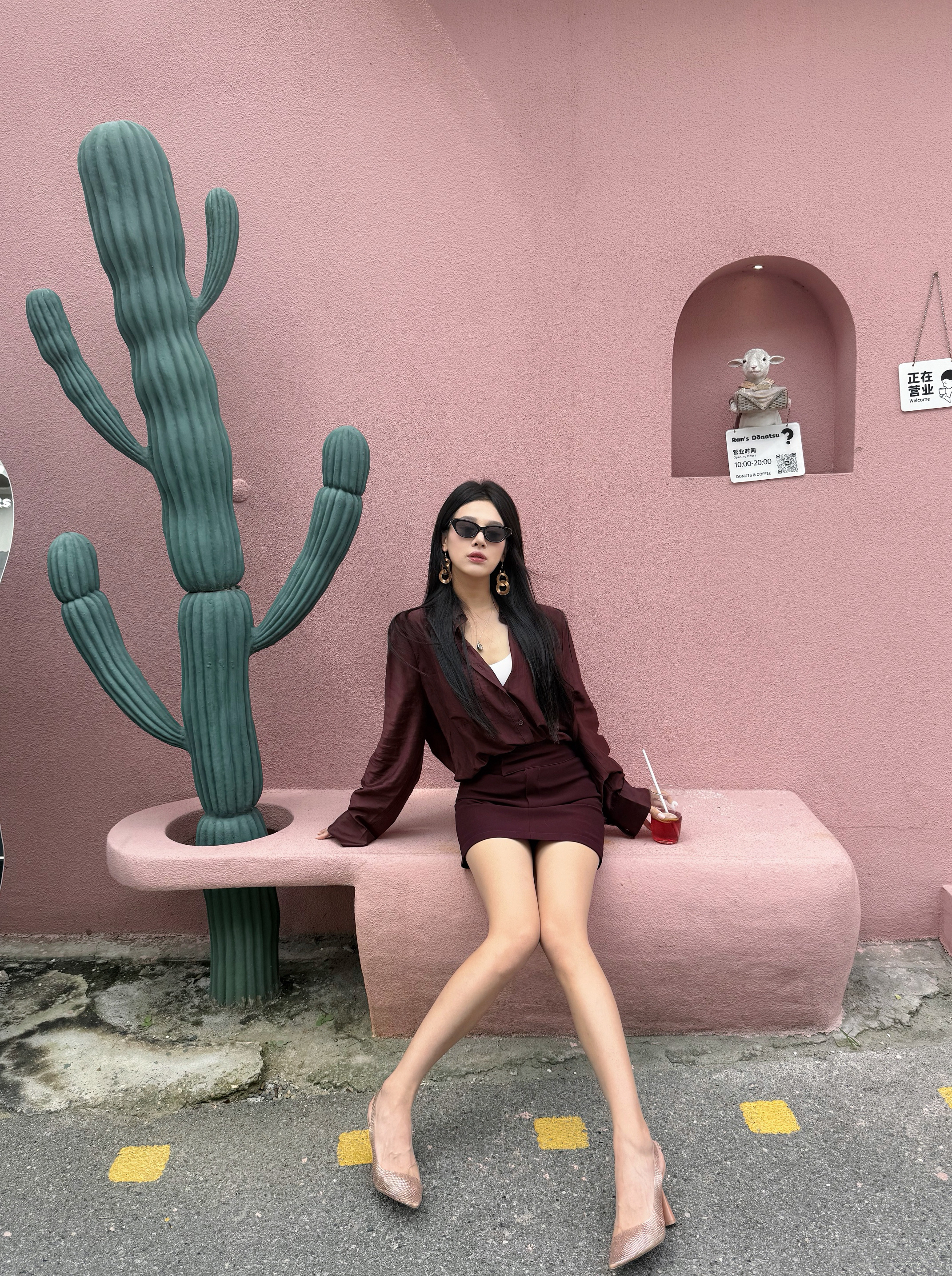 周末出门和朋友citywalk,随手搭的一身意外出片! 这件深缎面红棕西装裙真的是懒人福音,自带收腰剪裁,不用费心搭配就能把身材比例拉得很好。面料滑滑的,贴肤穿也舒服,垂感刚好,坐下的时候不会皱成一团。 我内搭了一件白色小吊带,增加一点层次感,不会让深色显得太沉闷。脚上配了裸色高跟鞋,视觉上直接把腿长又延伸了一截,和裙子的成熟感也很搭。 拍照的时候特意选了这个粉墙仙人掌的角落,复古红棕和粉色意外地...