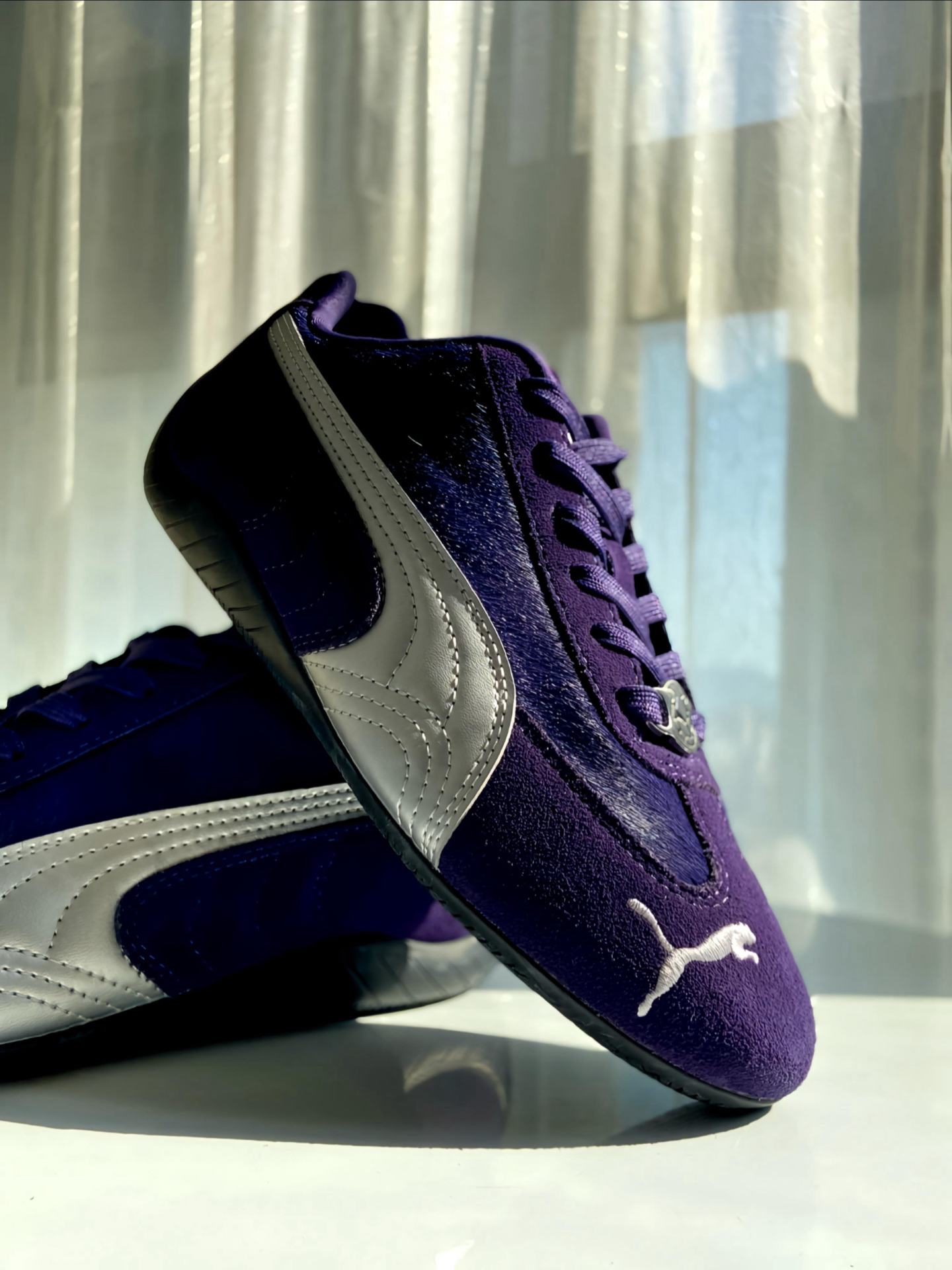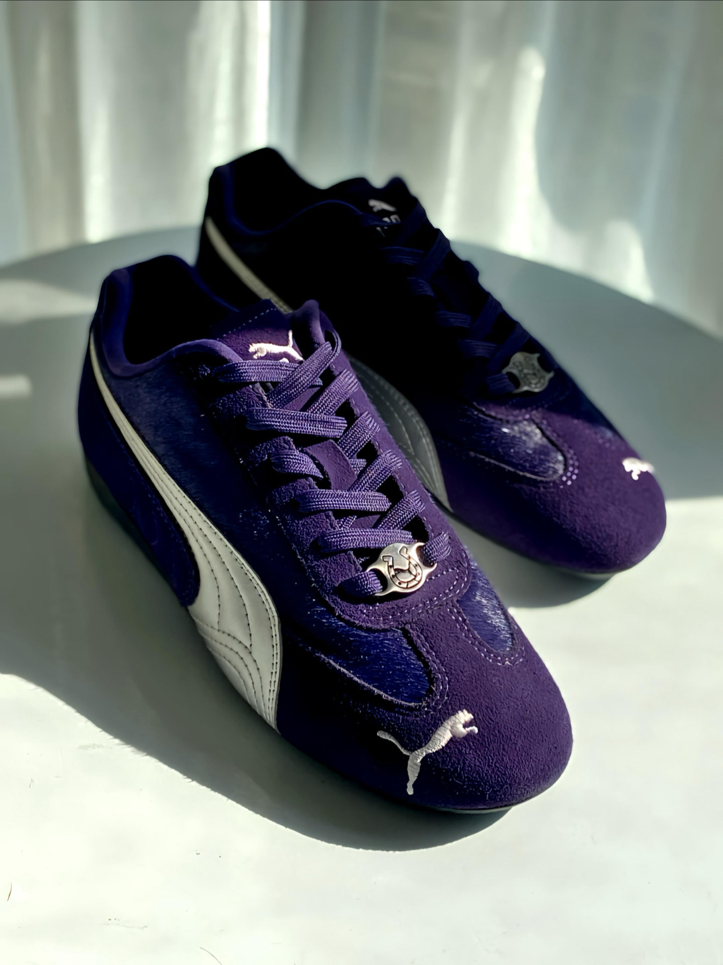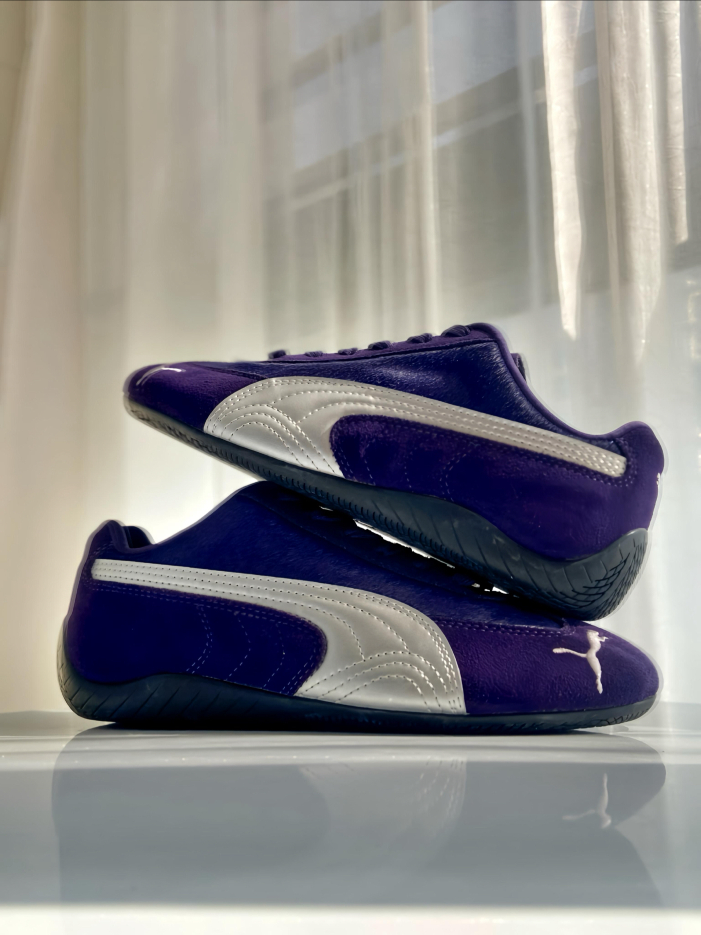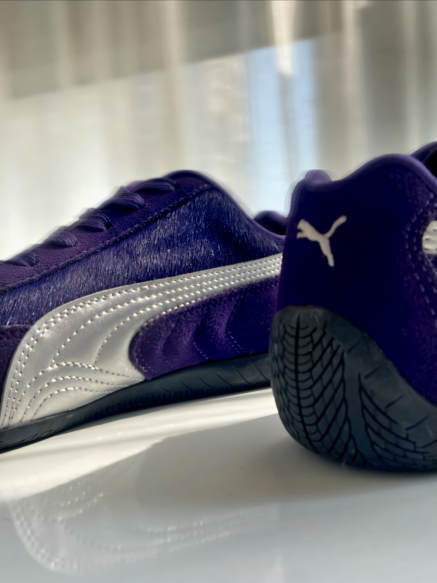 是 #PUMA Speedcat 赛车鞋啊,马年限定 💜 整双鞋以紫色鞋面搭配银色 LOGO 为主 ,我觉得整体色调把握得很到位,不艳不闷还显质感,麂皮拼接的材质我摸着手感超舒服,细节做工一点不糊弄。 鞋舌马蹄鞋扣和鞋面的马毛细节,精准呼应马年主题,新年穿它再合适不过啦。上脚贴合脚型还显利落,搭牛仔裤、休闲裤都超适配,日常通勤出街都是 ok 滴,鞋码也标准,不过鞋型比较瘦窄,脚宽或者高脚背建议...