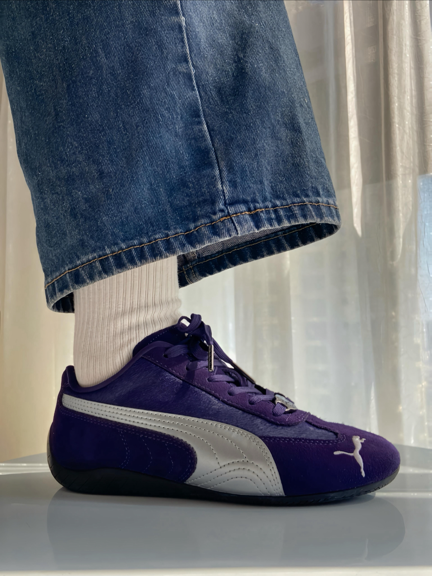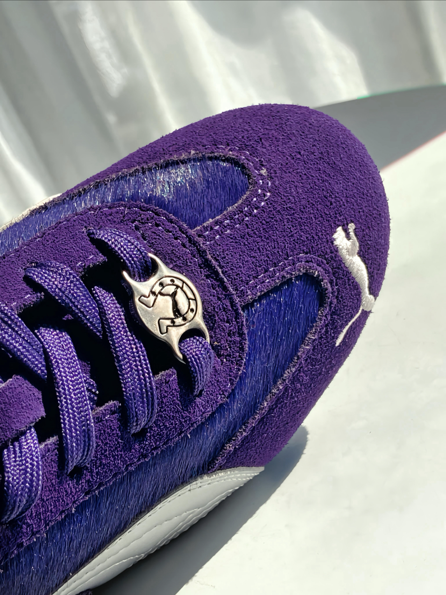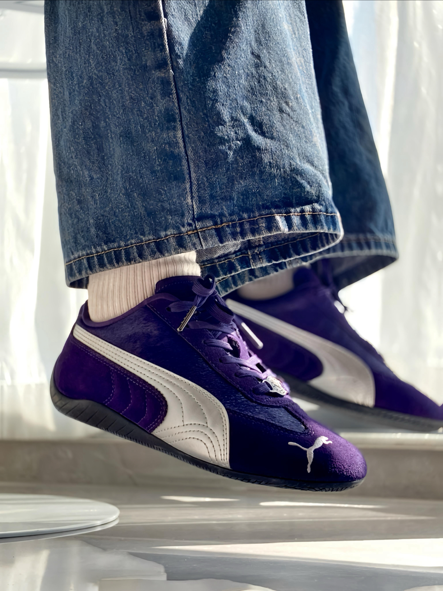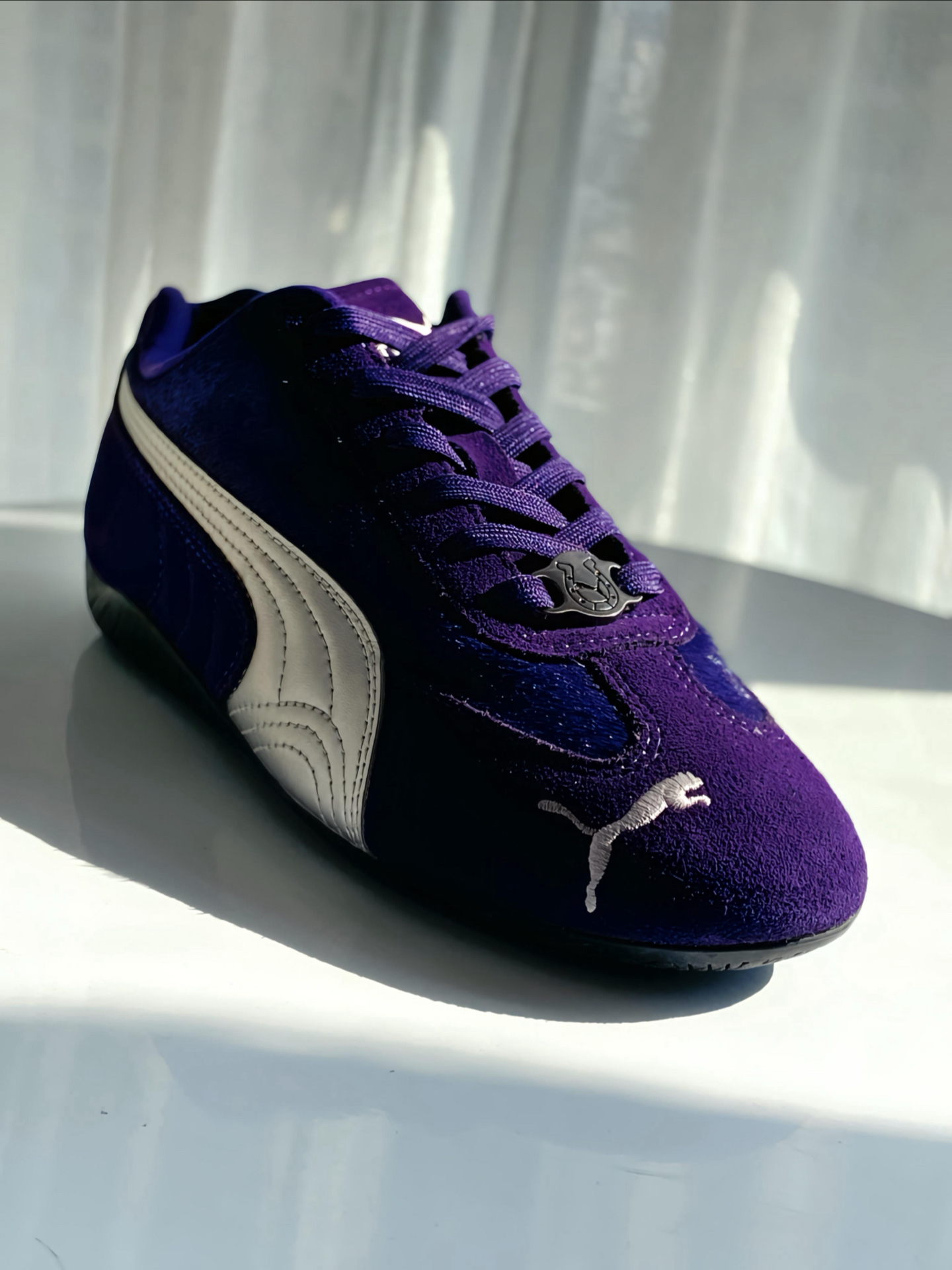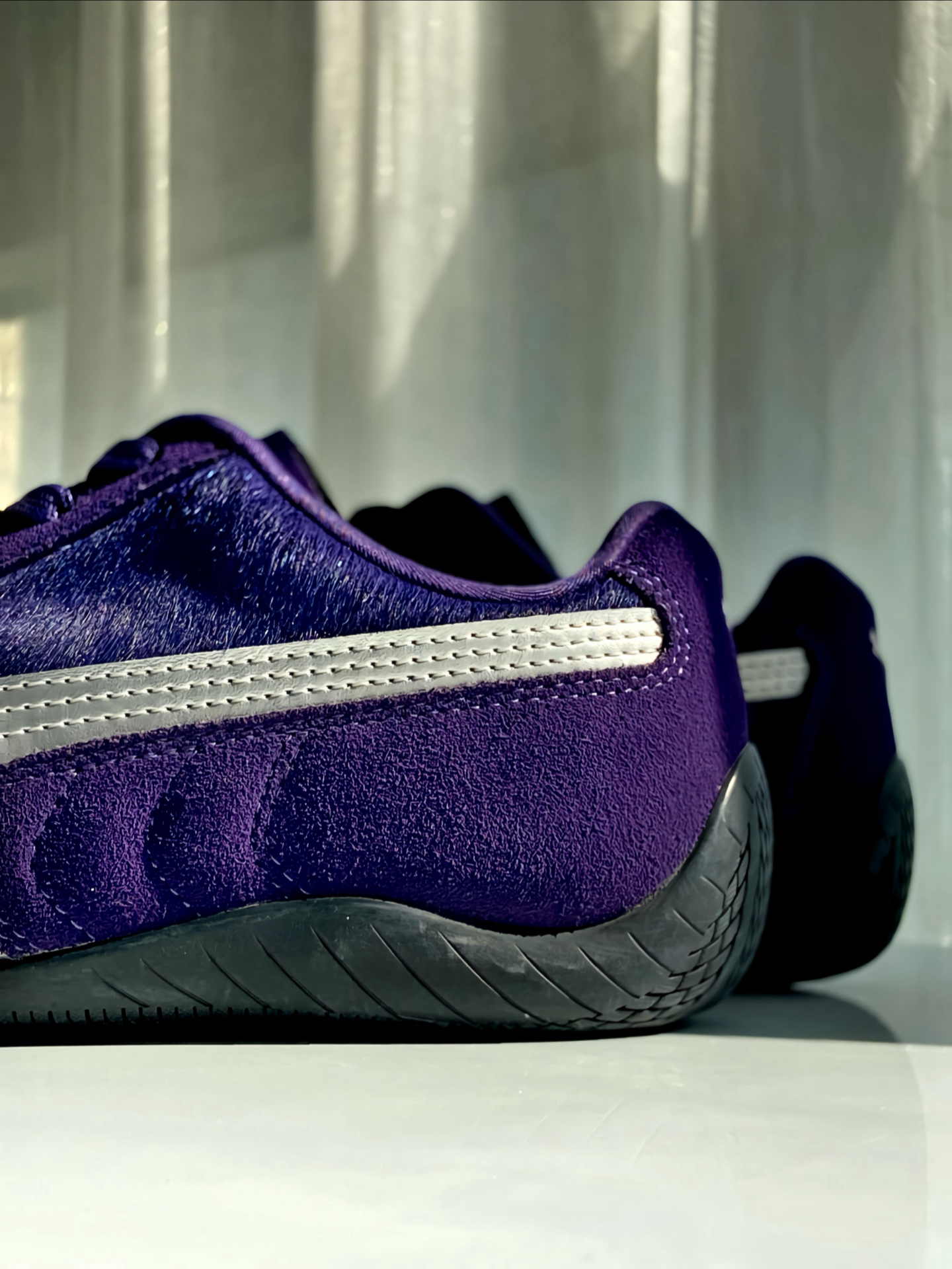是 #PUMA Speedcat 赛车鞋啊,马年限定 💜 整双鞋以紫色鞋面搭配银色 LOGO 为主 ,我觉得整体色调把握得很到位,不艳不闷还显质感,麂皮拼接的材质我摸着手感超舒服,细节做工一点不糊弄。 鞋舌马蹄鞋扣和鞋面的马毛细节,精准呼应马年主题,新年穿它再合适不过啦。上脚贴合脚型还显利落,搭牛仔裤、休闲裤都超适配,日常通勤出街都是 ok 滴,鞋码也标准,不过鞋型比较瘦窄,脚宽或者高脚背建议...
