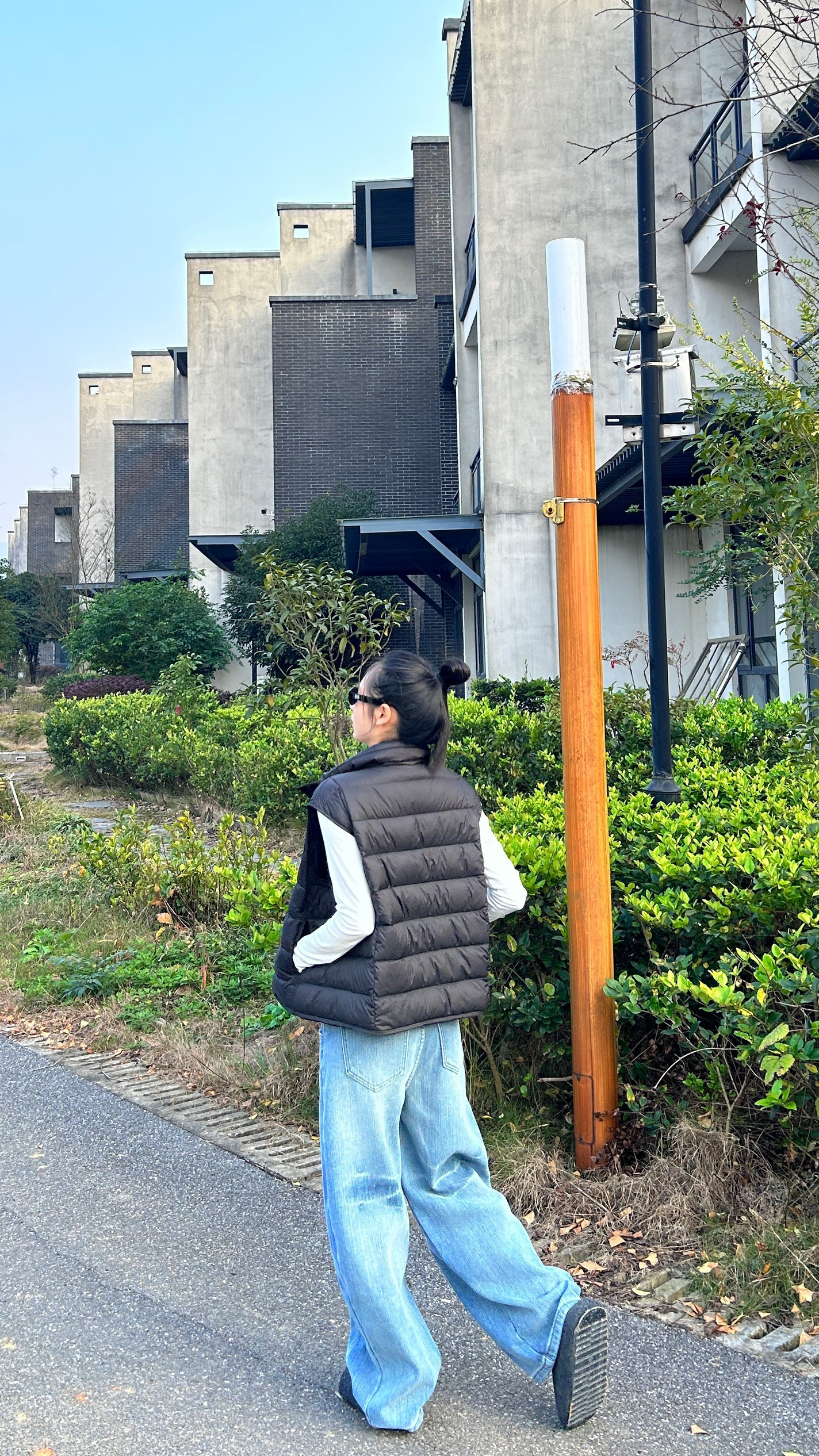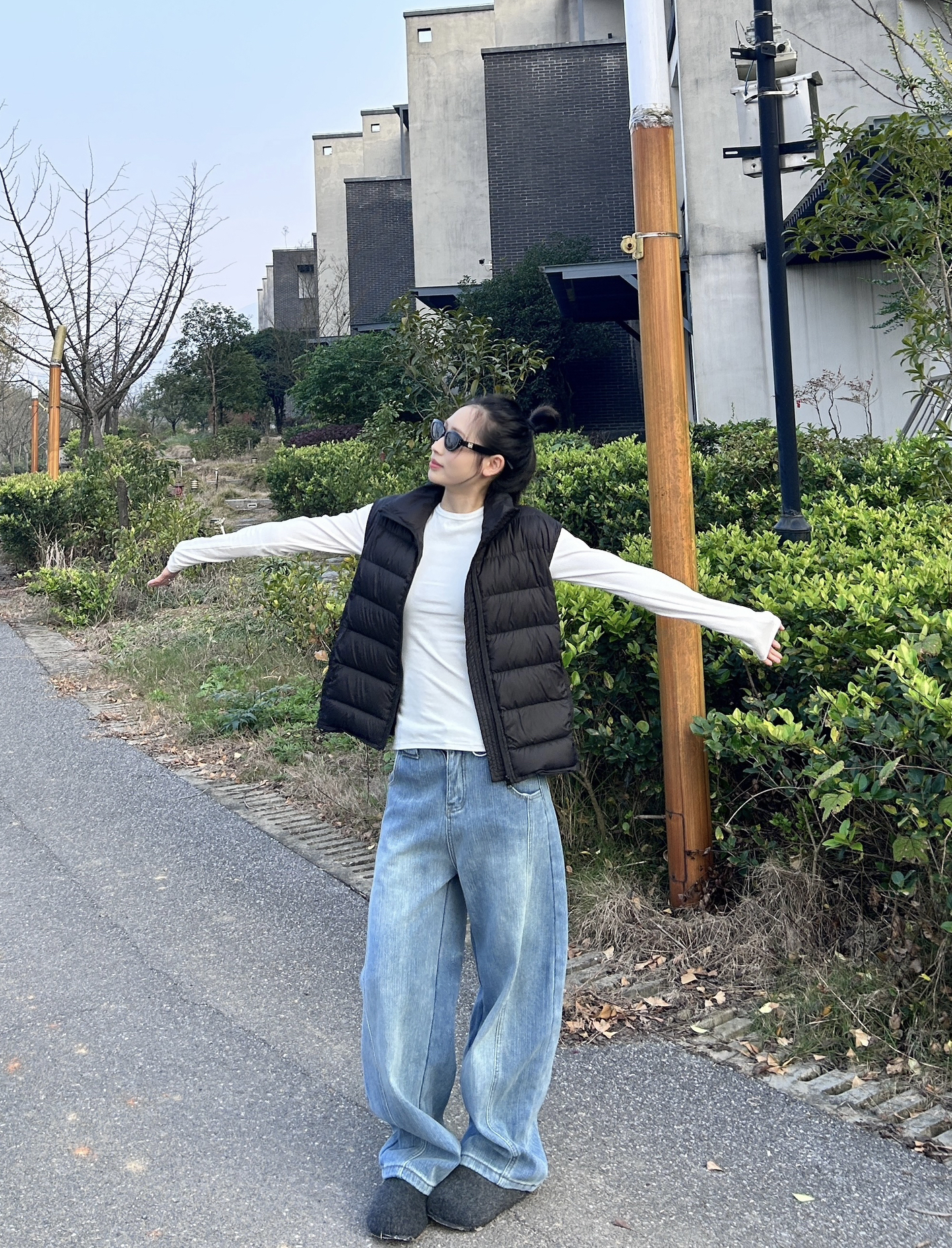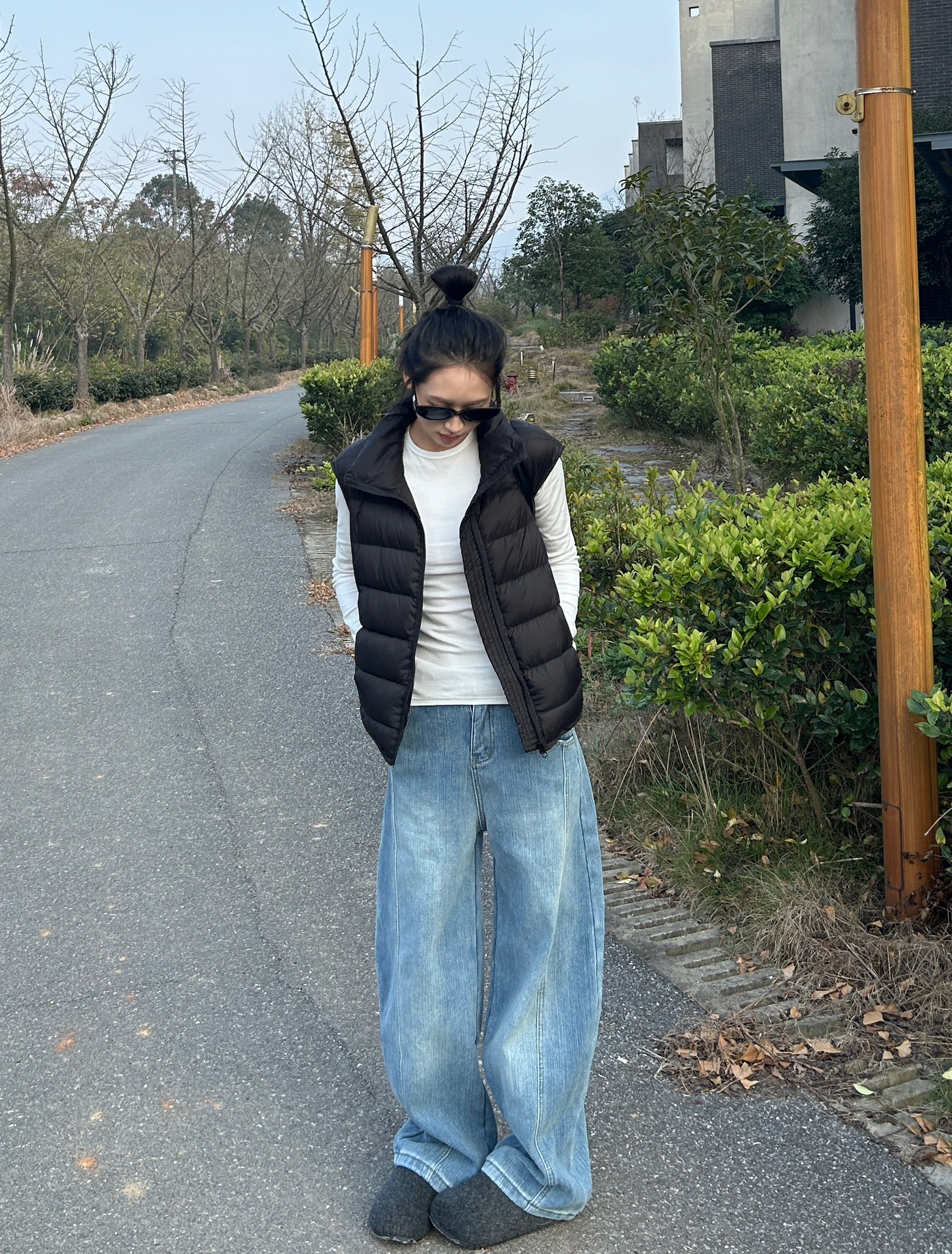 黑色羽绒马甲搭白打底是永不出错的组合,浅蓝阔腿牛仔为整套穿搭注入休闲感,黑背包与毛毛拖的细节呼应,走在街头随手拍,都是随性的画报质感~