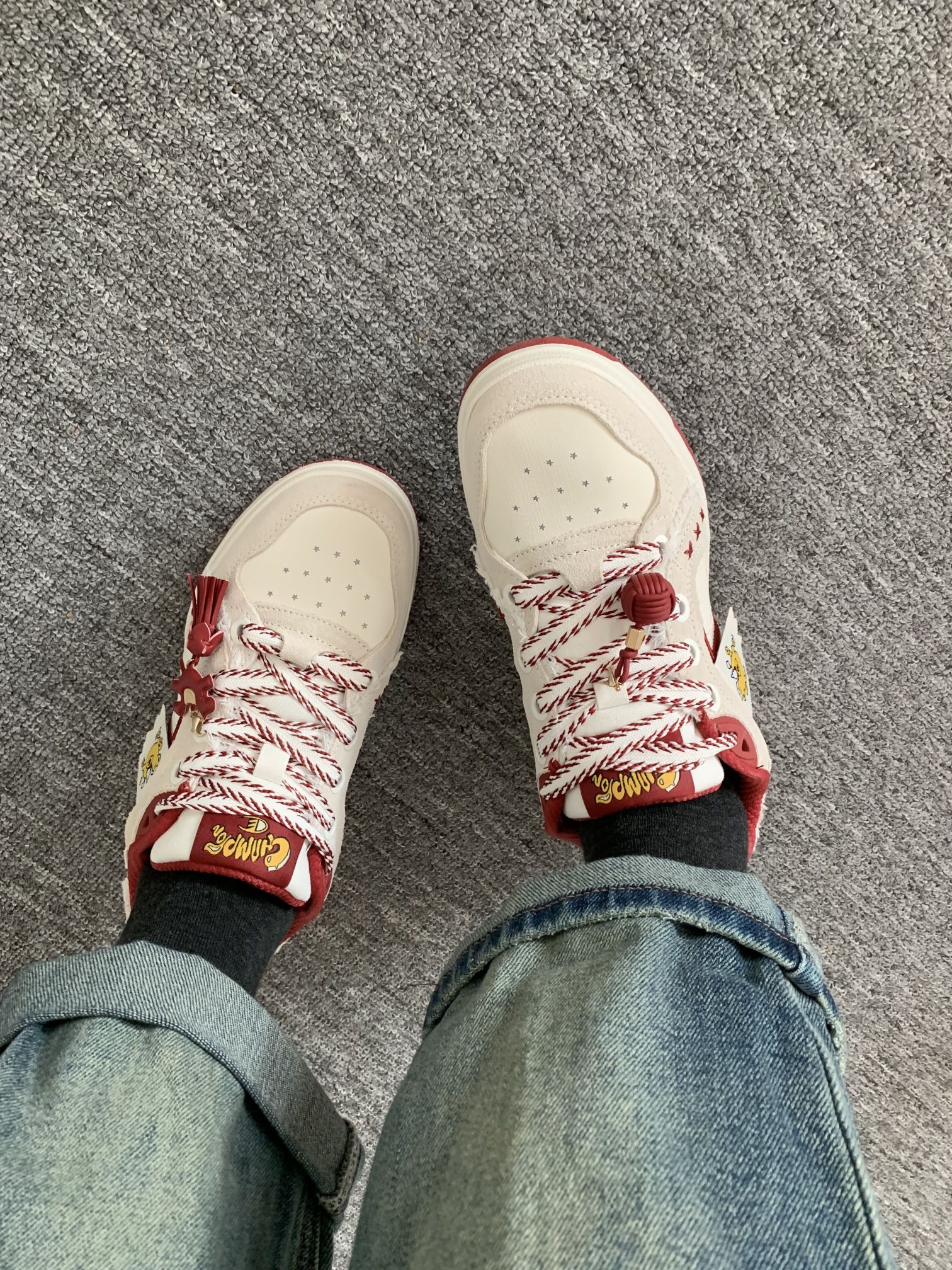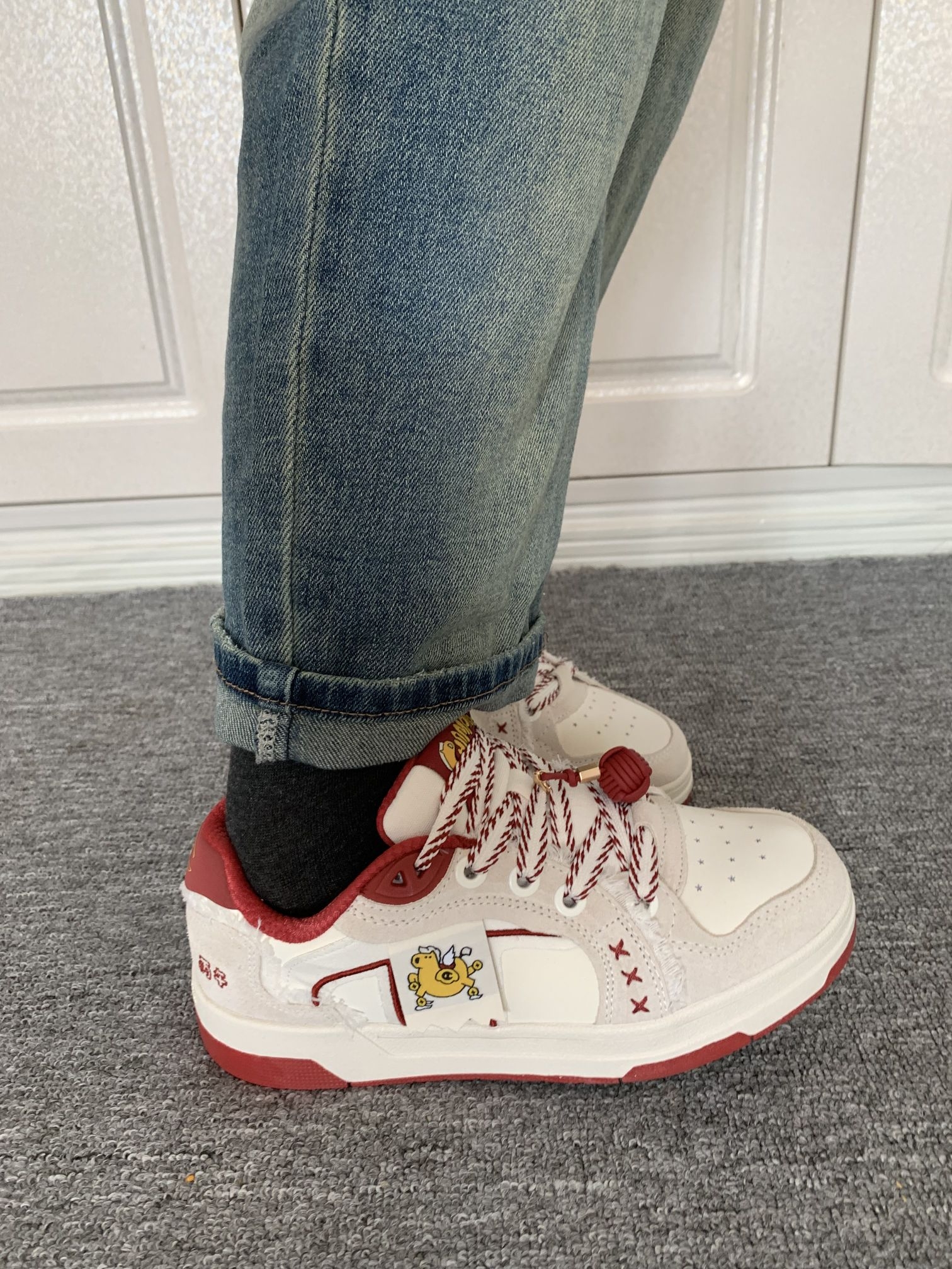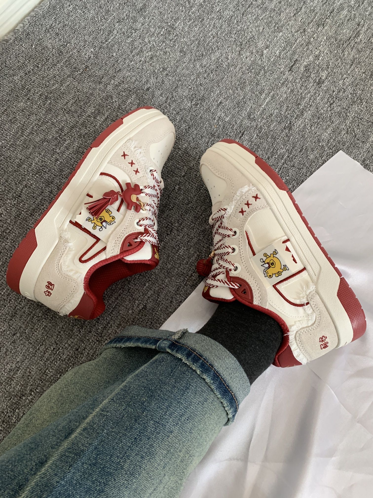 冠军马年又出新款咯 就是这双飘带板鞋 颜色是白红的配色,是马年的专属配色 寓意是马上有钱哦😁 侧面是五角星★设计 中式元素满满~ 鞋子是皮质+翻毛皮拼接设计的好有层次感 鞋带上还有两个中国传统元素的小吊坠可拆卸 好喜欢介双新年鞋子 新年无论是穿着走街访友还是送朋友都是蛮不错的选择 鞋子上脚好看还舒服我喜欢搭配牛仔裤穿 尺码合适正常选就行哈