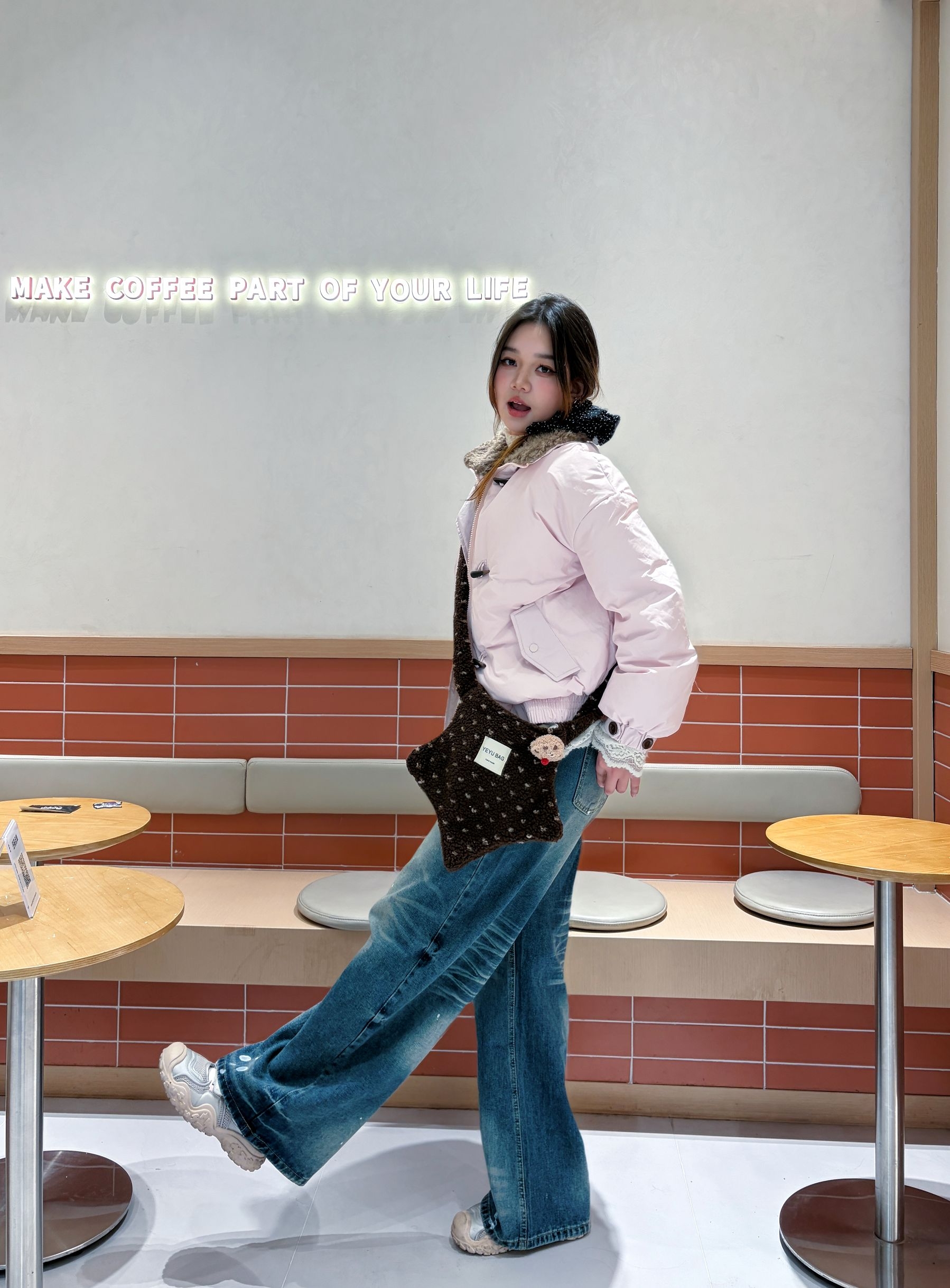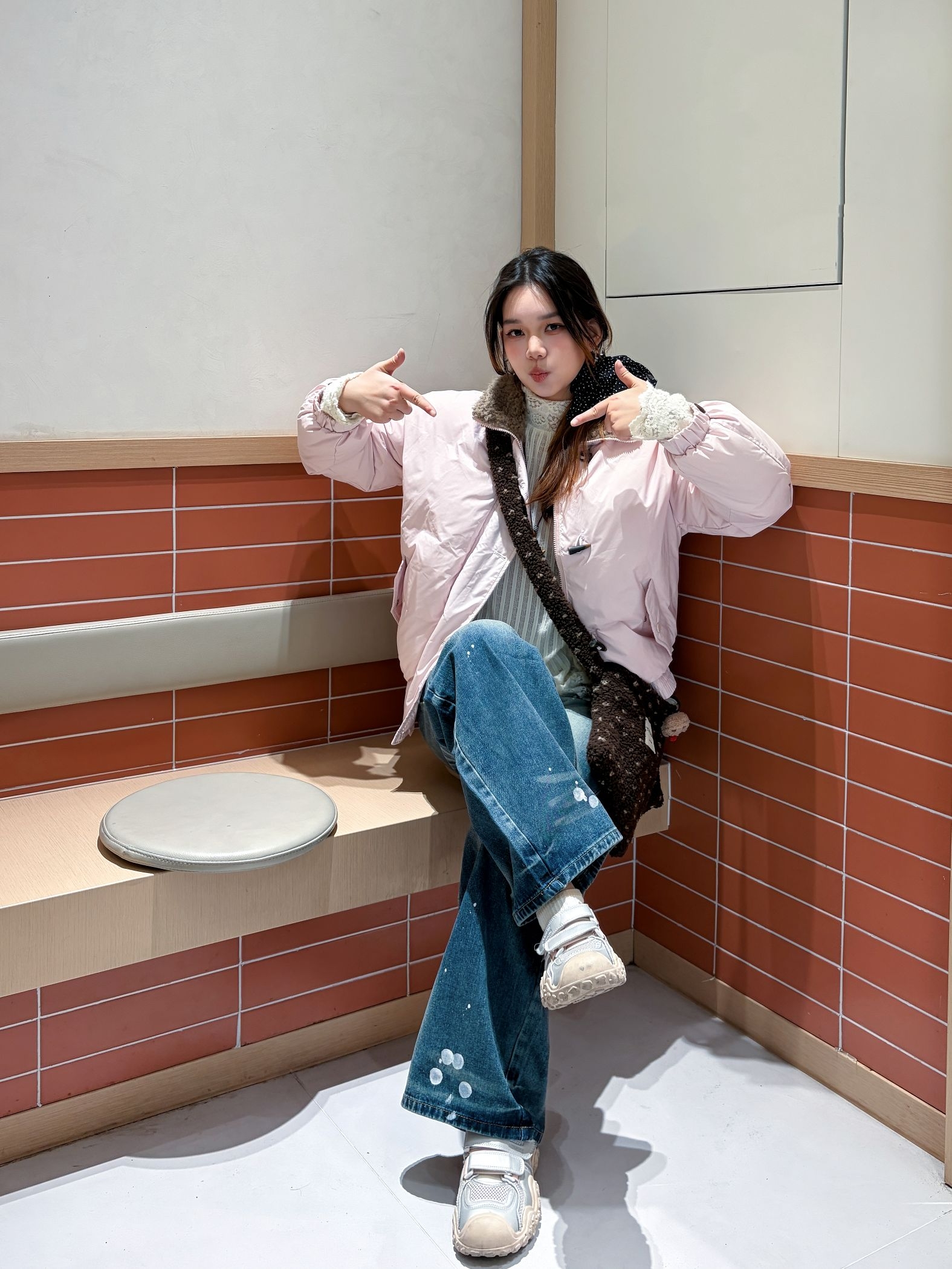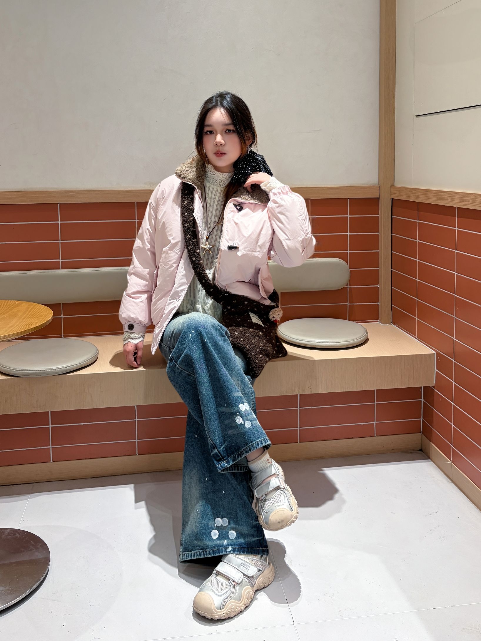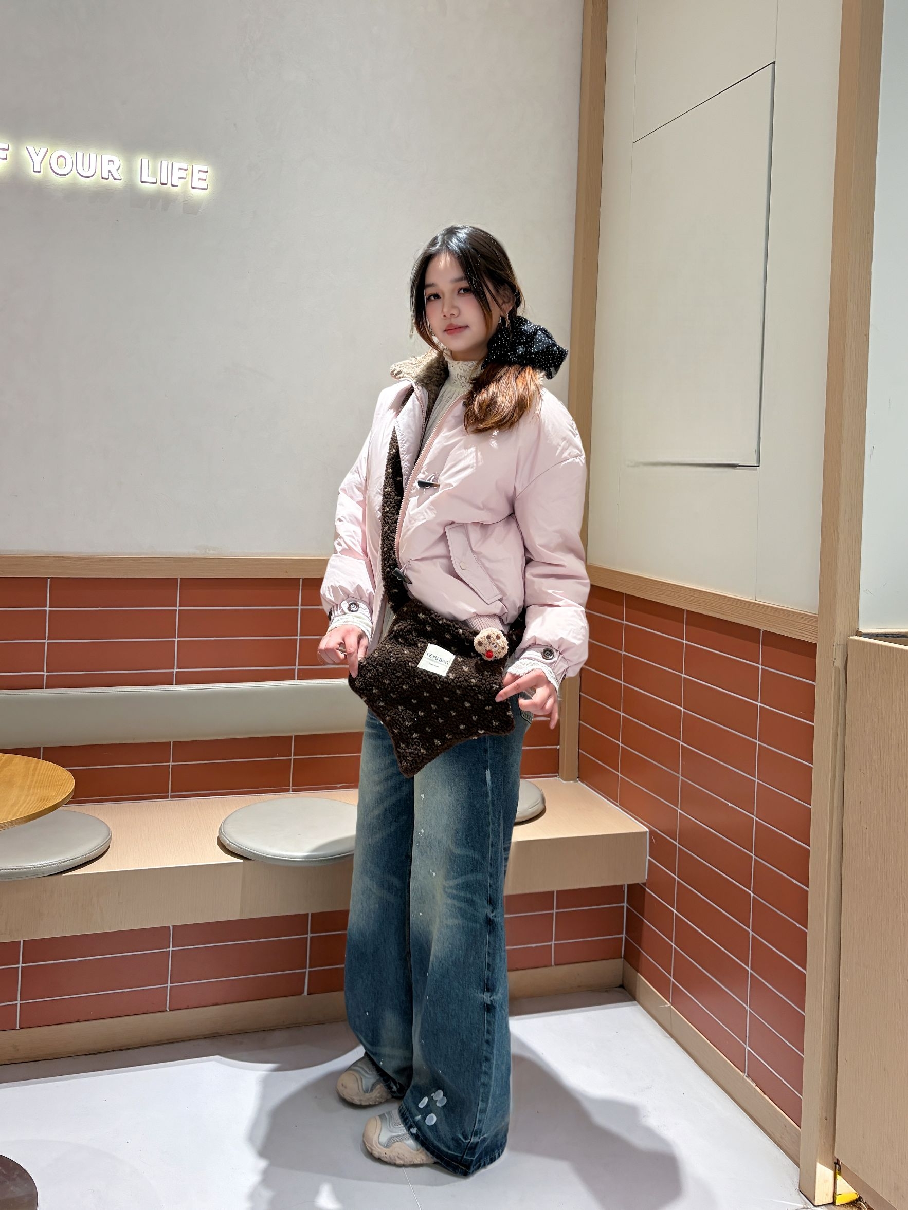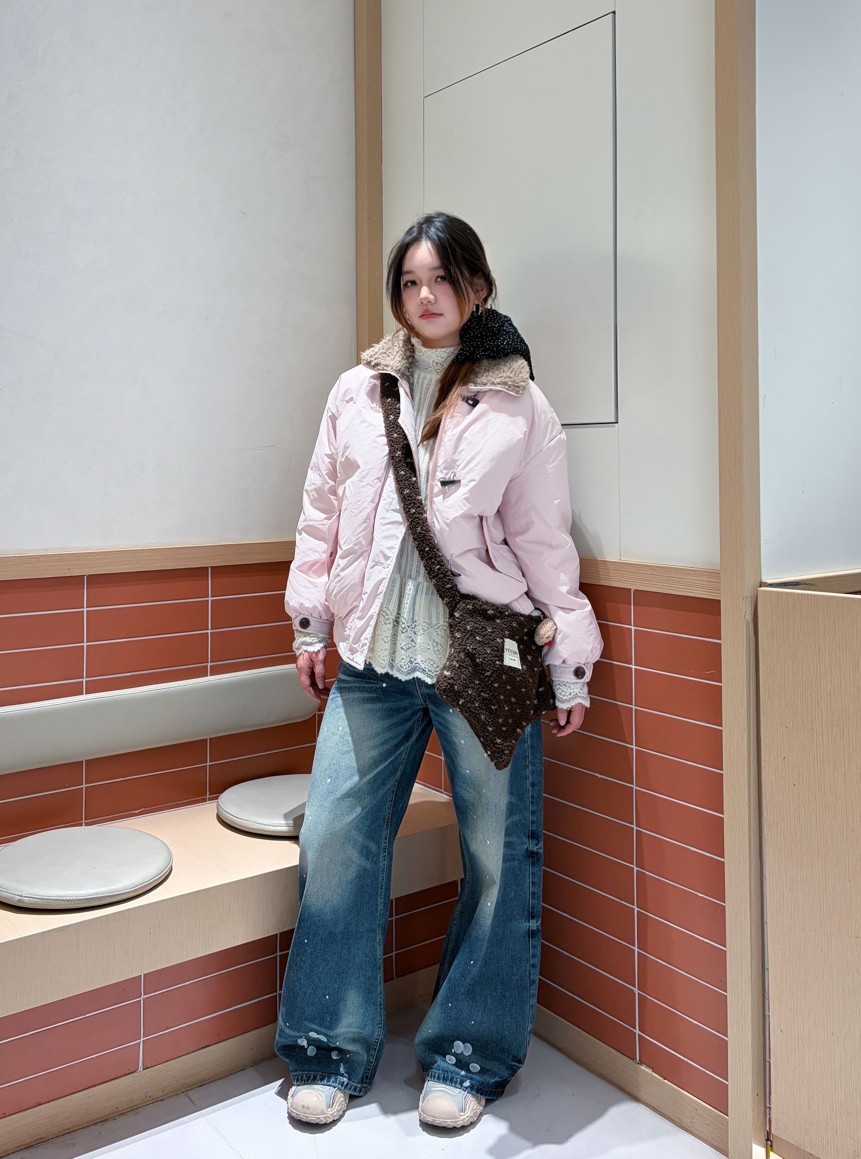 这套穿搭直接封神✨ 宽松粉白外套自带慵懒感,下装搭一条复古阔腿牛仔裤,高腰设计直接把比例拉满!软fufu的面料不压身~ 再配上棕色斜挎包点缀,甜酷平衡得刚刚好~ 整套配色温柔又清爽,随便一拍都超出片!