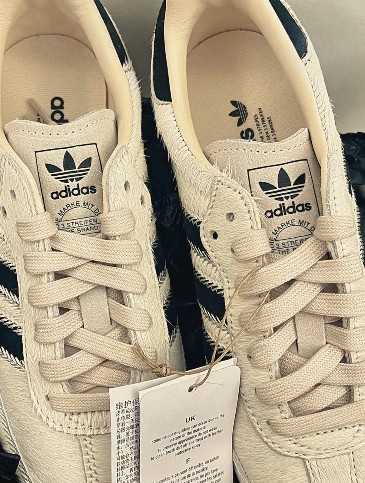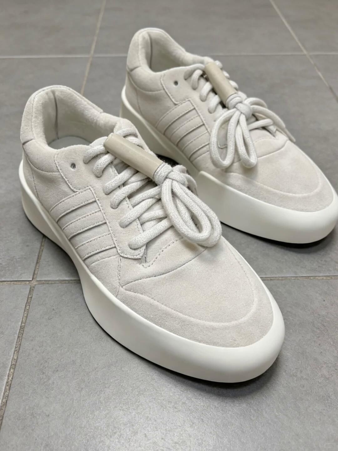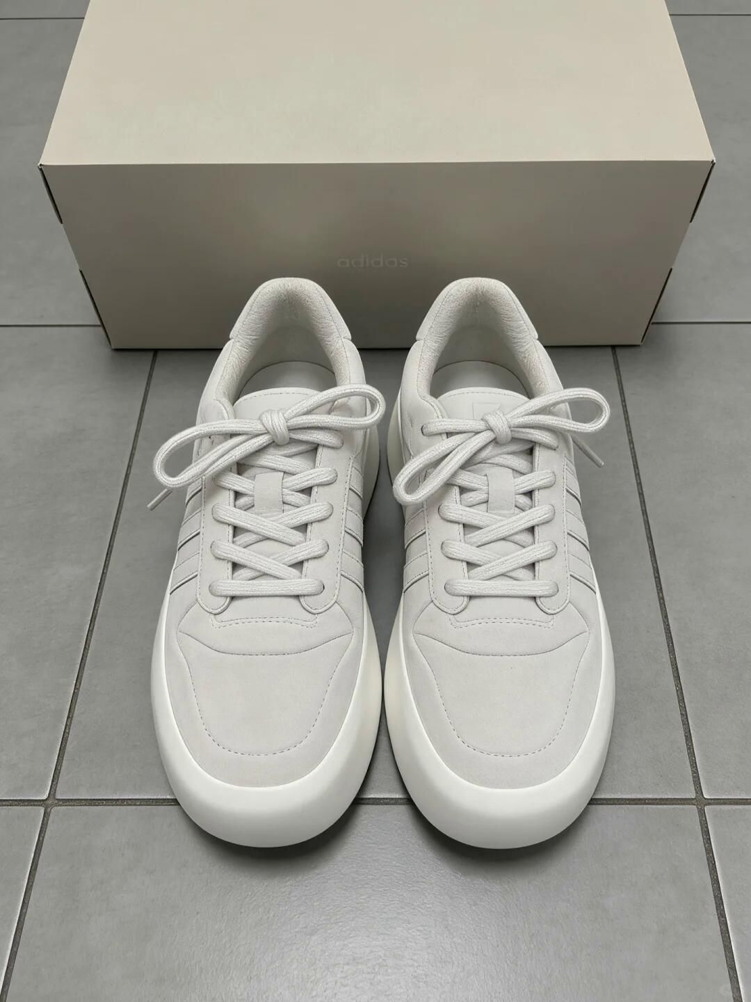 说实话这双鞋设计可能有人觉得怪, 但材质确实顶,全是水洗绒面革。 侧身FOG黑条加三叶草细节很多,就是脚感偏硬点。好处是鞋型百搭,平时随便穿都很有型, 尺码按正常或者大半码买,出街穿它绝对有面儿。