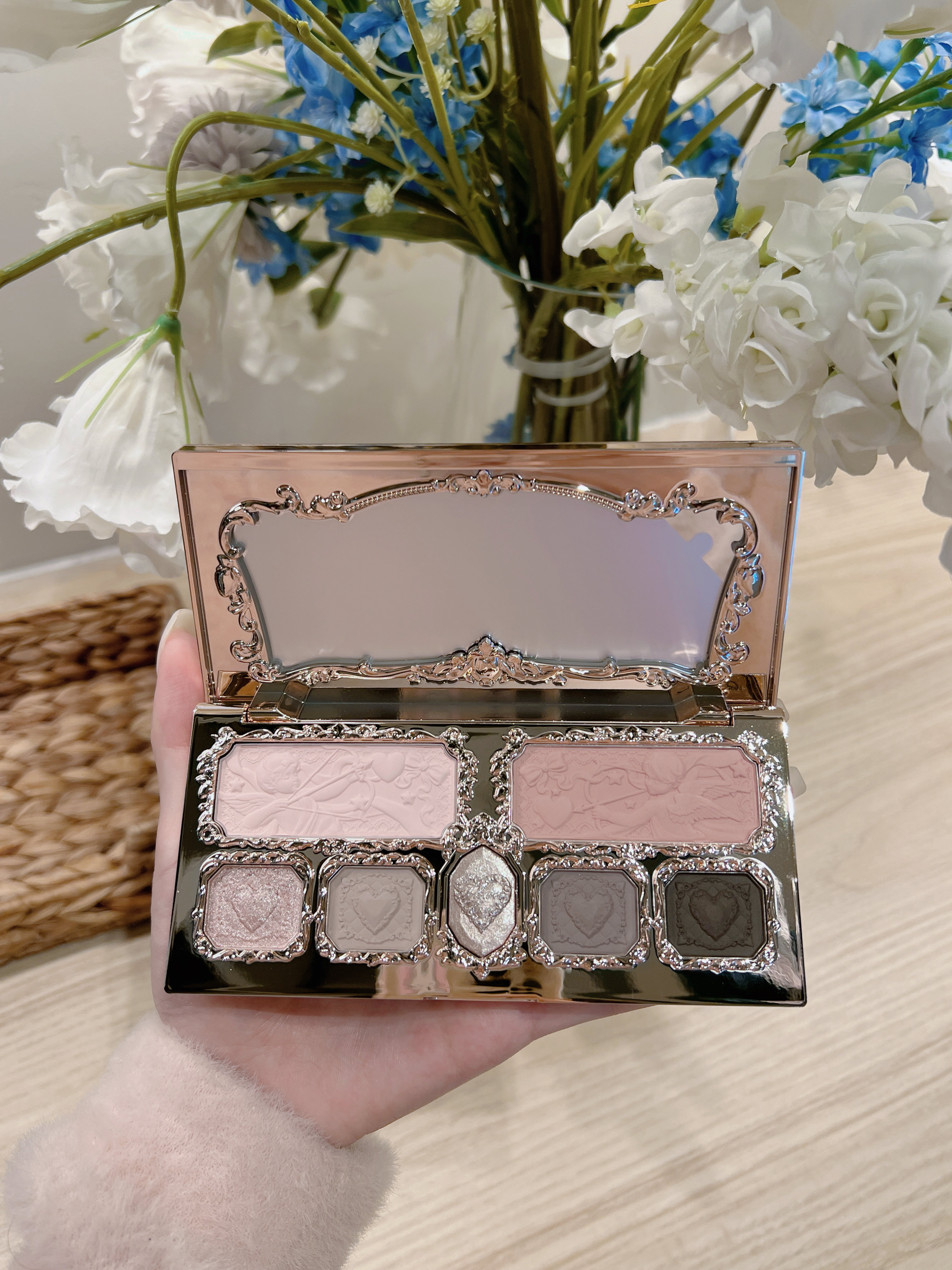 外壳是浮雕小天使+粉金配色,拿在手里像艺术品,补妆都变得有仪式感!打开是低饱和灰粉调,左边膨胀色腮红+右边收缩色修容,再搭配5颗珠光哑光眼影,日常通勤画伪素颜、晚上蹦迪画氛围感烟熏都能hold住✨