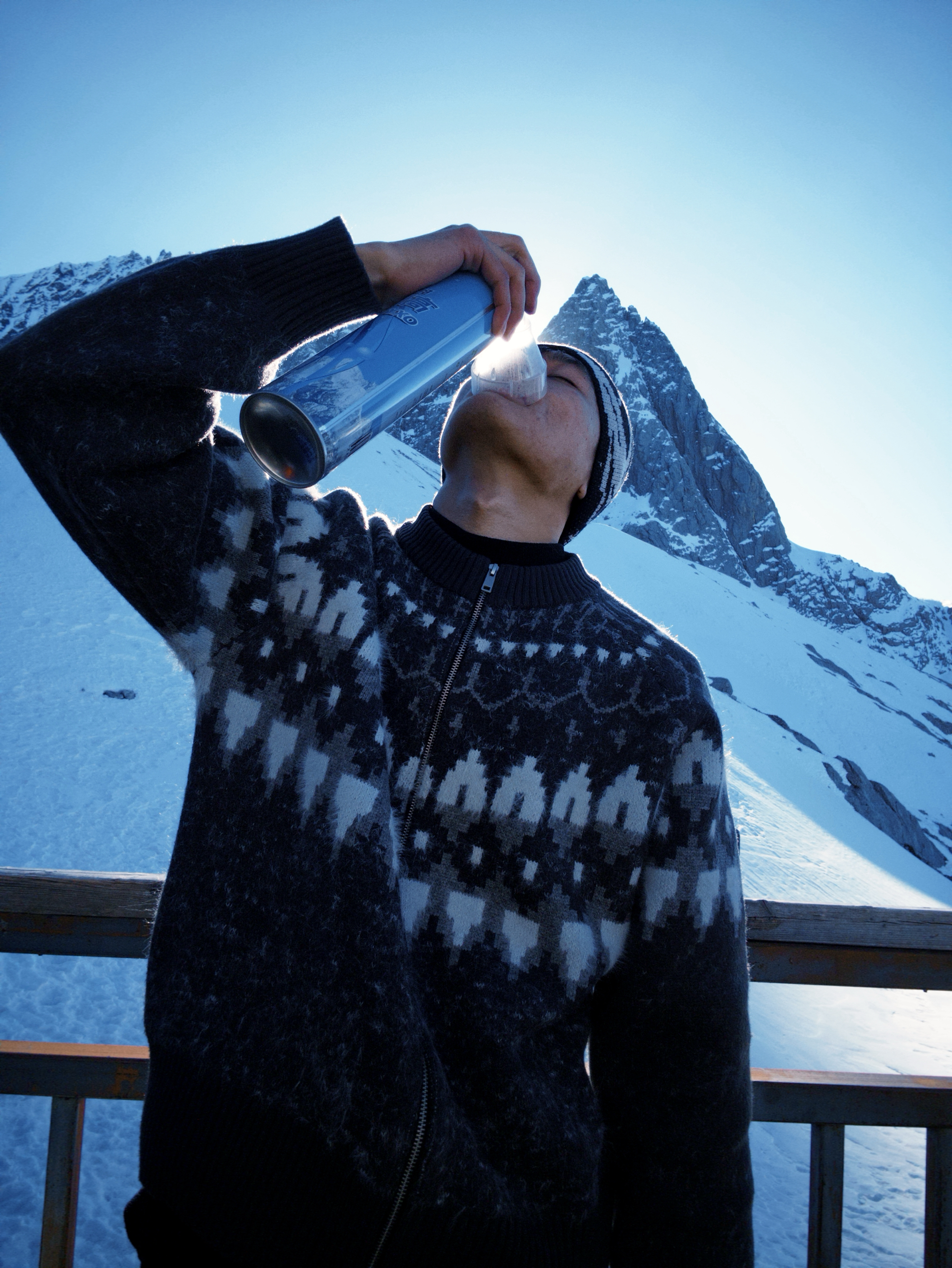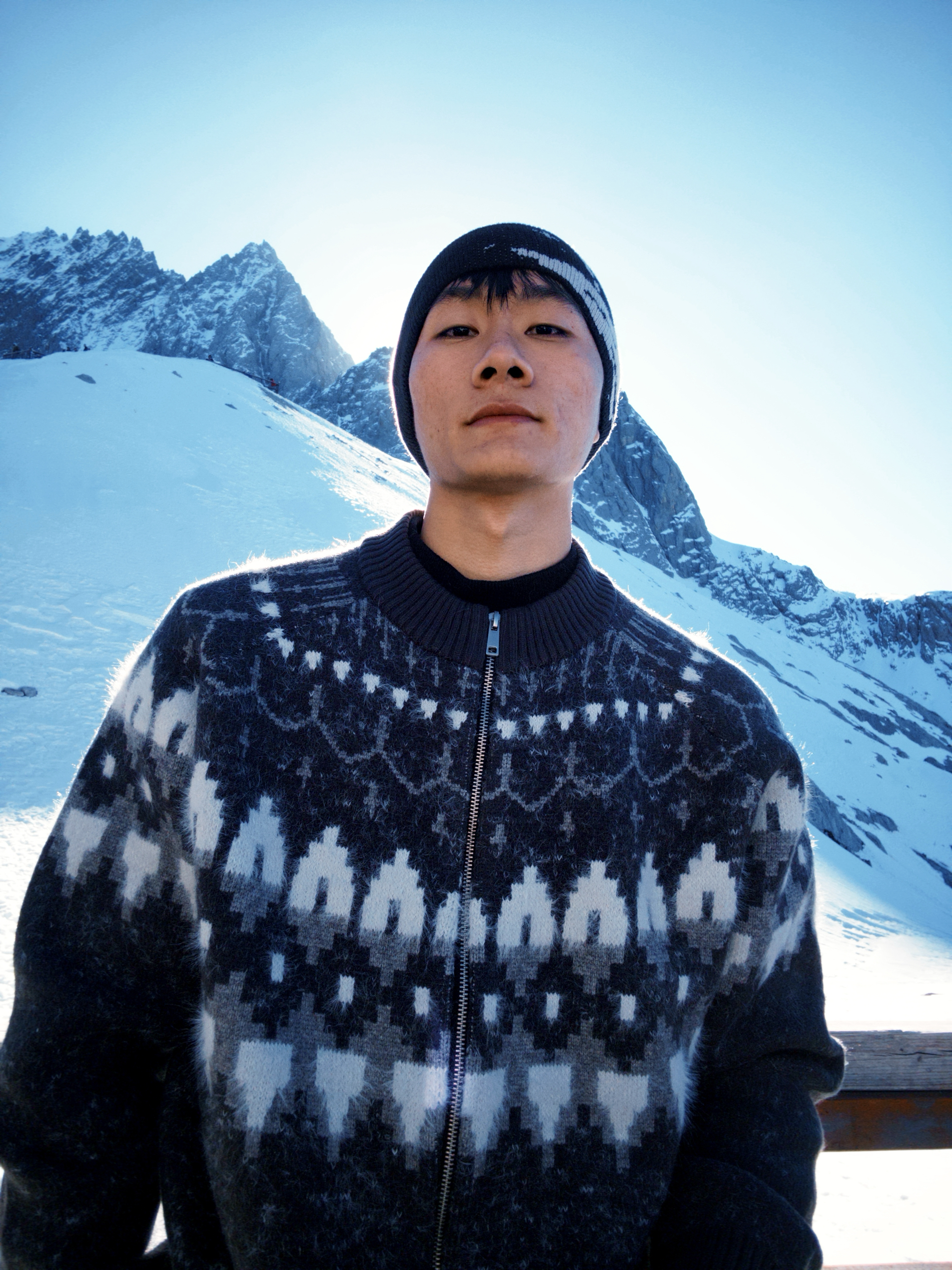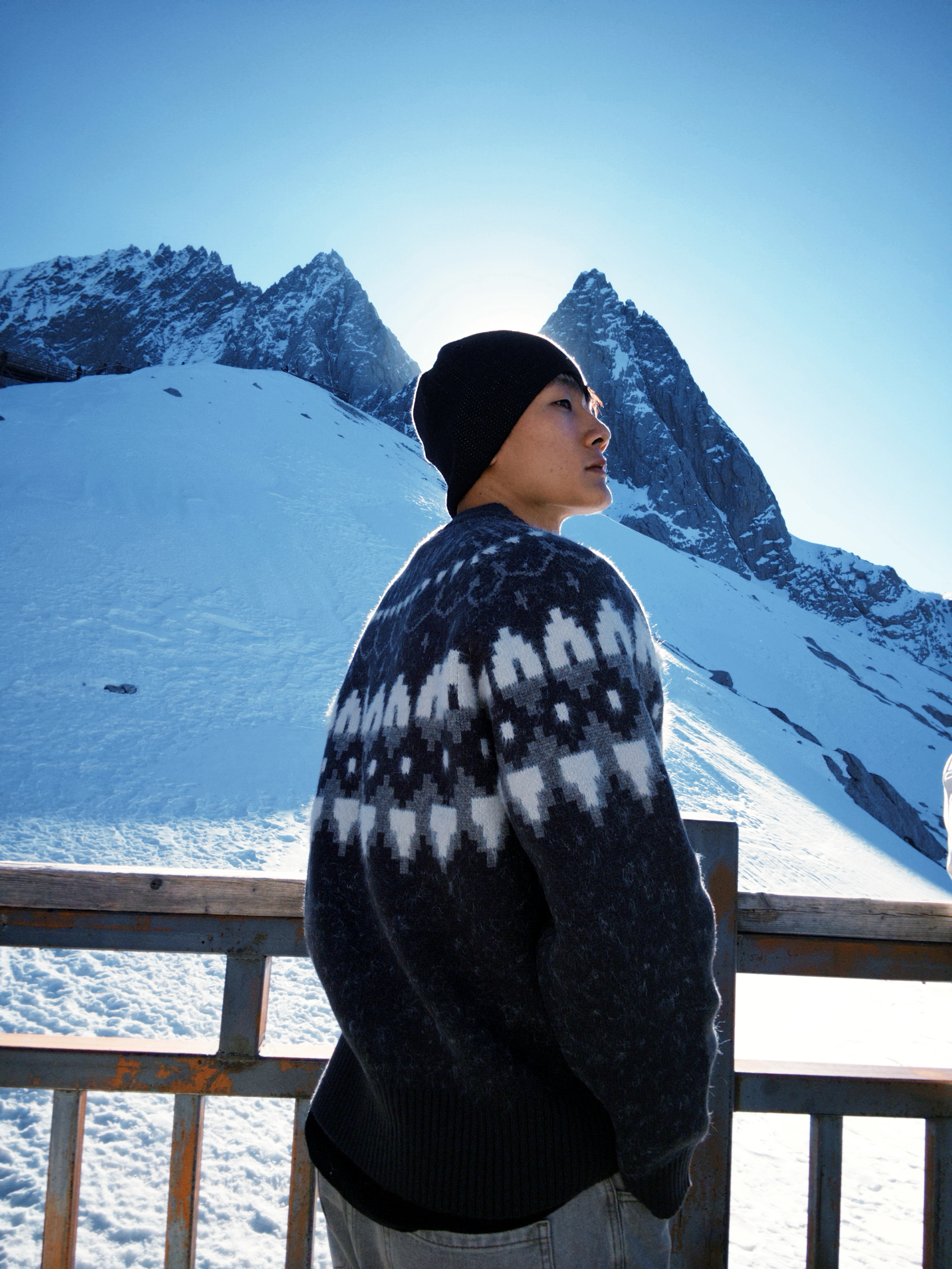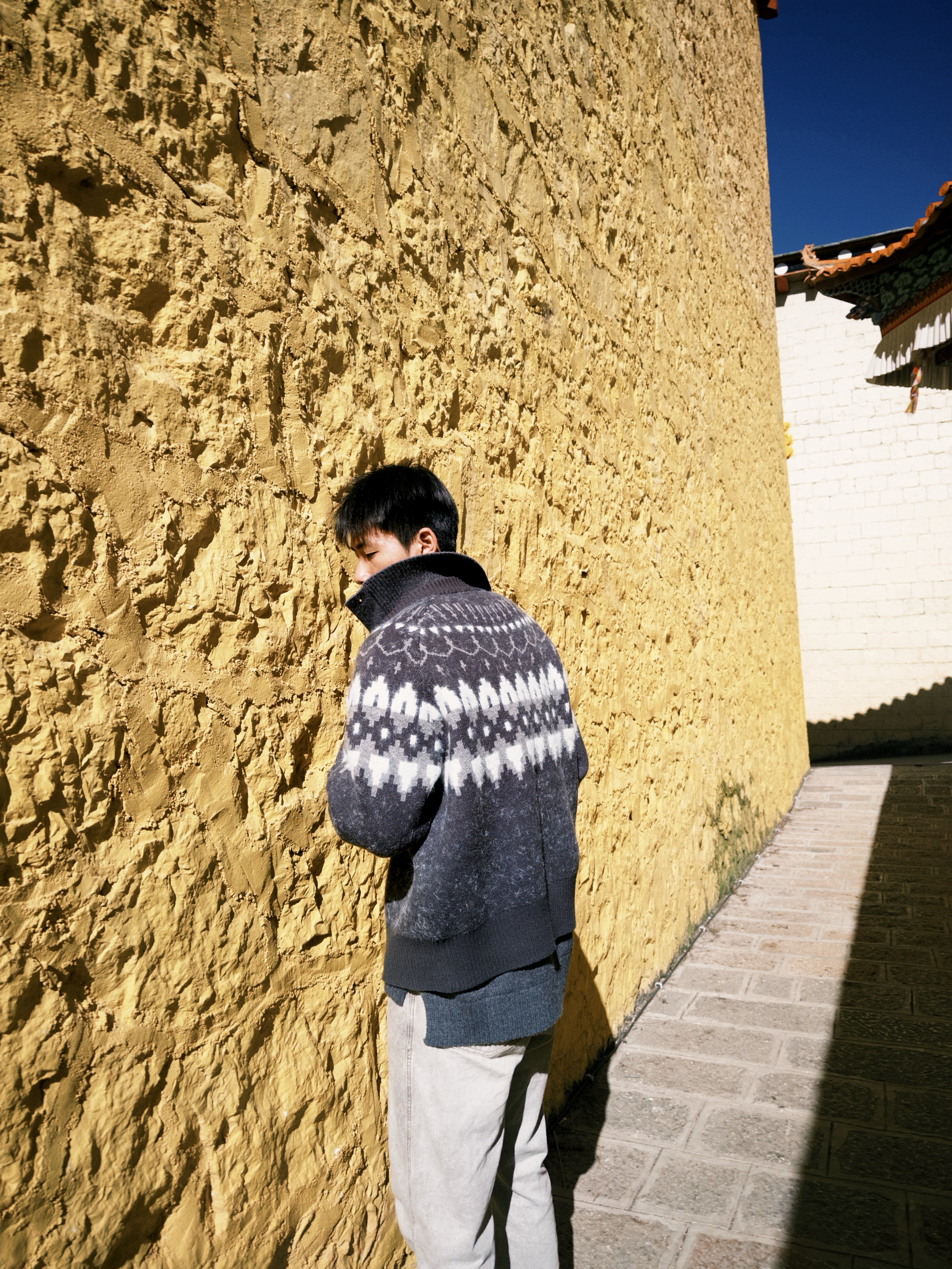 在云南雪山和藏式黄墙穿这件新因素的费尔岛毛衣,直接封神! 黑灰撞色的民俗图案和雪山白雪、藏式暖黄墙面都超搭,随手拍都是不同风格的大片。腈纶混纺的面料挡住了山间的冷风,厚度适中不臃肿,拉链开衫冷了拉上、热了敞开,超灵活。宽松的版型在雪山徒步、藏巷闲逛都自在,搭条浅灰休闲裤,简约又凸显图案细节。