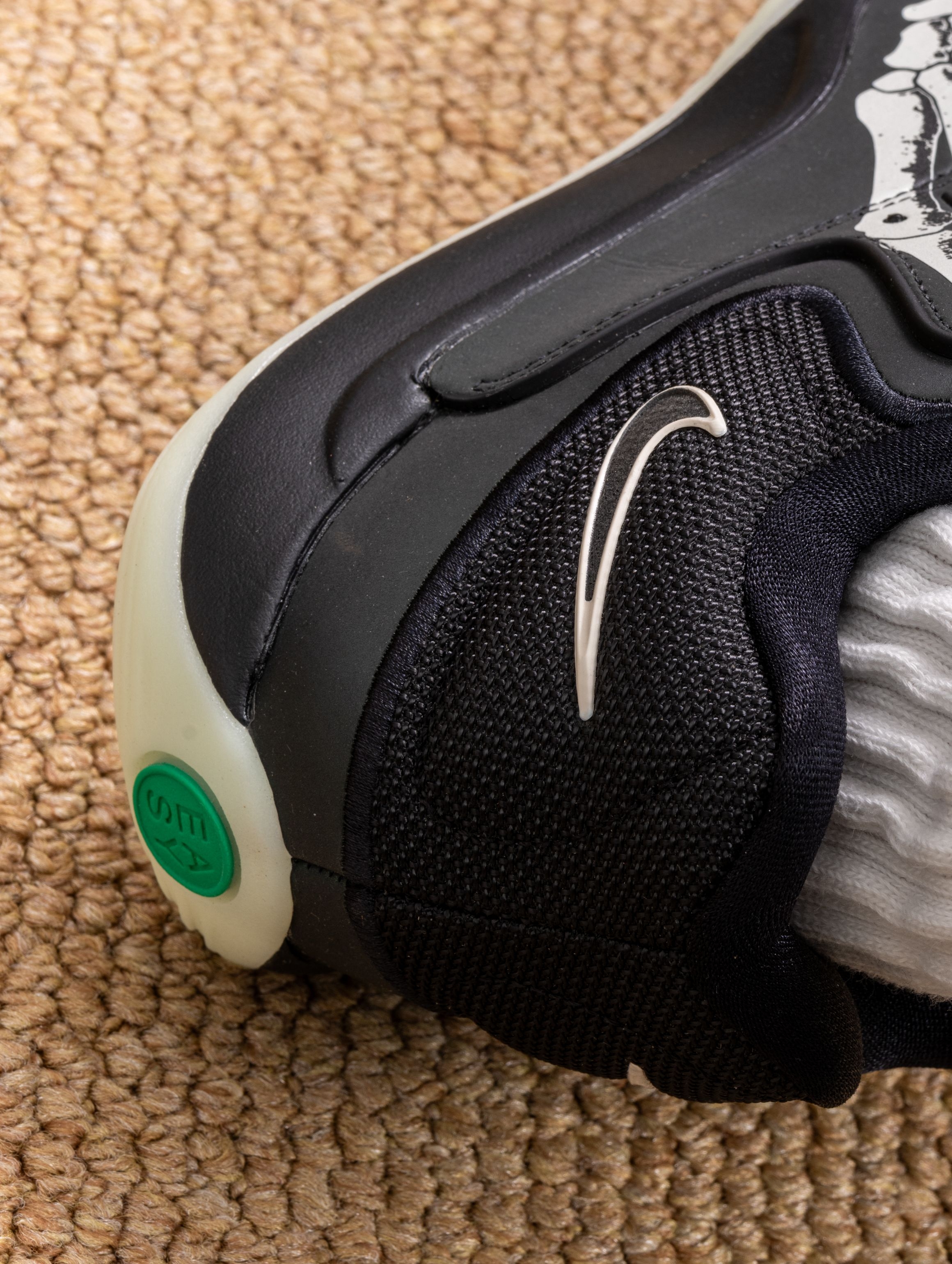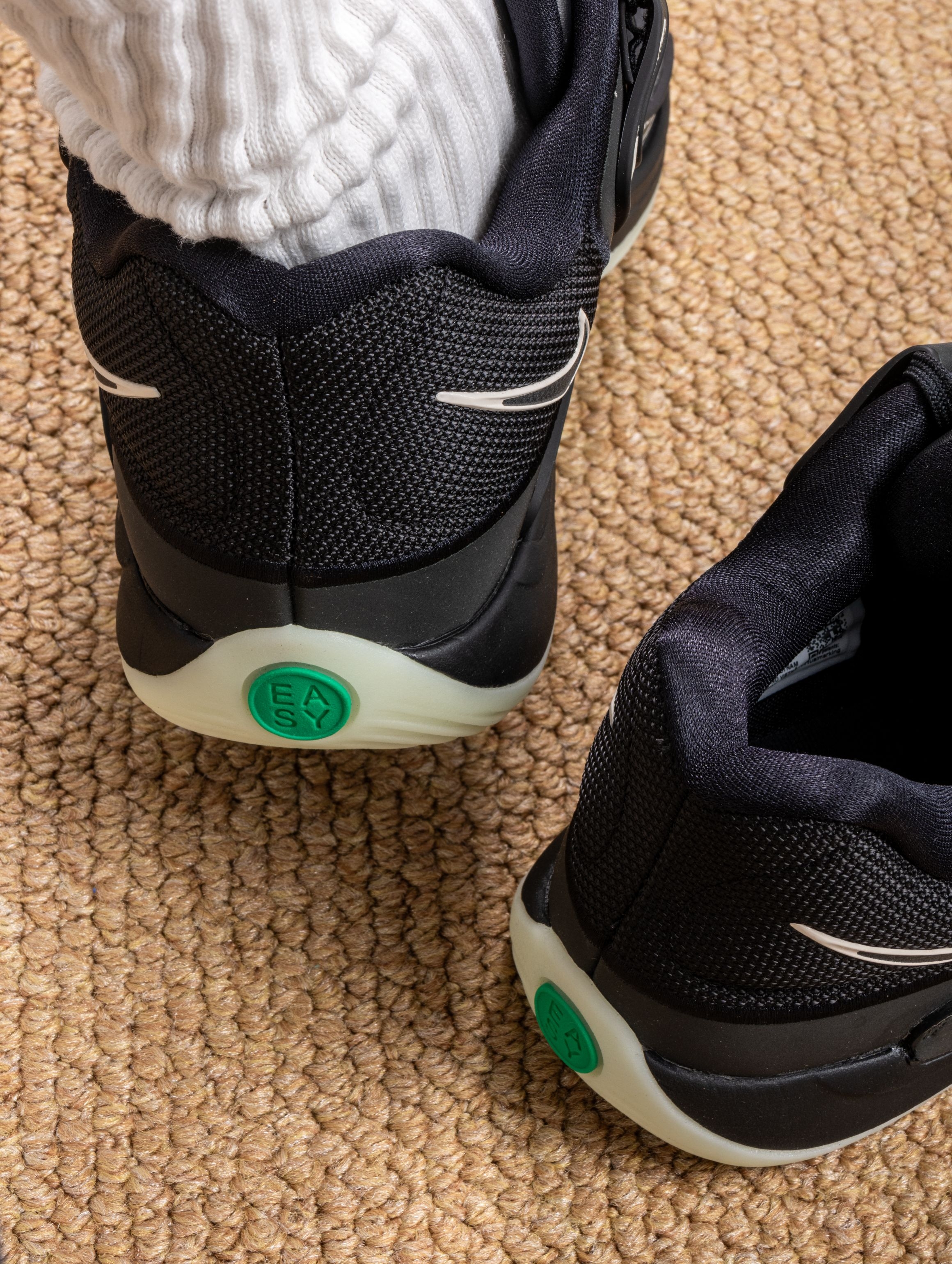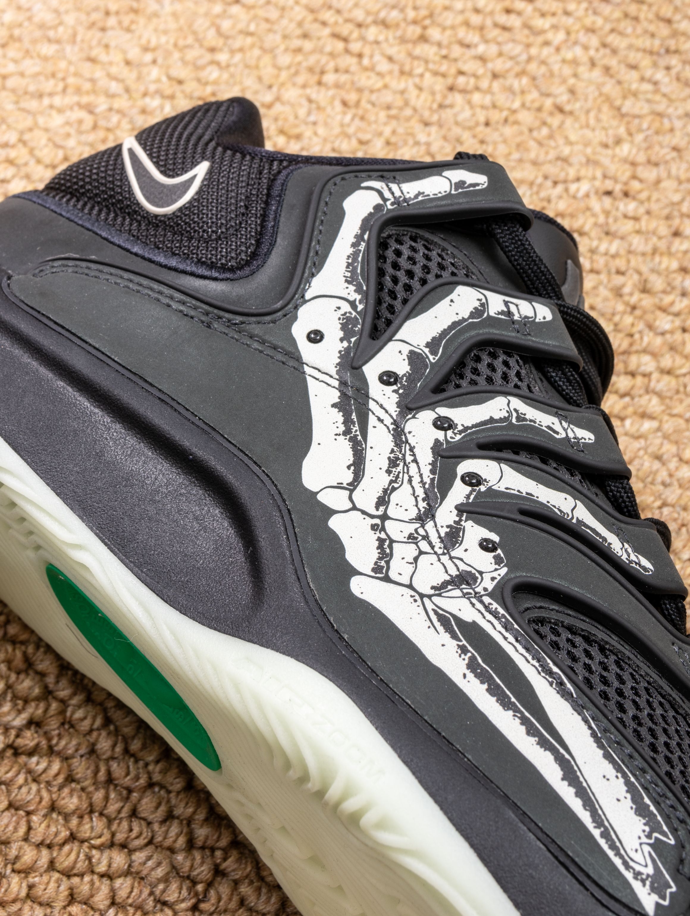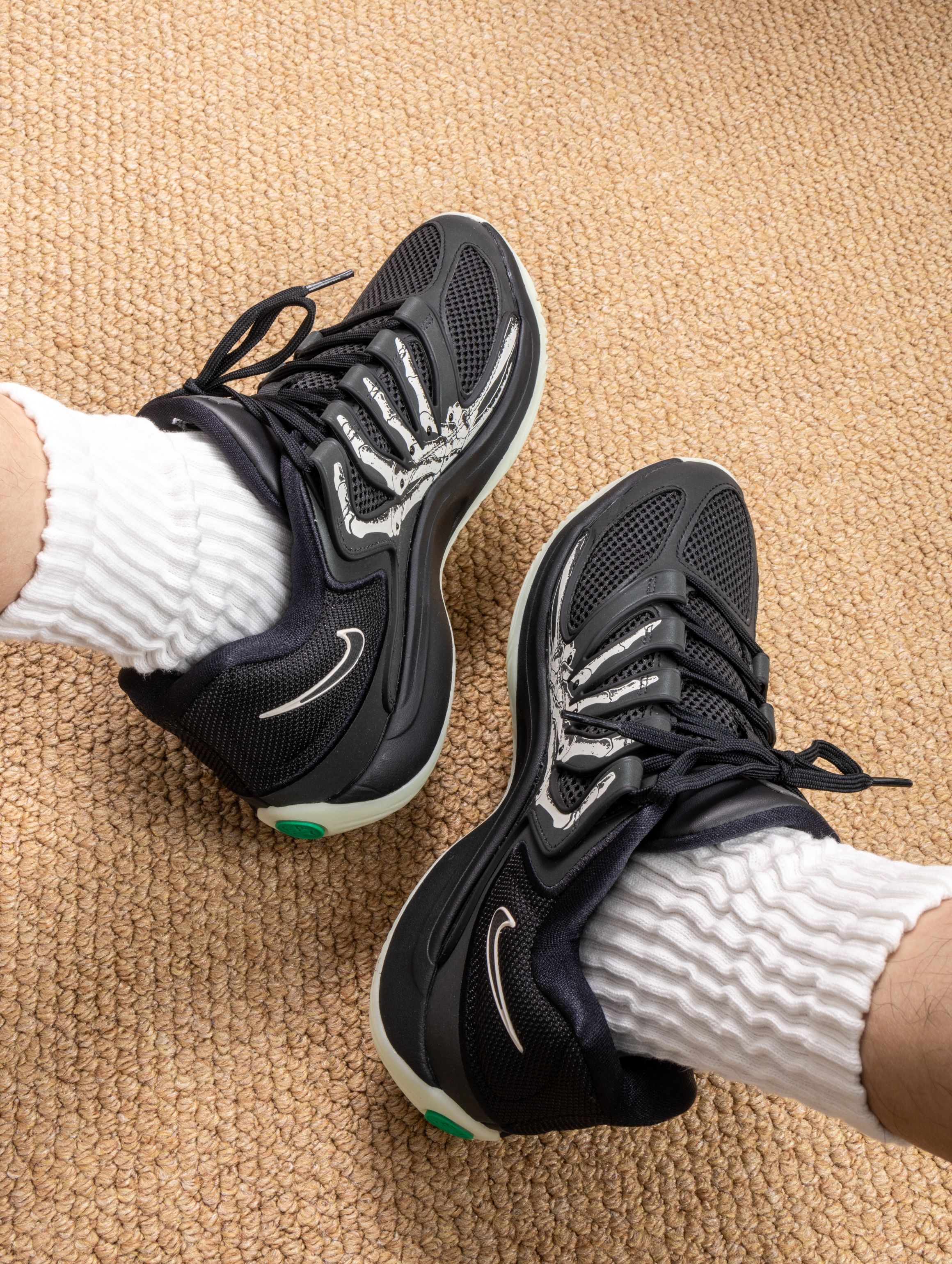 这双KD18万圣节限定,真是把暗黑美学穿在了脚上!纯黑编织鞋面像浸透夜色的羽翼,后跟渐变细节如同雾气中浮现的镰刀轮廓,上脚瞬间气场全开。 实战时更感受到它的细腻——透气网眼在激烈跑动中依旧保持干爽,前掌Zoom气垫响应迅速,急停跳投时抓地力紧咬地面,像暗夜中的狩猎者般精准安静。 我已等不及万圣节夜晚穿上它,无论是球场实战还是搭配一身黑色运动风出街,它都是沉默但绚烂的风格宣言。