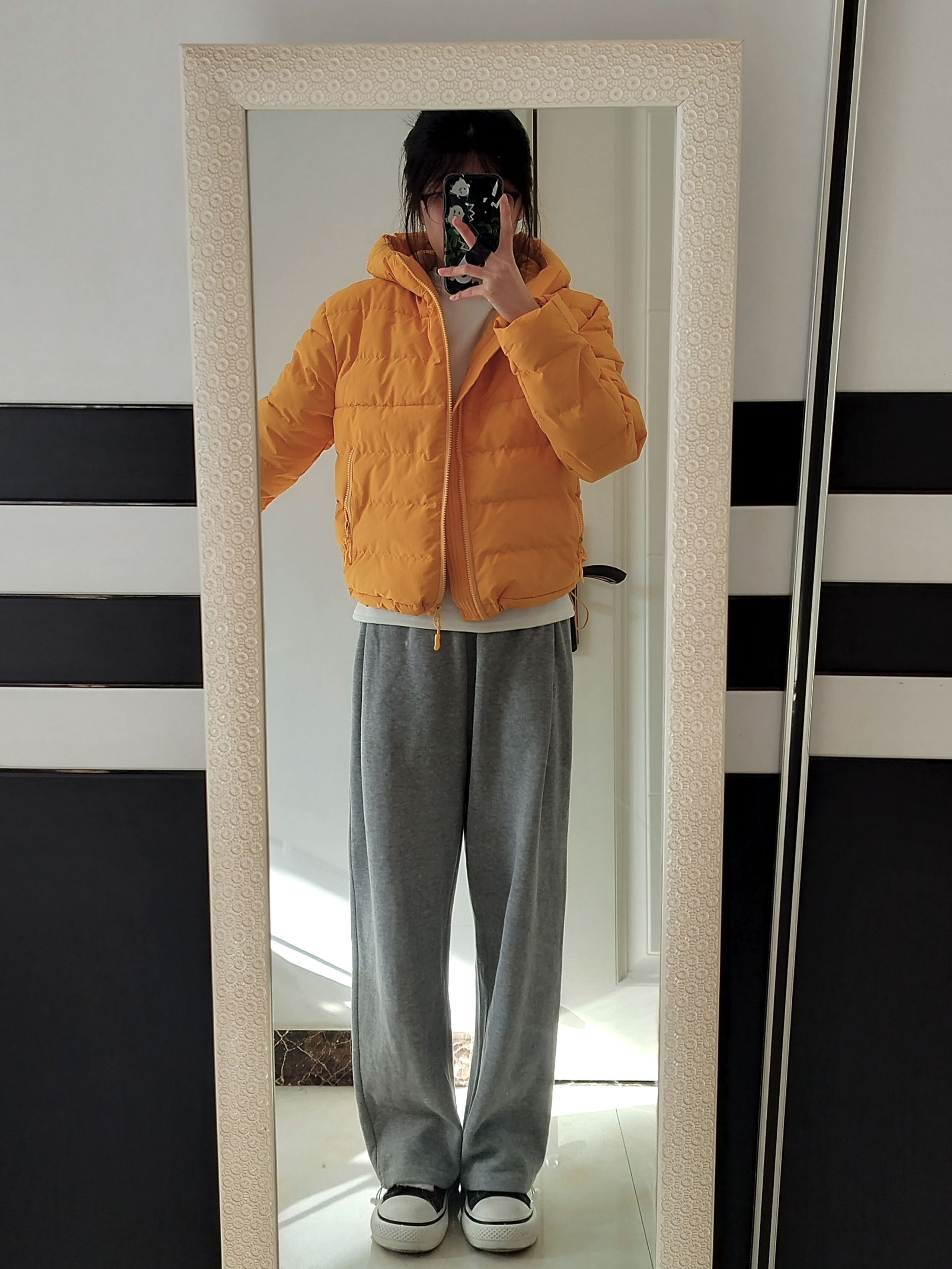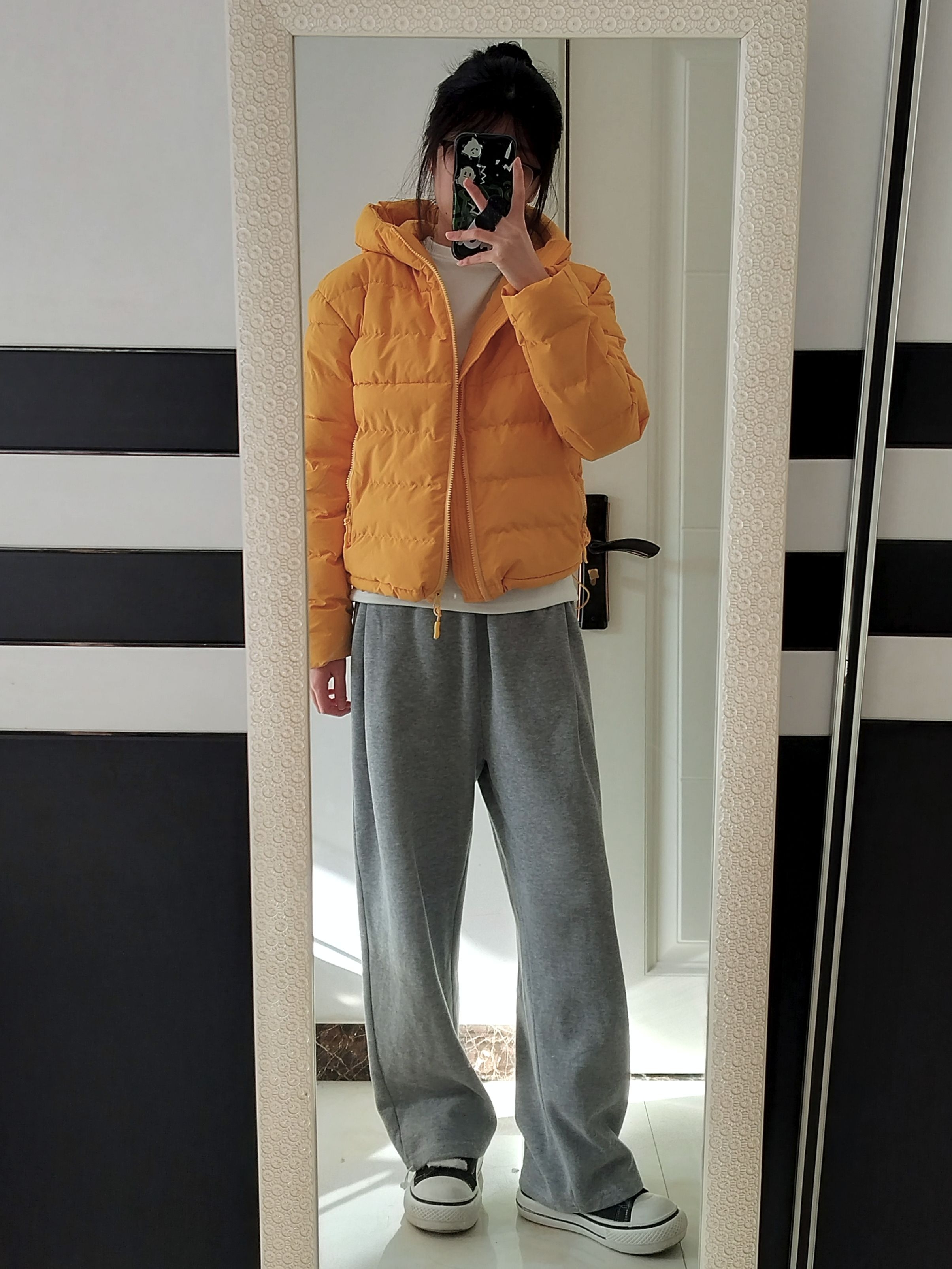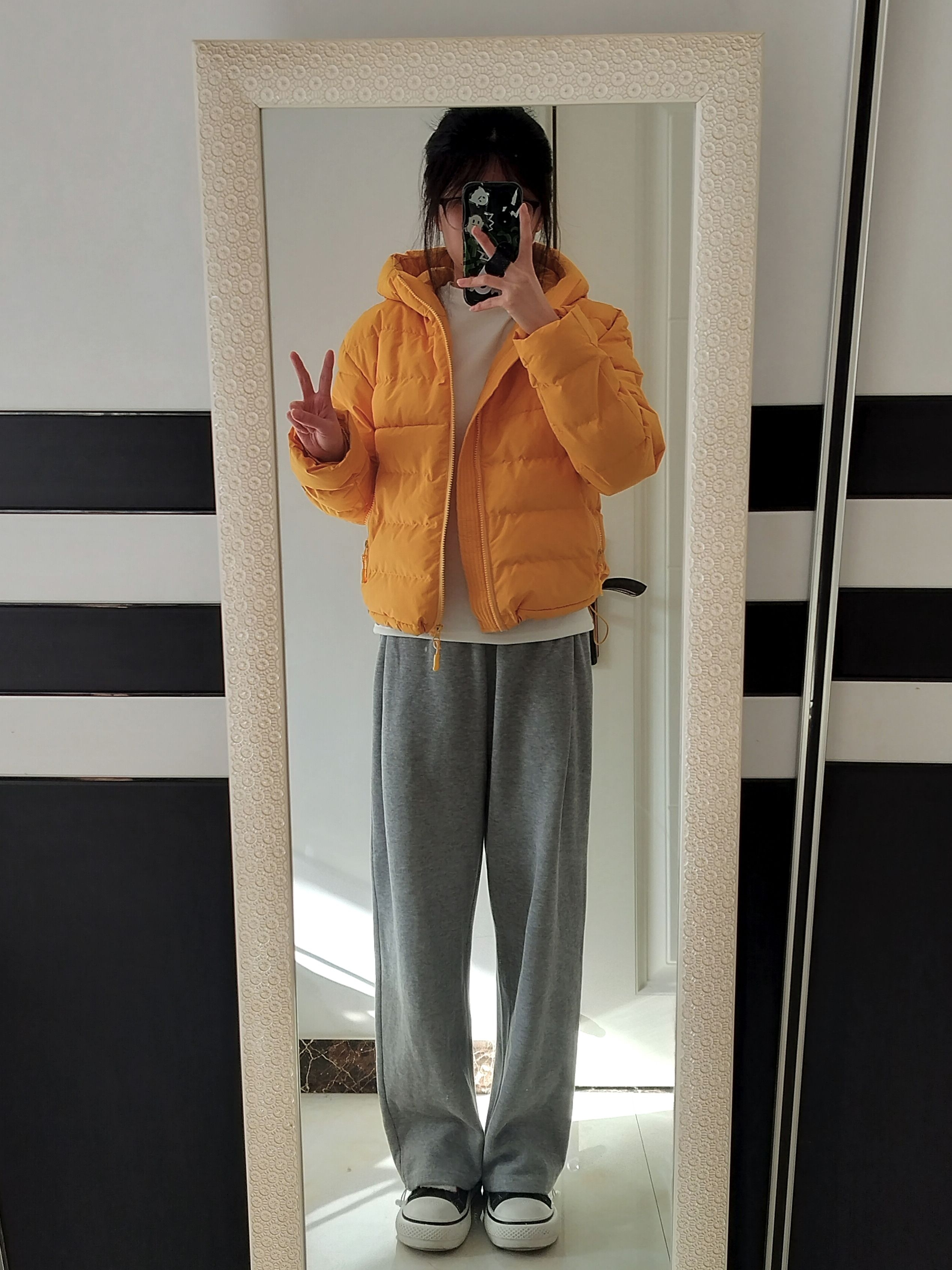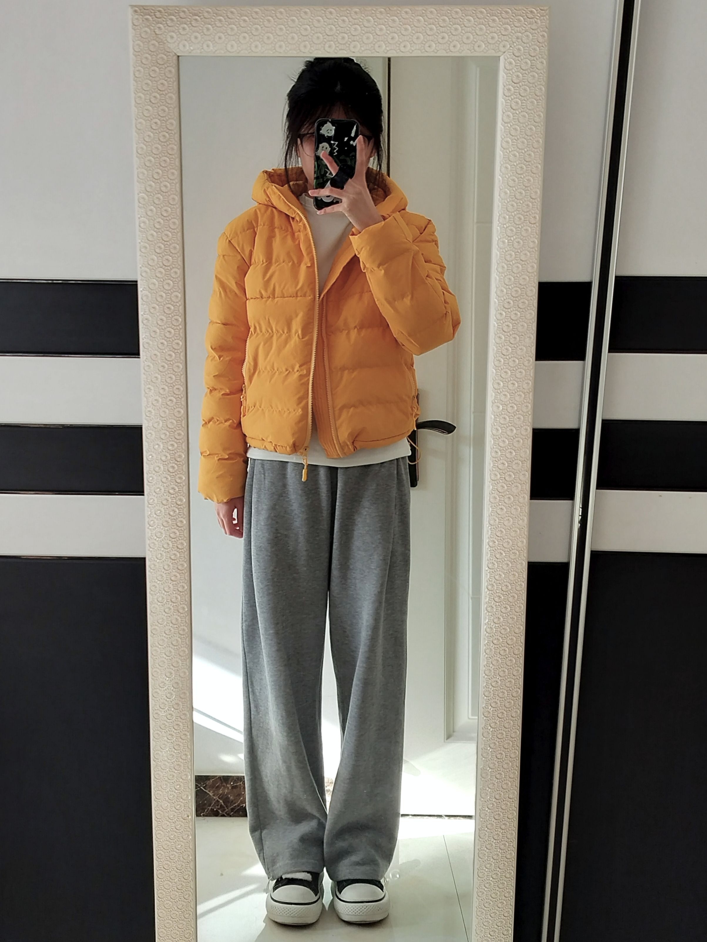 姜黄色短款棉服自带元气感 利落短款拉高腰线 蓬松棉感保暖又不显臃肿 搭配灰色卫裤 宽松版型舒适随性,中和亮色的跳脱 整体柔和协调 大头鞋厚底设计增加复古感 同时悄悄增高 让休闲造型更有层次 一套下来 活力与慵懒平衡 日常逛街 通勤都好穿 亮眼又不浮夸 轻松穿出随性时髦感