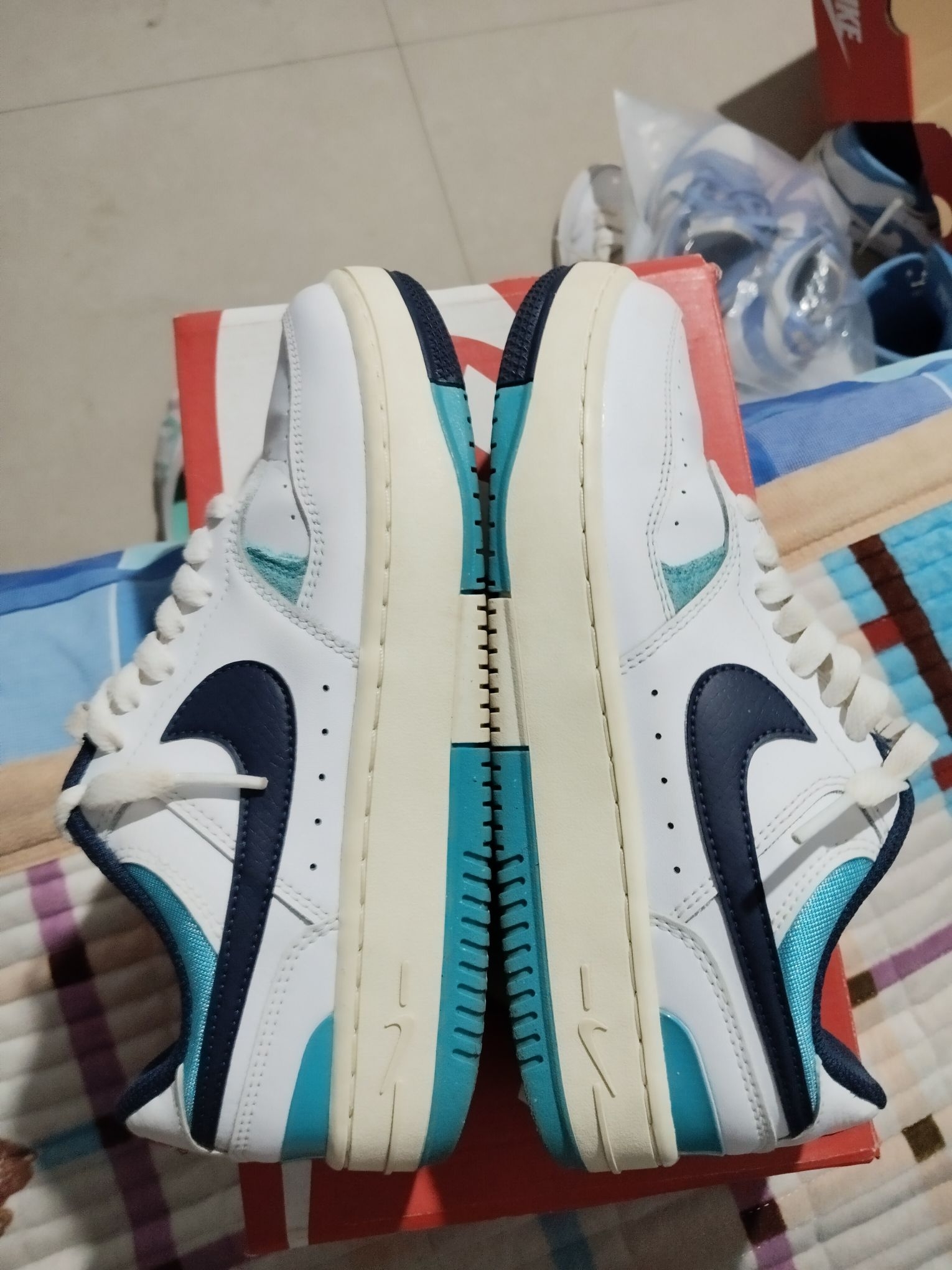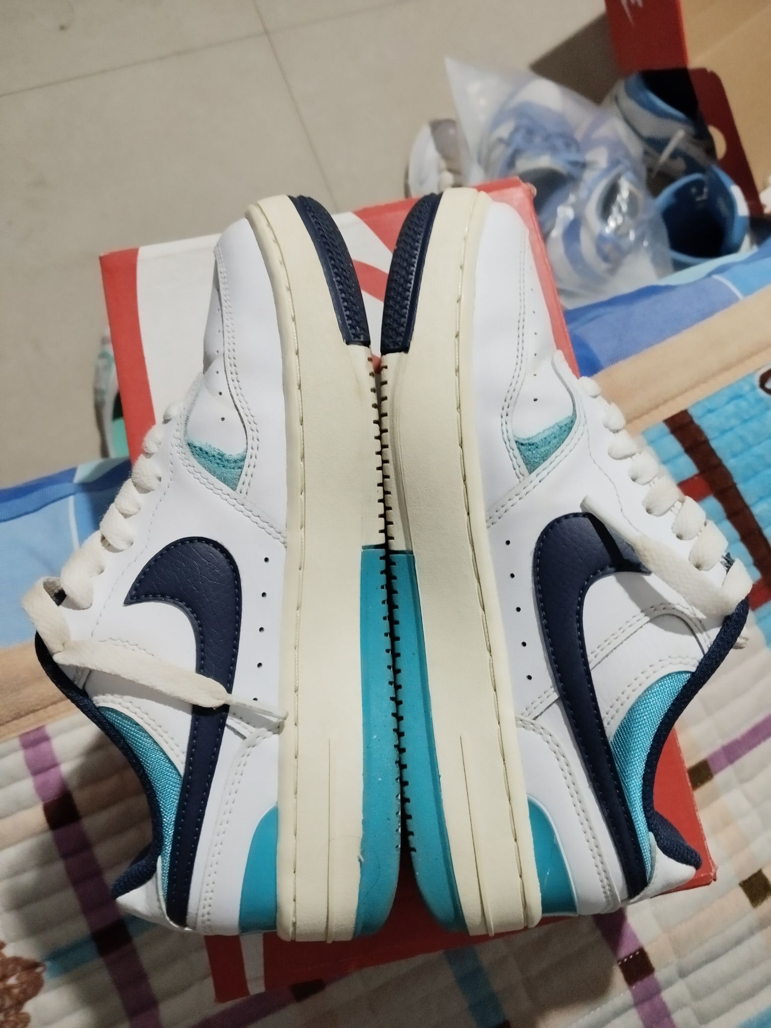 这双Nike的配色直接戳中校园心巴!藏青勾子沉稳又耐看,湖水蓝点缀活力拉满,走久了脚也不酸,学生党上课、通勤党上班都能搭,复古感拉满还不挑人👟