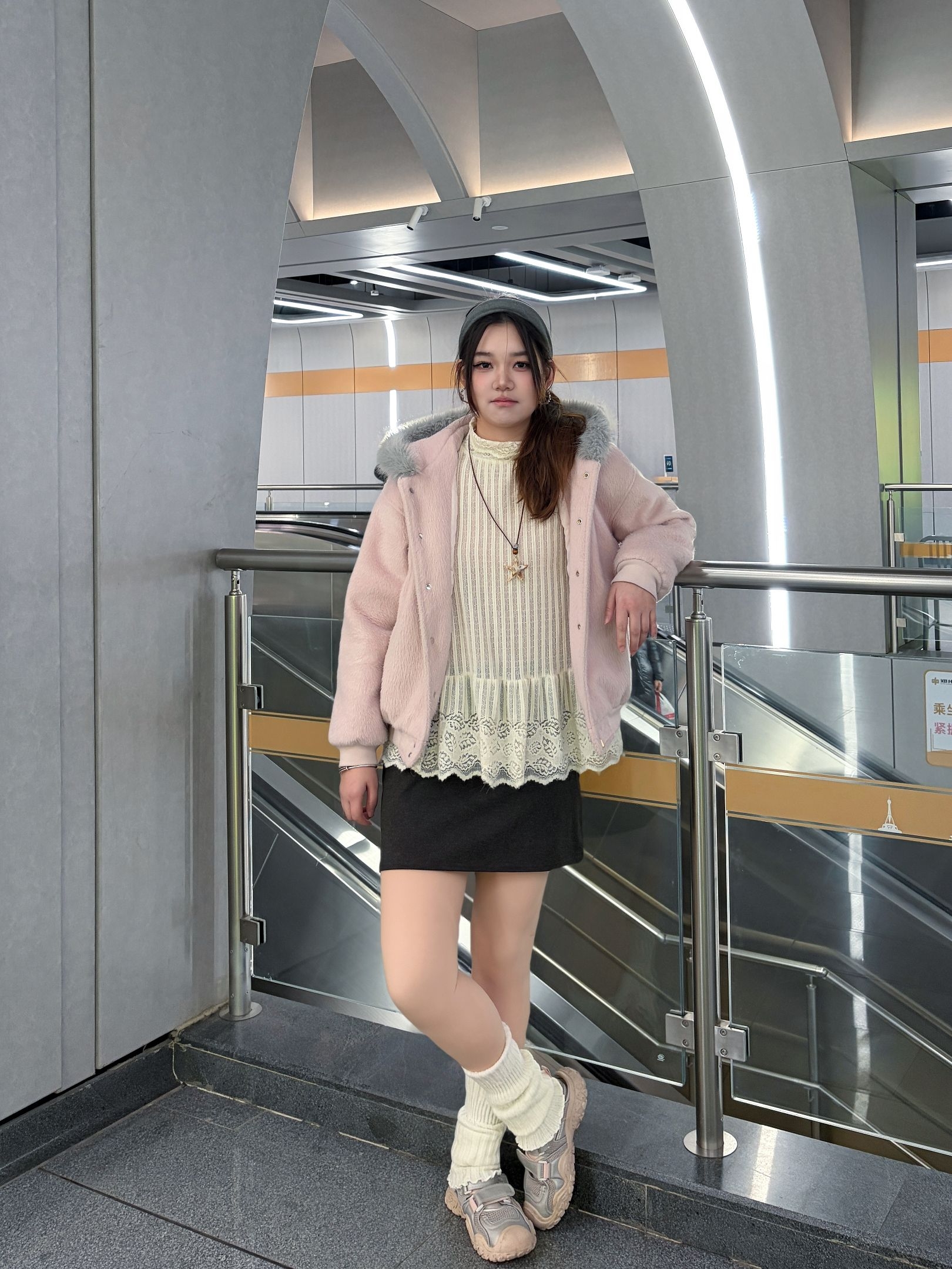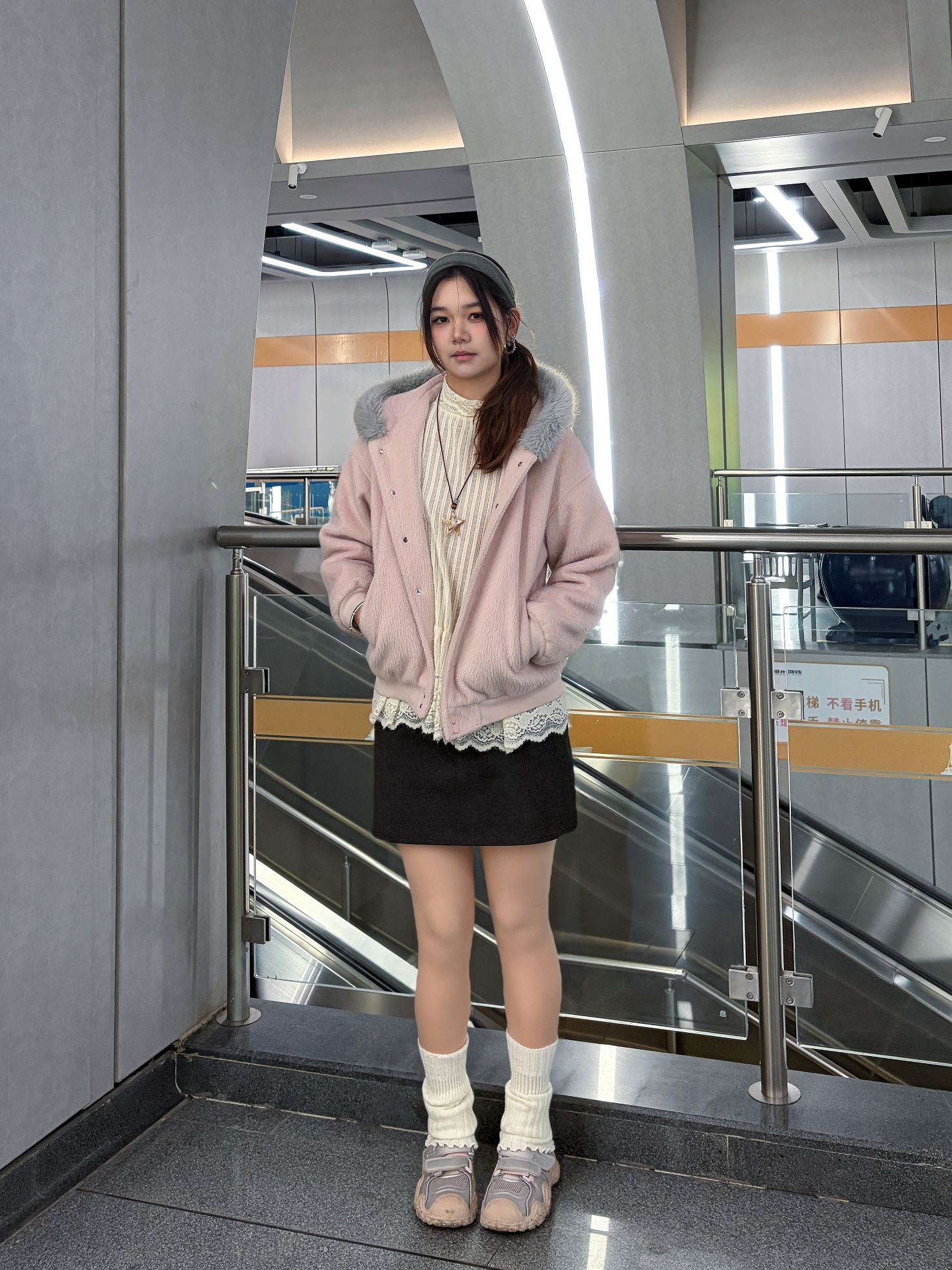 今天是地铁里被要链接的一天! 这件浅粉色毛绒外套真的是微胖女孩秋冬天菜,软fufu的质感摸起来巨舒服~ 版型是微宽松的,刚好遮住腰上的肉肉,搭配百褶裙+小腿袜,韩系温柔感直接拉满! 南方初冬单穿也够暖,北方叠穿大衣也很绝,一整个爱住💕