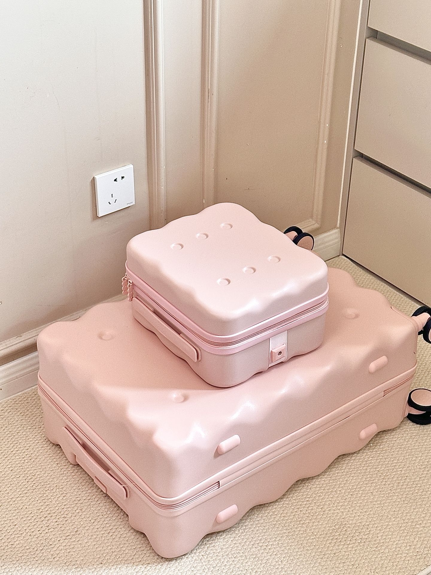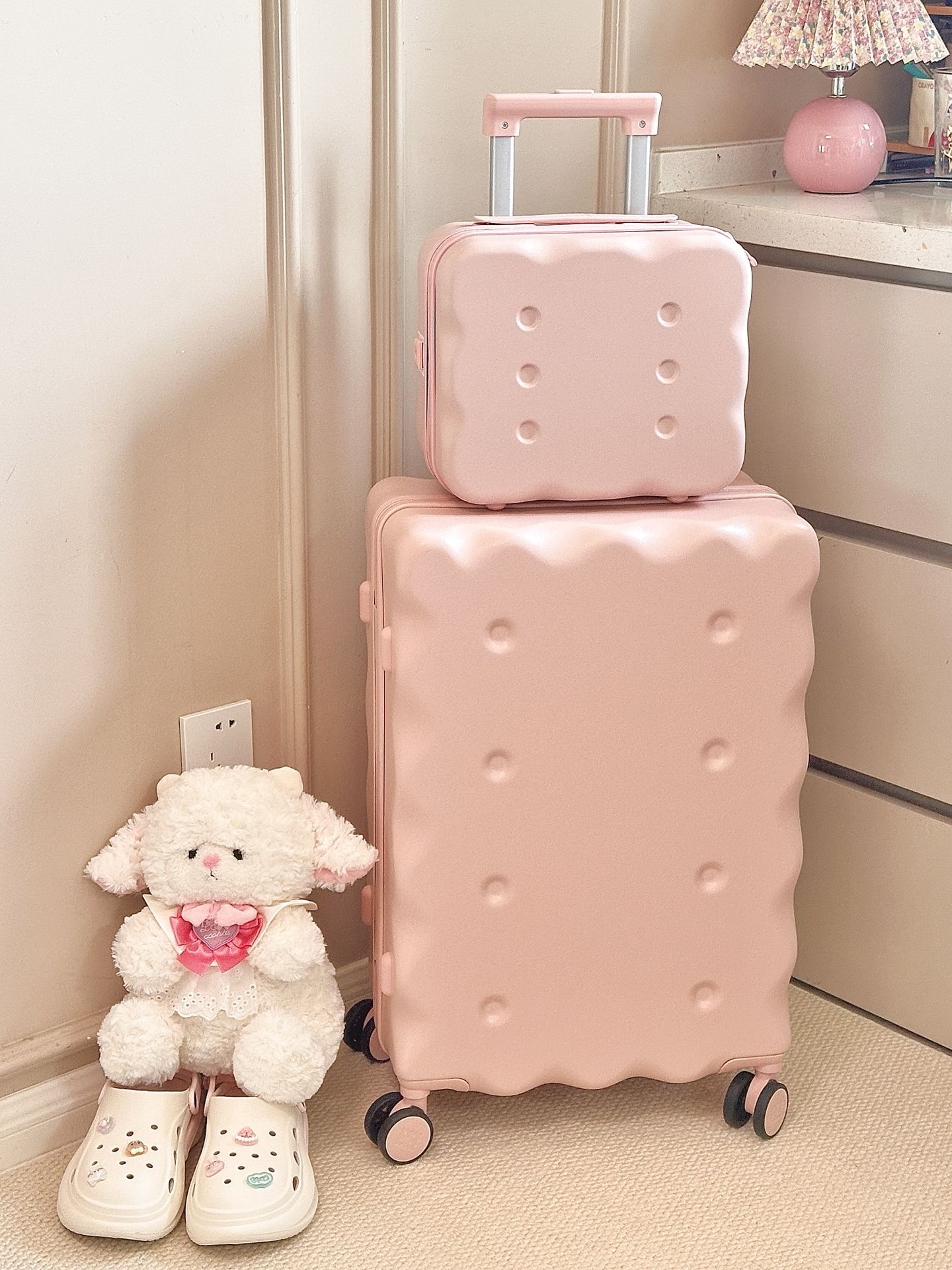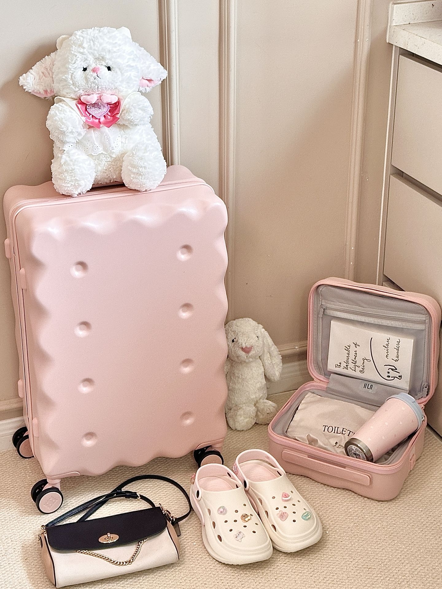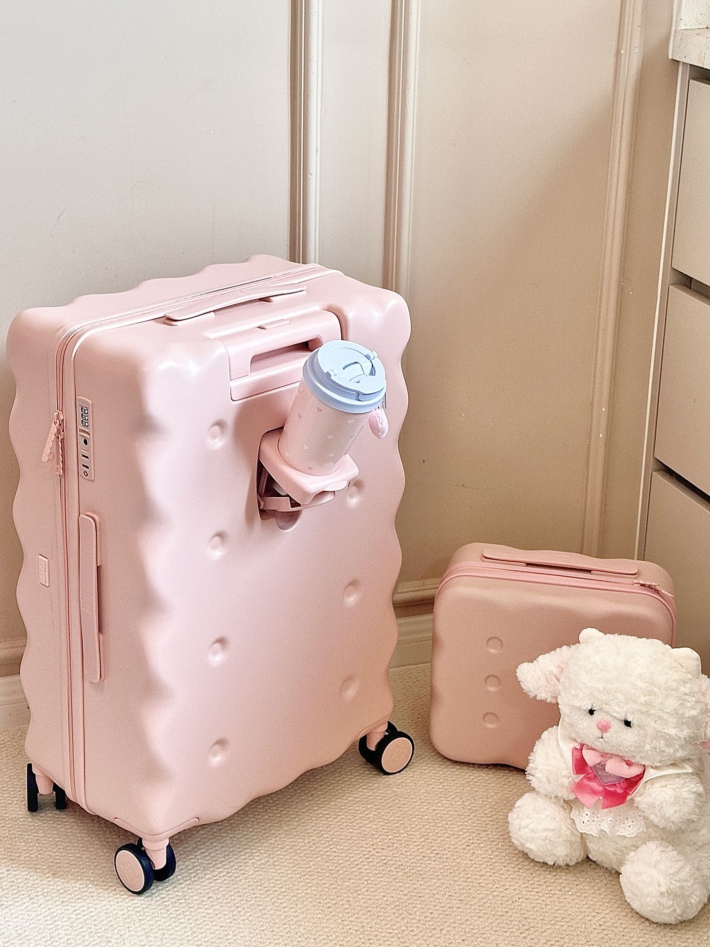 报告!甜妹的梦中情箱被我挖到啦🤩 是我想要的奶呼呼的浅粉色💗 饼干造型,看起来就香香甜甜的 我选的是24寸的行李箱再配了个mini箱 P人的我,好喜欢这个内里的分区 同属性的可以一起放,再也不怕找不到了 而且奶茶🥤还可以放在行李箱上 拉着走,轻便又省力,我真的想说 饼干行李箱,怎么那么可爱呀,爱了爱了 #开学包在我身上 #海澜之家行李箱 #疯狂心动的开学季 #七夕恋爱进行时 #记录暑期旅行穿搭