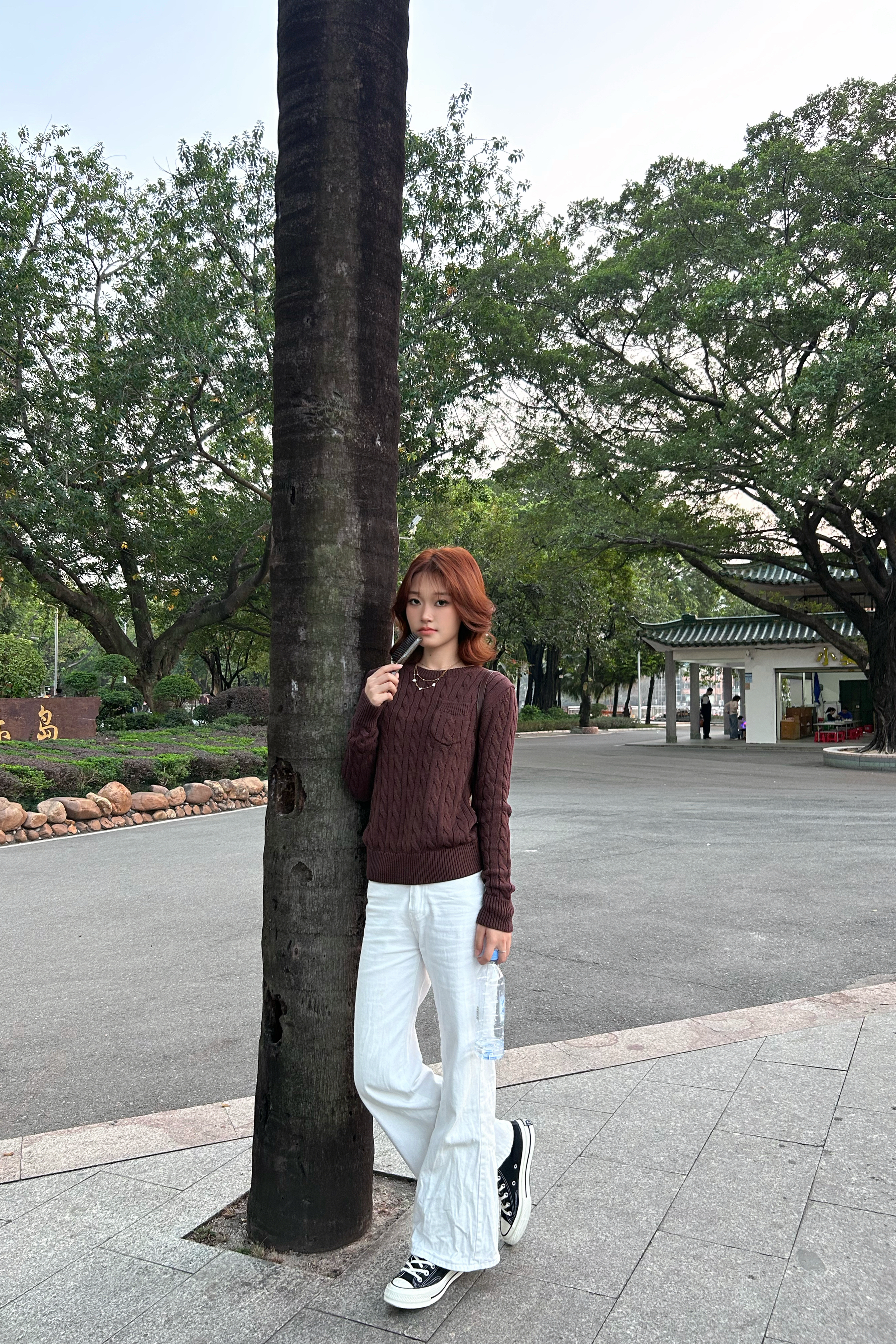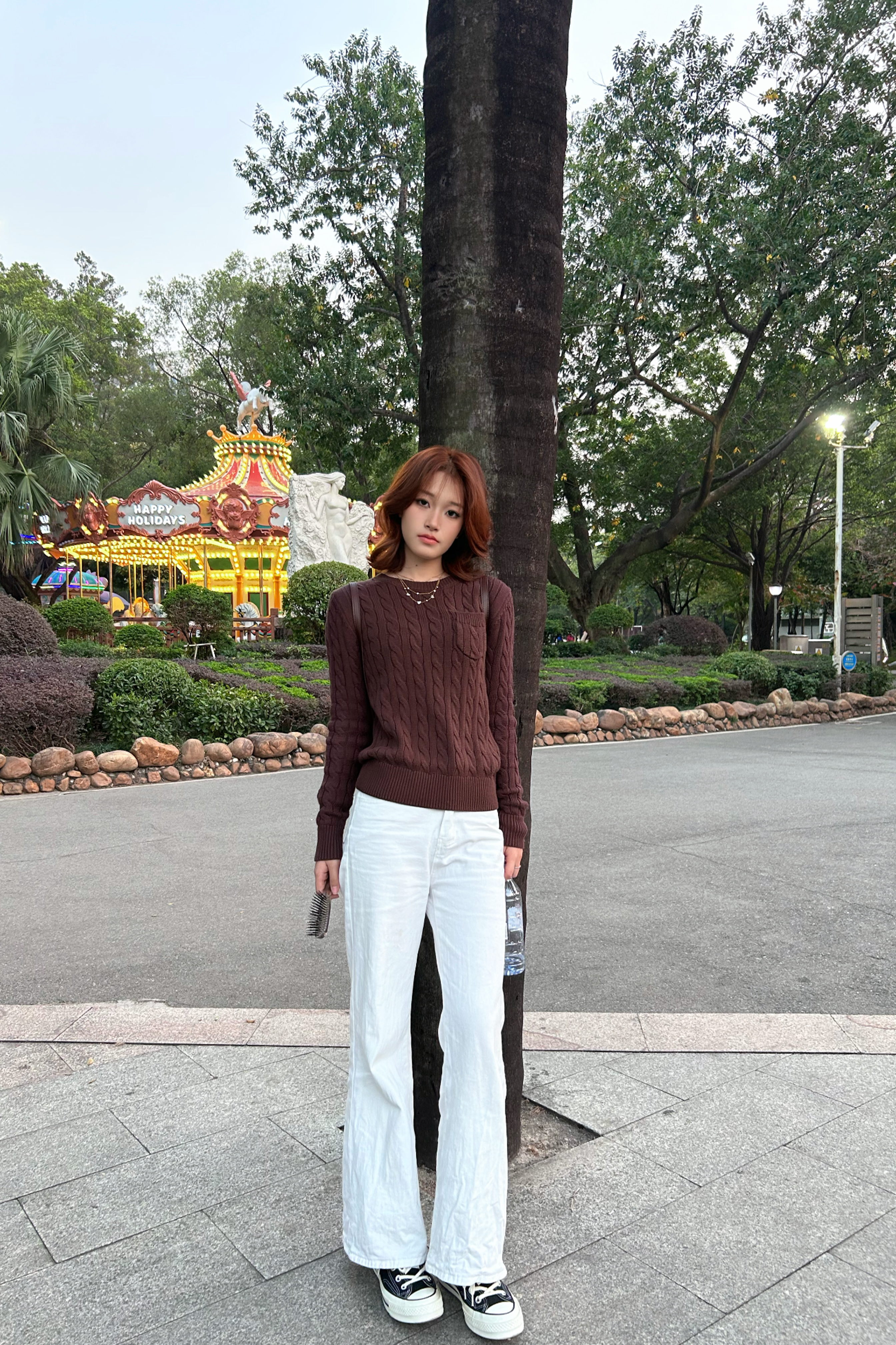 🍂 棕调麻花针织衫+纯白阔腿裤,复古松弛感拉满。在游乐园旁的树下,把秋日氛围感焊在身上~
