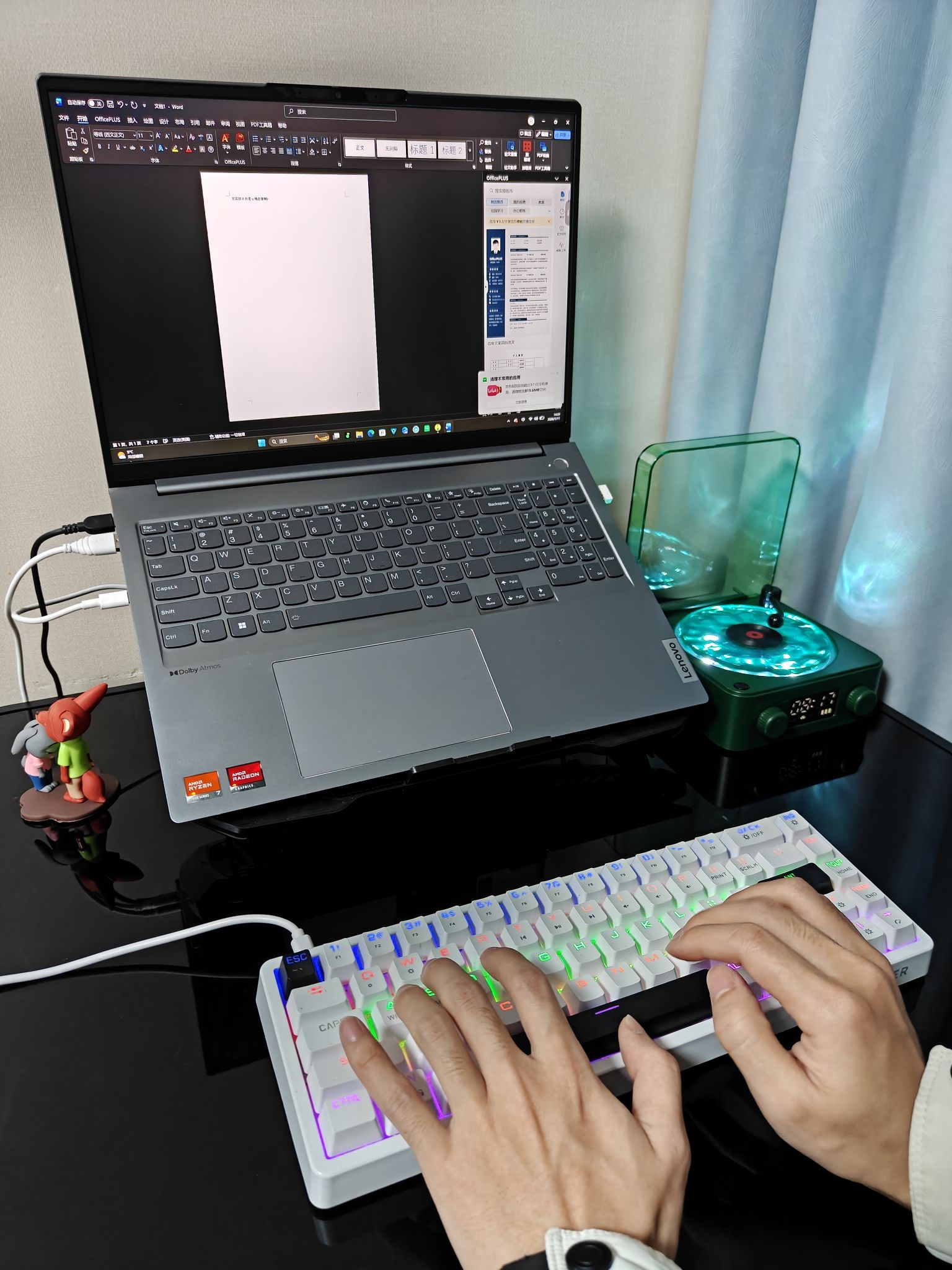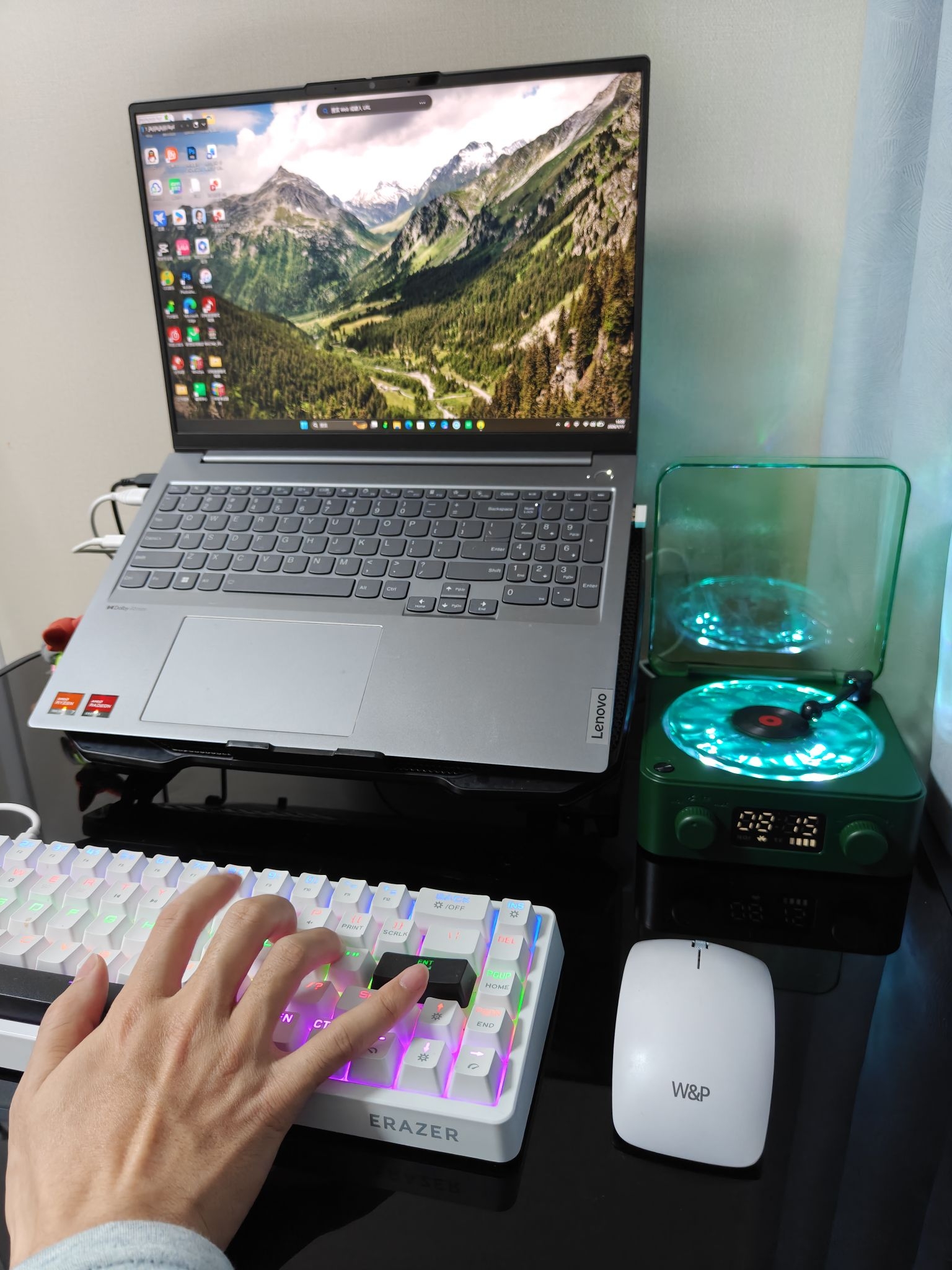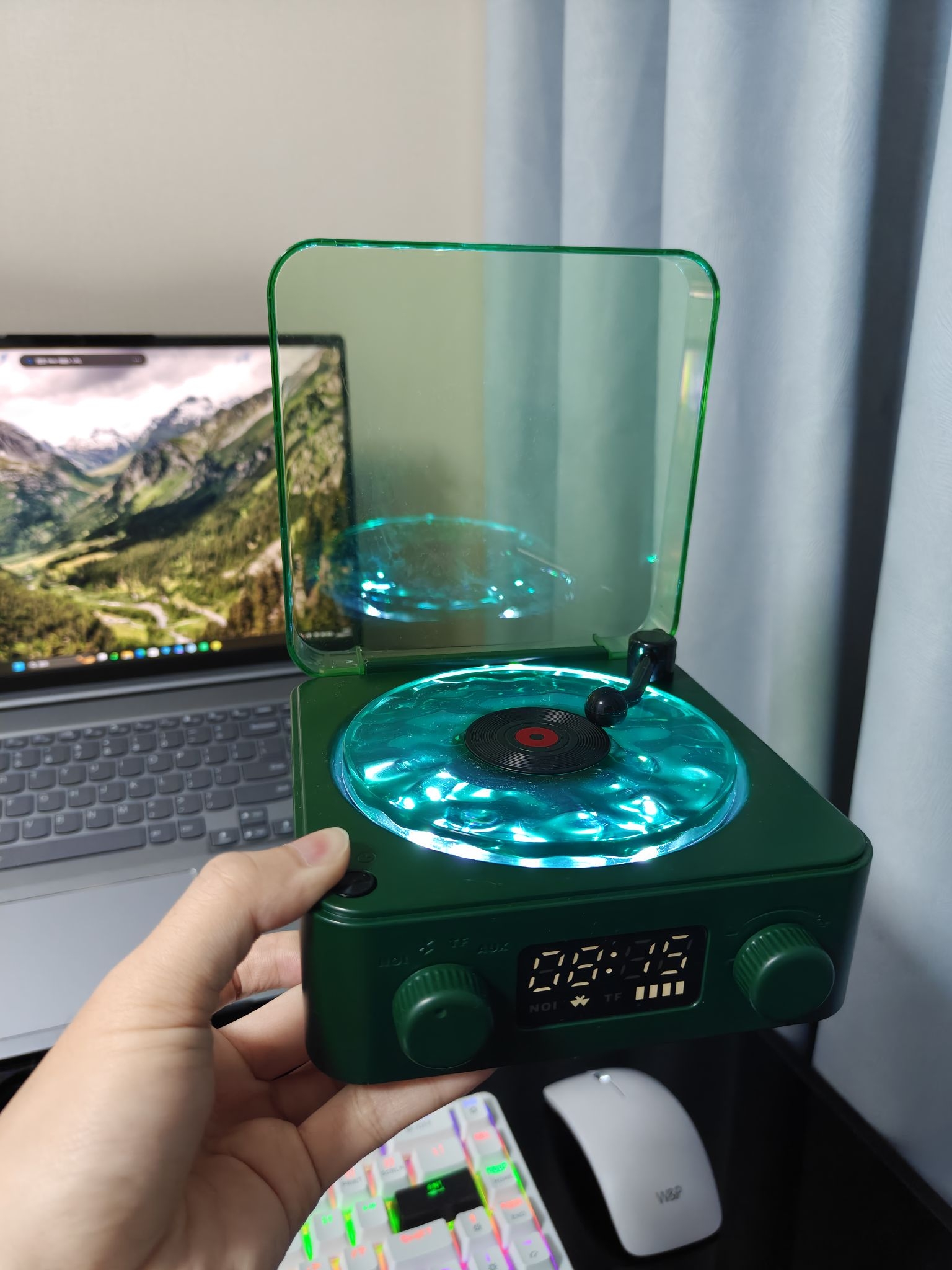 ⭐兄弟们,这桌面差了这个音箱是真的不行,氛围感是真的好强😍😍😍 ✅我这个1×1m²的桌面放这个联想的键盘⌨️、笔记本💻和开物的音箱刚刚好能放下,而且还有多余的空间可以放一些其他的🪴 ✅这款音箱我选择它当桌搭主要是因为它的颜值和音效🤩🤩,这款森林绿的配色加上留声机的设计是真的很好看👀,而且水波纹的灯光关灯看效果真的很好🌊🌊🌊,音质立体感也很好🥰 🥺你们觉得这个音箱怎么样呀,我的桌面需不需要再加一些什...