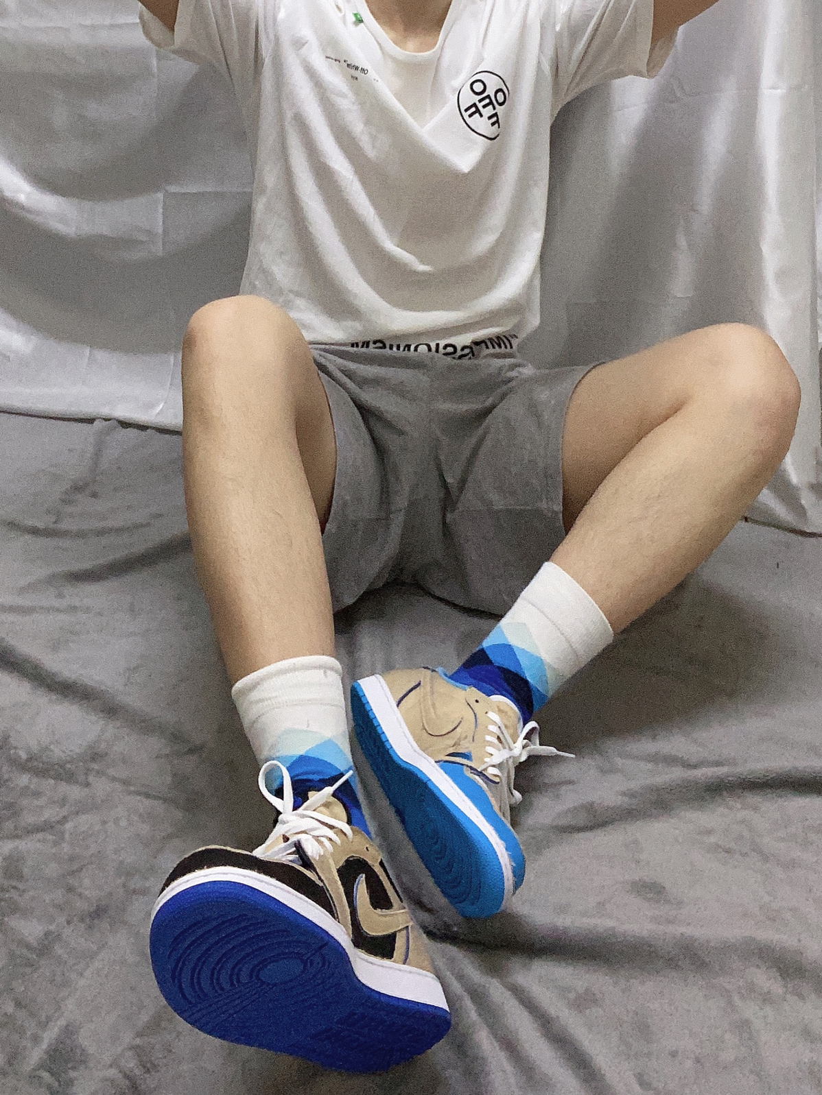 长袜渐变好帅! 这双渐变长袜 从白色渐变到蓝色 过渡到鞋子,很炸 搭配这双鸳鸯 浅蓝、深蓝都很搭配 蓝色球鞋都可以giao! 🧢帽子 NIKE保护地球 🥼OFF WHITE白色涂鸦粉箭头T恤 粉色箭头超级喜欢 🩳下身搭配Champion刺绣短裤 宽松舒适~夏天短裤首选! 不是我不换裤子!是因为太喜欢 买了三条换着穿~ 👟NIKE sbx AJ1Low 撕撕乐 撕掉后~充满夏天海的味道~