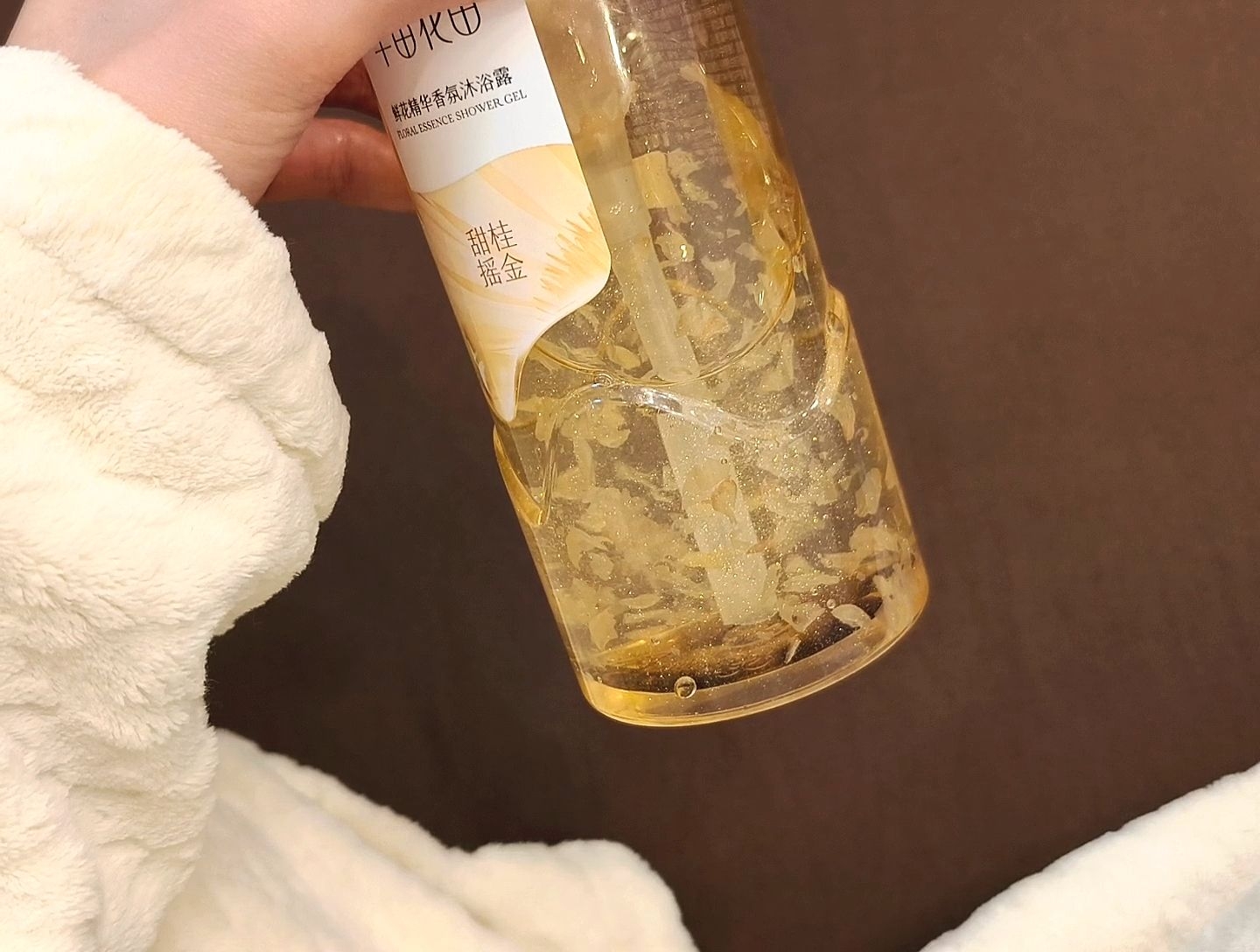 我终于找到了本命桂花香沐浴露!! 之前一直很痴迷那种温温柔柔又自带贵气的千金香 找了好久香水都没找到完全对味的 没想到竟然被这瓶半亩花田「甜桂摇金」拿捏了🥹 它不是那种很冲的工业香精味!! 挤出来居然能看到真实的冻干桂花瓣😳 味道就是特别还原的秋日金桂花香 甜丝丝的但是一点都不腻!! 像是傍晚散步时忽然闻到一阵桂花风 带着阳光晒过的温暖和一点点木质沉稳感 洗完整个浴室都是暖暖的桂花香~ 睡衣、被...
