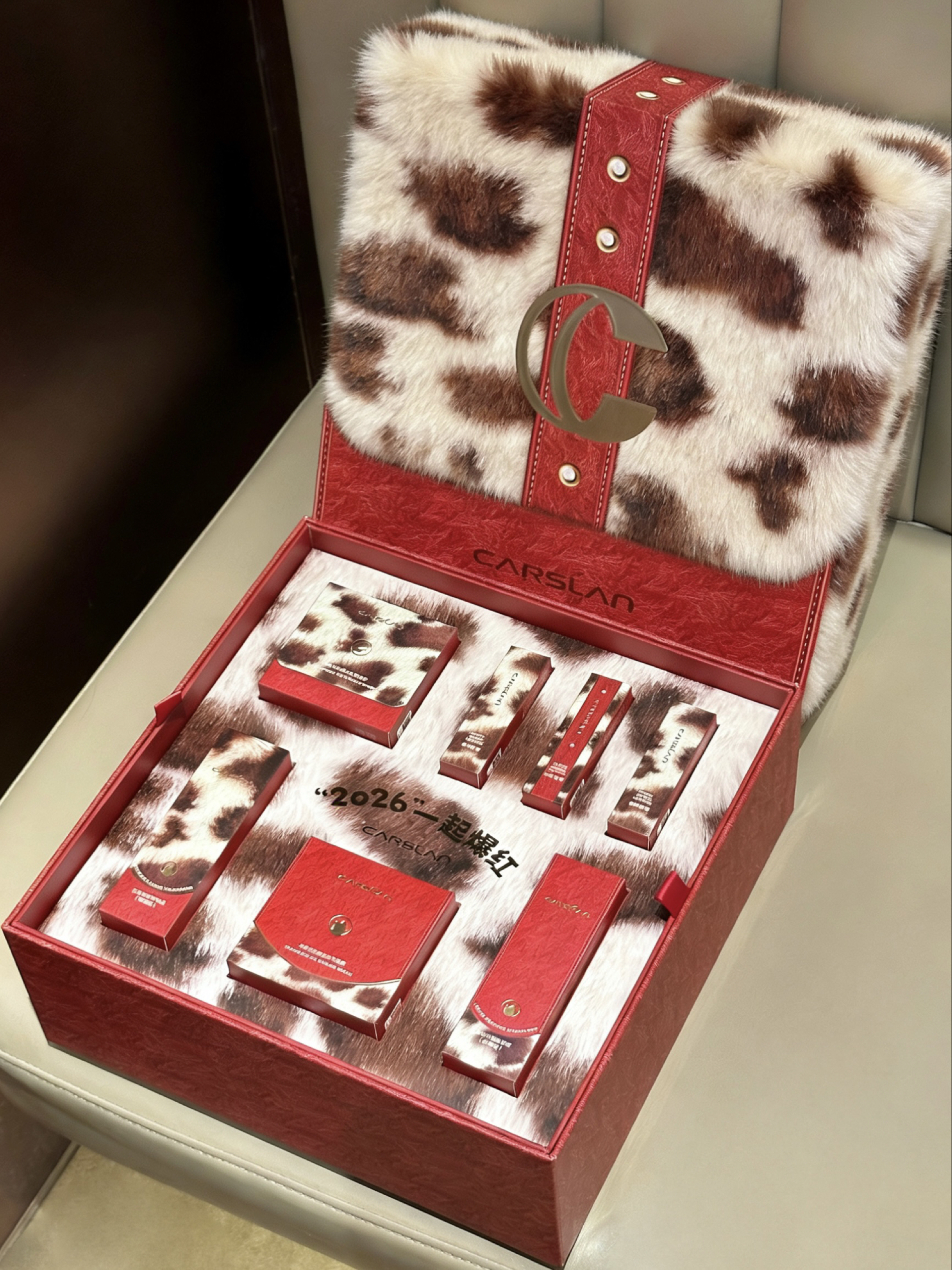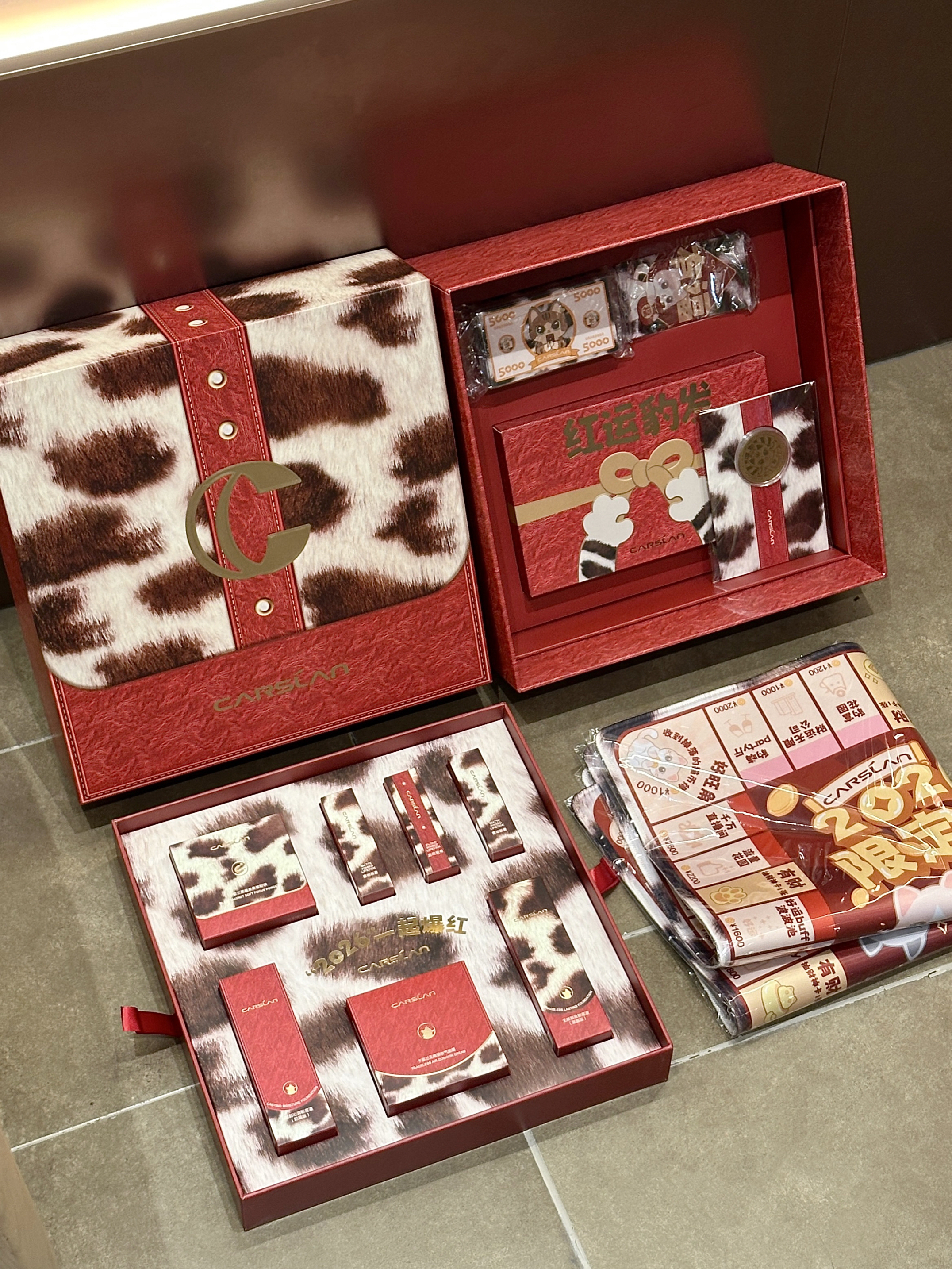 不懂就问 谁能拒绝介个豹红限定彩妆礼盒啊 这么一大盒 抱在怀里还是蛮有份量的 打开之后里面都是豹纹元素包装 看着也泰时髦了叭! 彩妆都是日常化妆能用到的 貌美又实用 还配了一套桌游套装 准备过年跟朋友们玩起来啦 不敢想象女孩子收到介个礼盒会有多幸福~