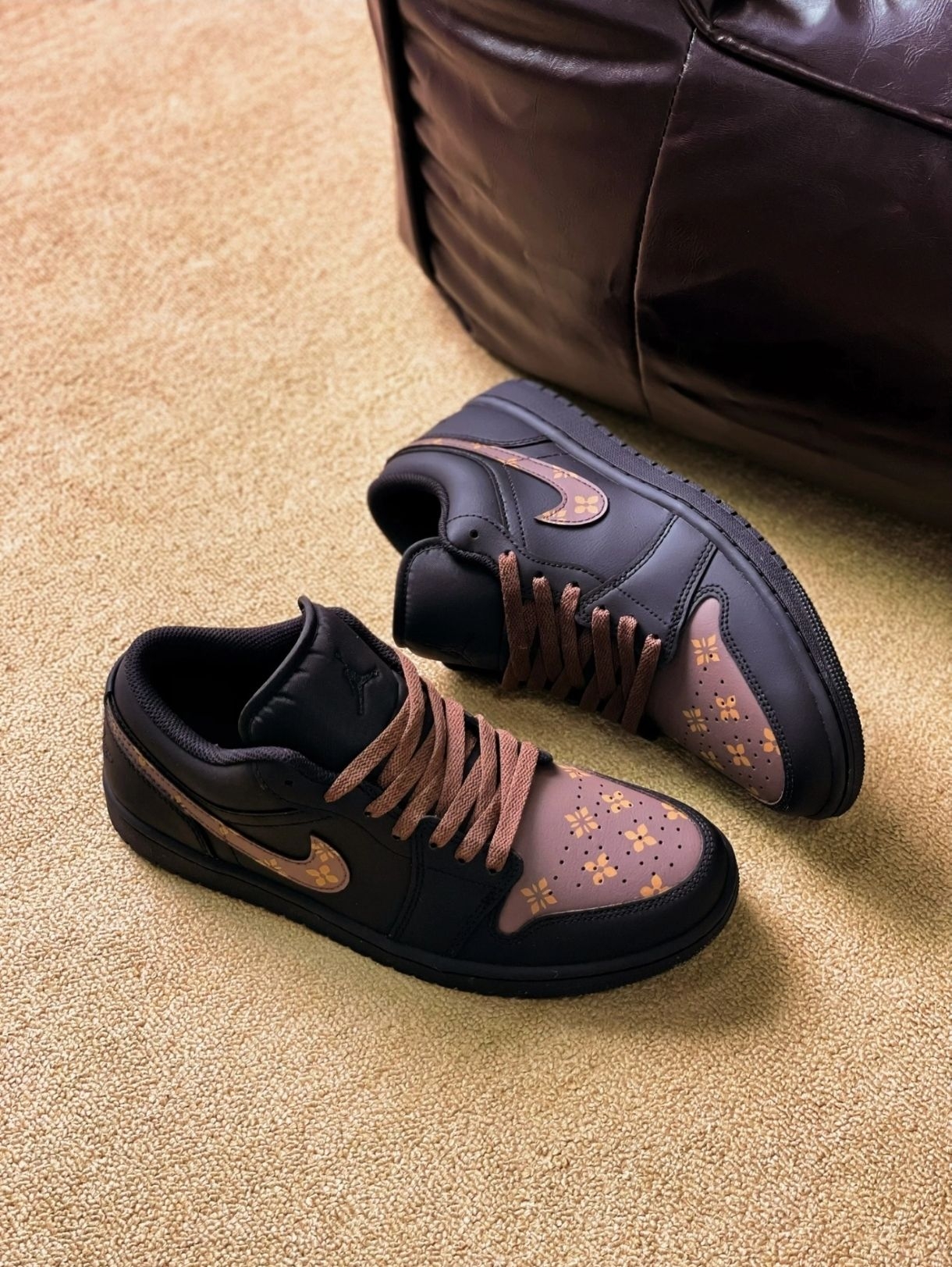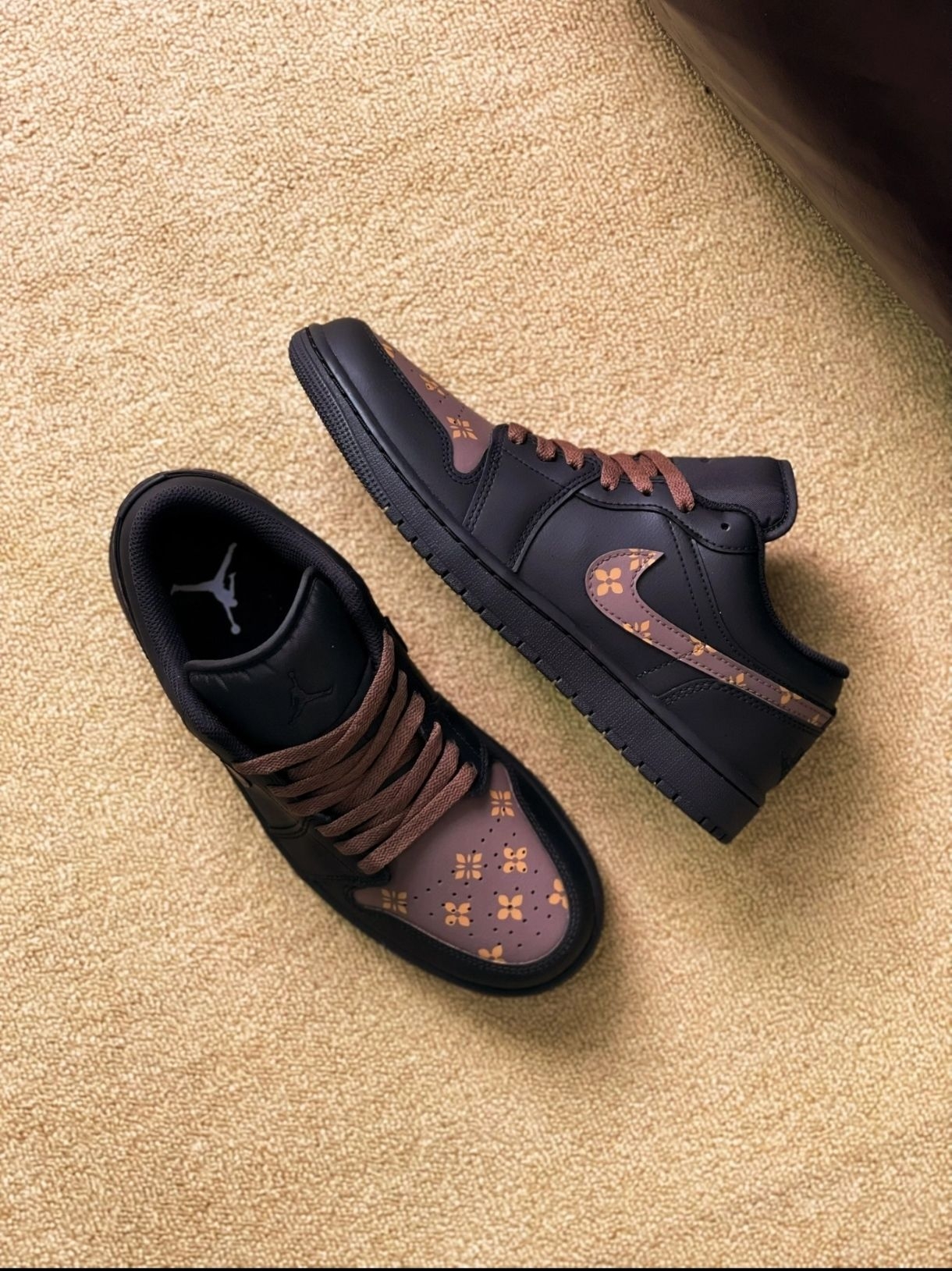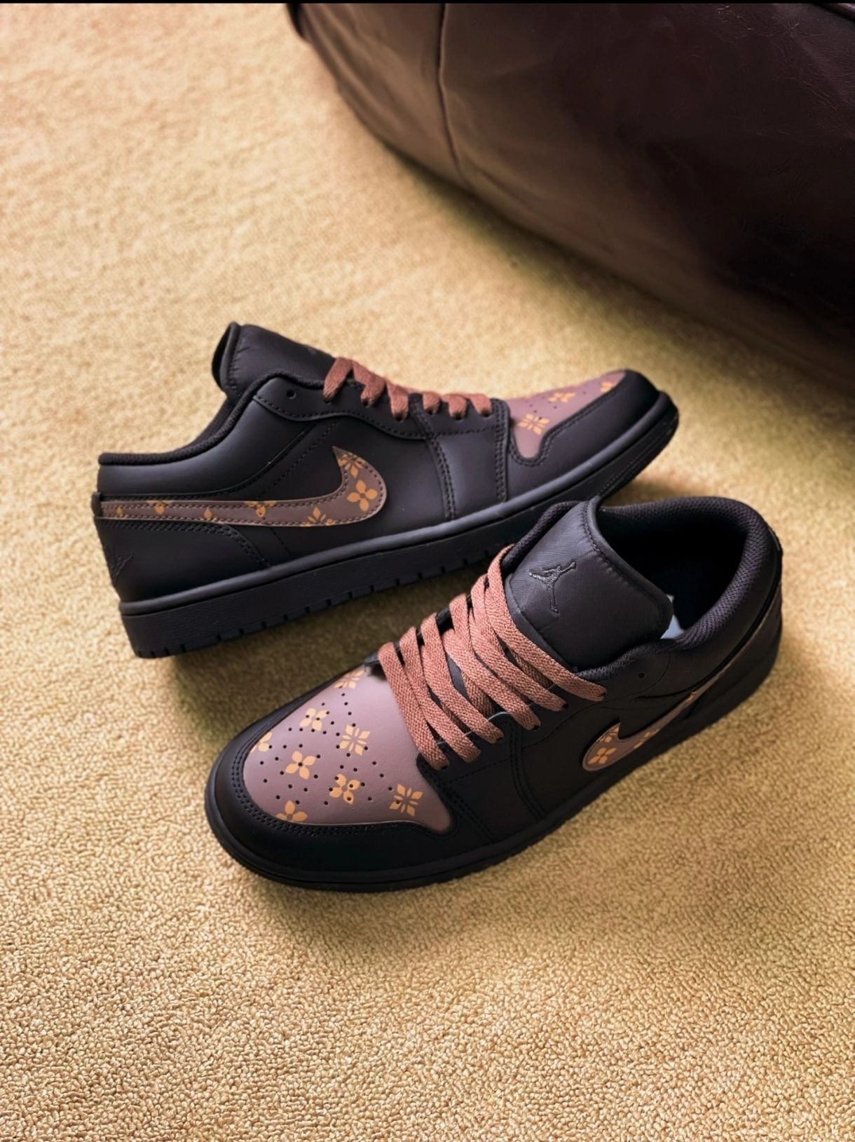这双黑棕配色的板鞋到手超惊喜,鞋头的花卉印花设计很别致,黑棕撞色低调又有层次感。鞋面材质摸起来很扎实,上脚包裹感很舒服,鞋底弹性也不错,走久了脚也不累。码数很标准,搭配牛仔裤、卫裤都很合适,日常穿颜值和实用性都拉满