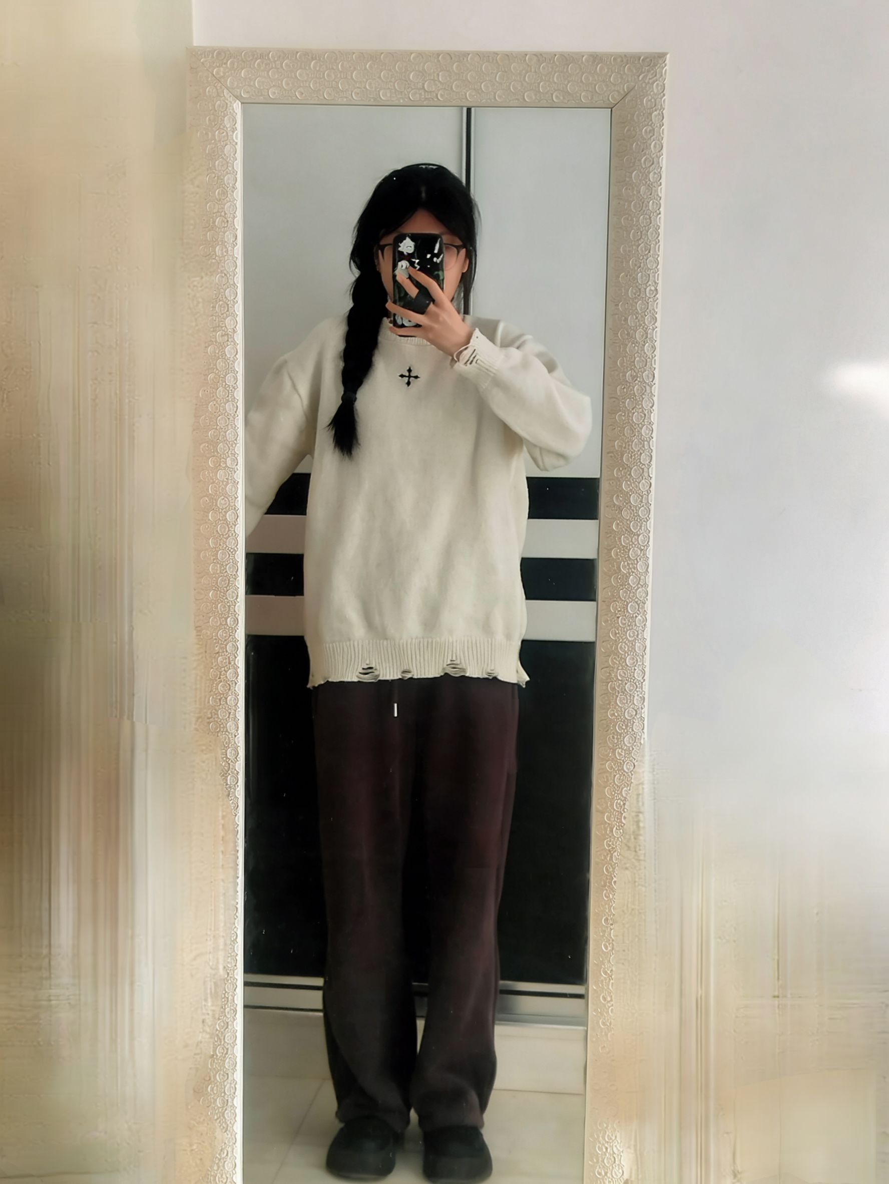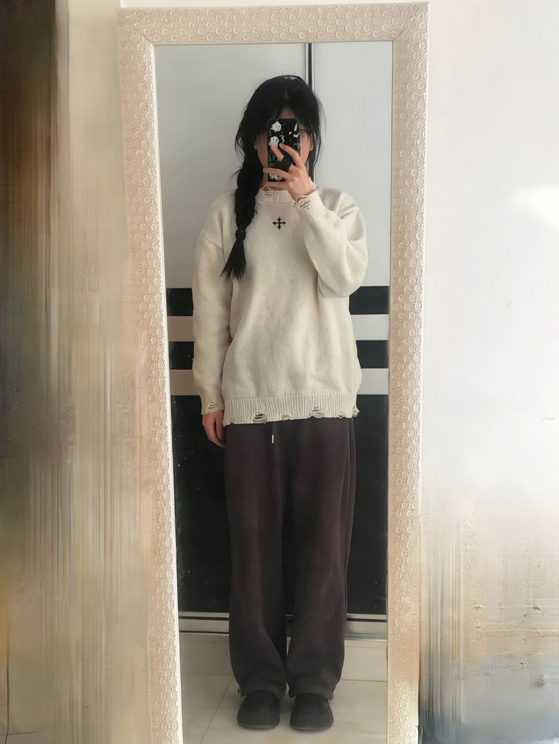 白色破洞毛衣自带随性慵懒感 微破设计增添设计感 宽松版型藏肉又显随性 软糯亲肤不扎身 搭配深灰色卫裤 简约又舒适 松紧腰+抽绳设计 活动自如不拖沓 一浅一深撞色 层次分明 日常通勤、逛街都适配 轻松打造高个子平价通勤风 慵懒中透着随性 舒适与颜值兼顾。