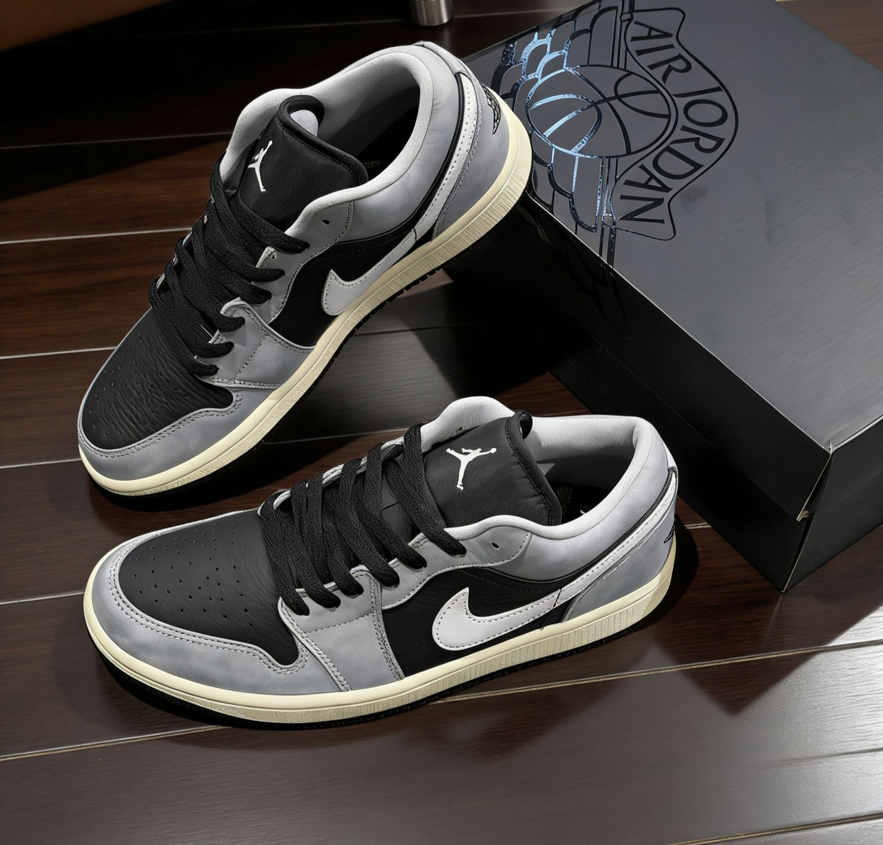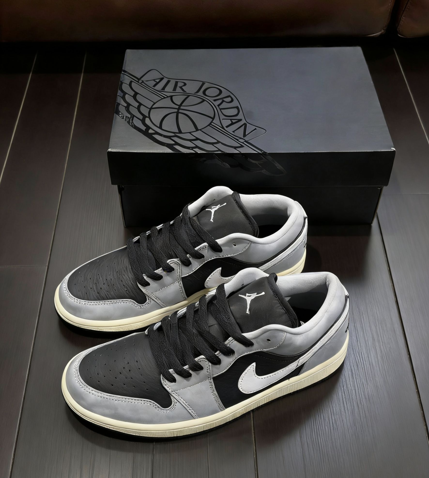 这双黑灰做旧AJ1 Low新入手的,每天出门基本都穿它。配色是高级的哑光黑搭水泥灰,鞋边的做旧米黄是点睛之笔,自带复古松弛感,完全不用费心打理。 上脚很软,鞋楦贴合脚型,走路逛街一下午都不闷脚。我穿着它通勤搭西裤、周末配牛仔裤、打球搭运动裤都好看,属于闭眼搭不踩雷的款。
