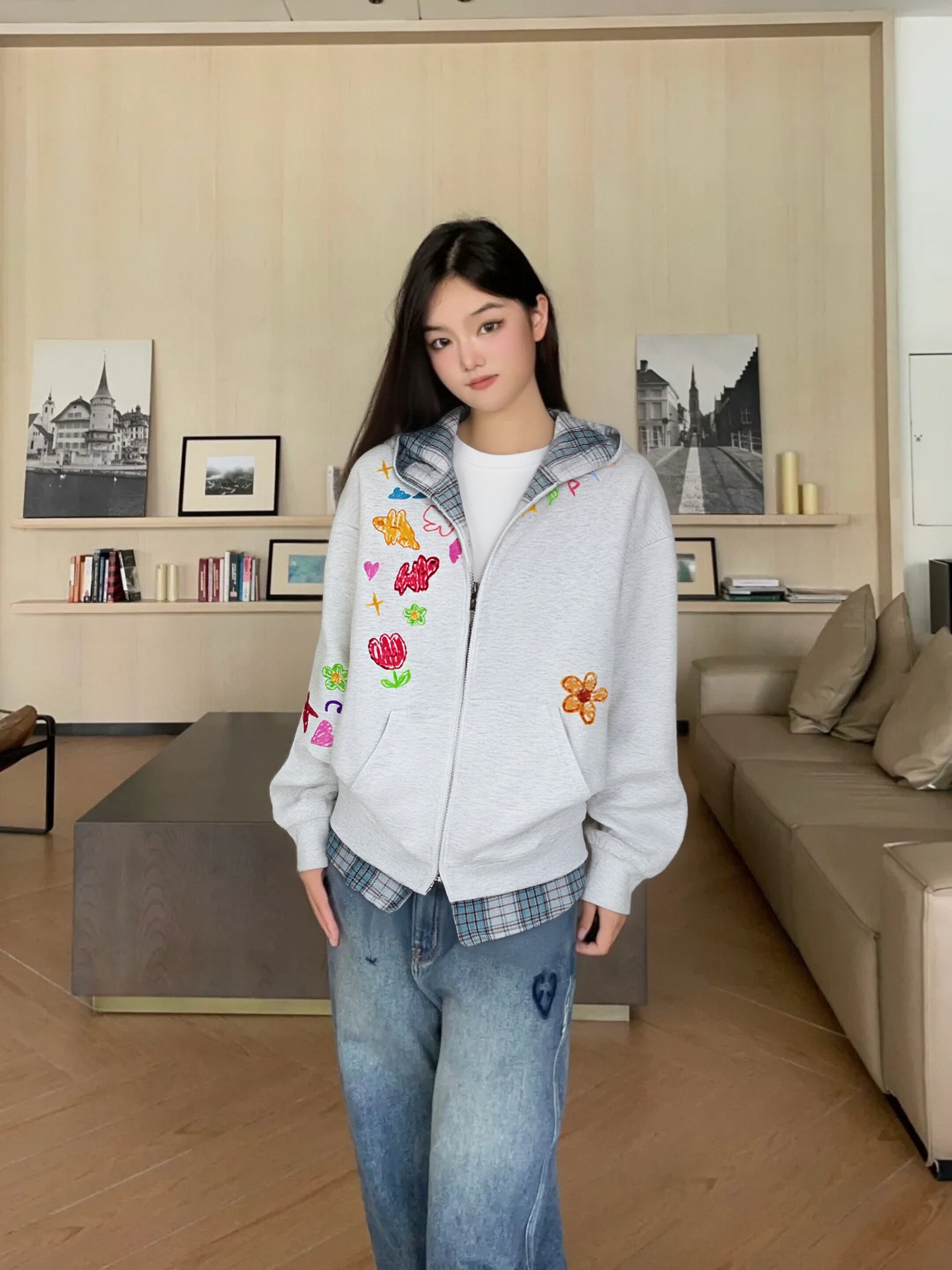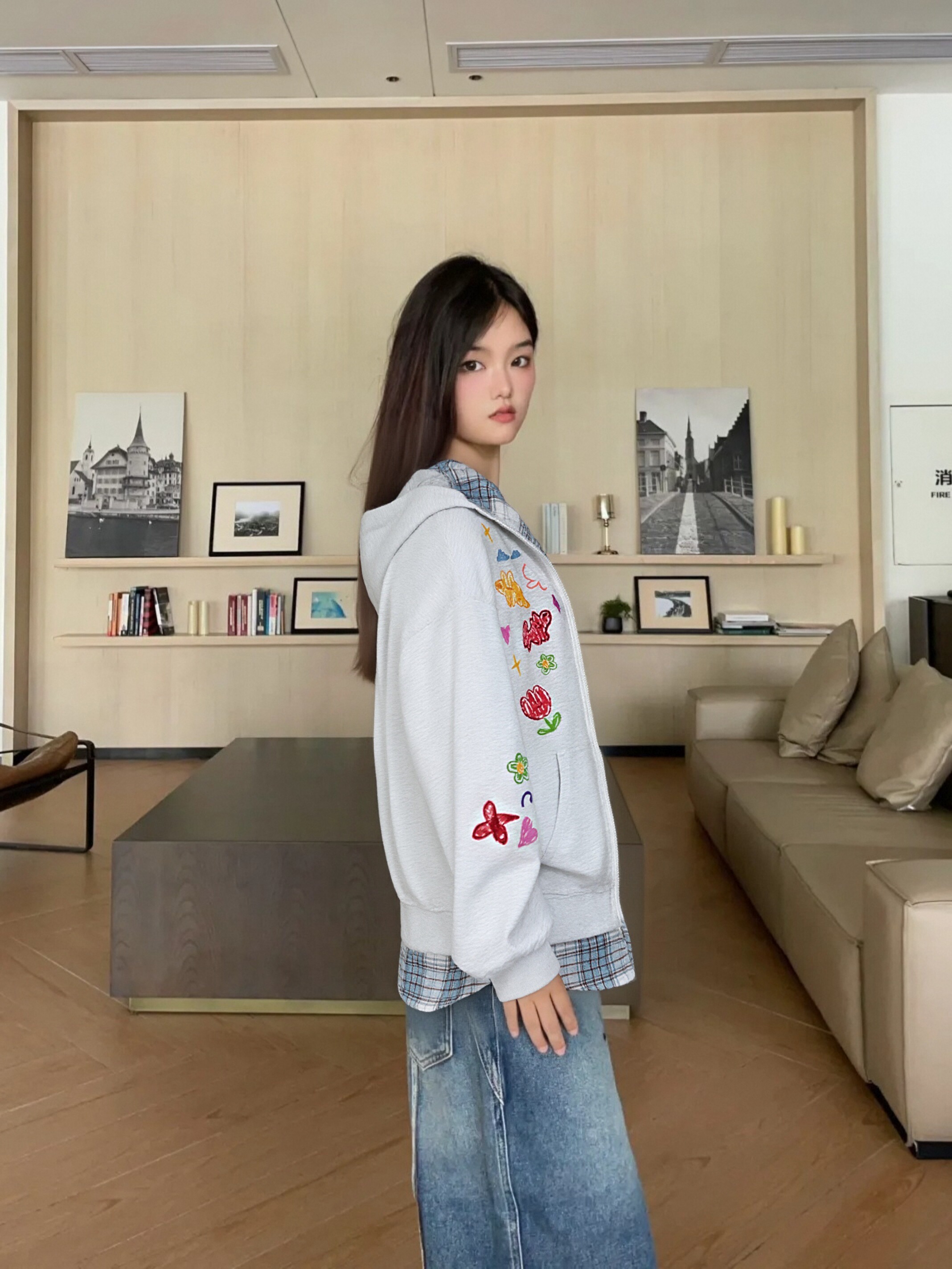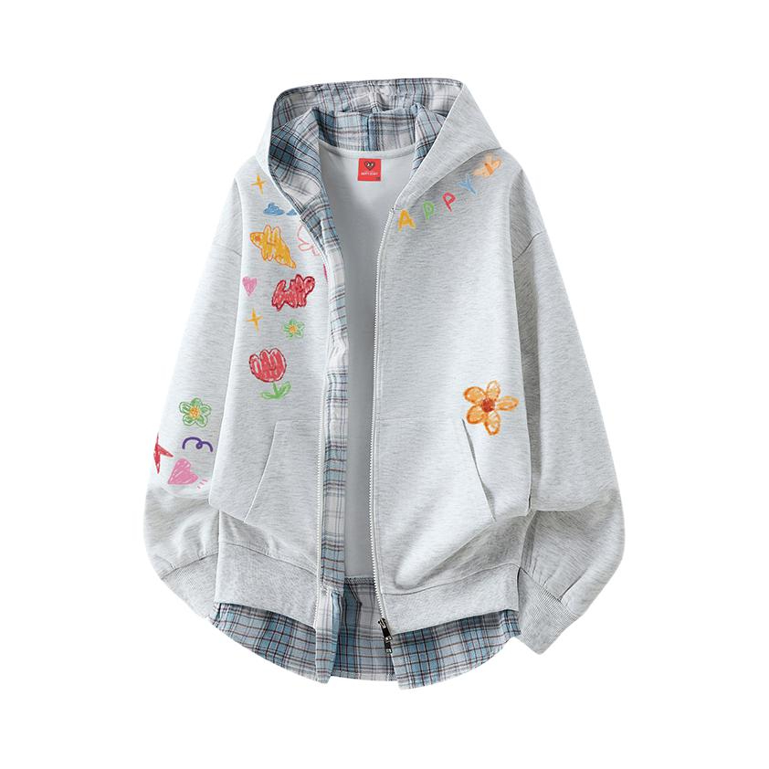 这件假两件外套真的是懒人福音!浅灰色调温柔又高级,彩色涂鸦点缀得恰到好处,格纹下摆和内衬的设计让整体更有层次。配牛仔裤就是松弛感满满,随便一穿都好看,秋冬必备!