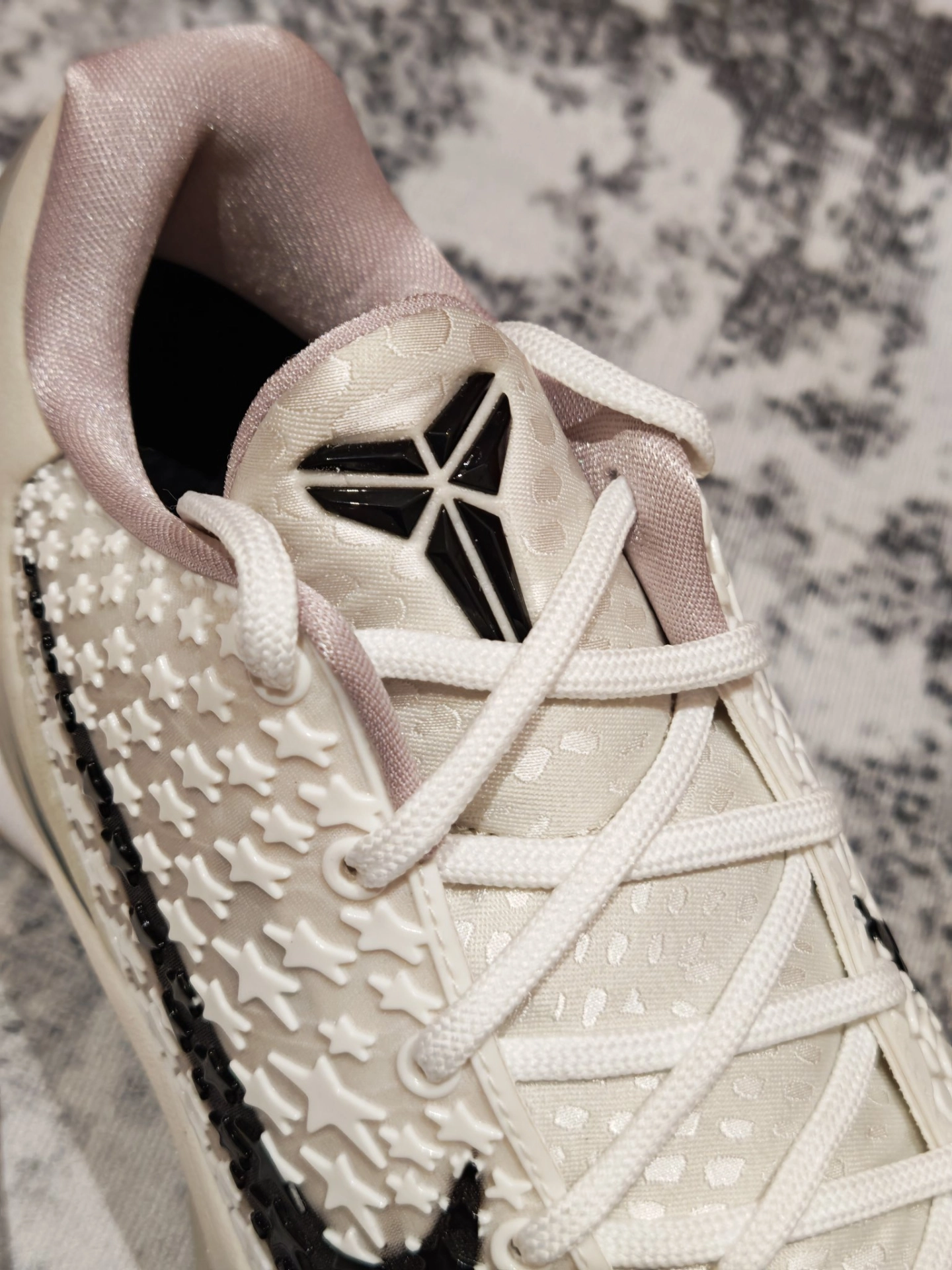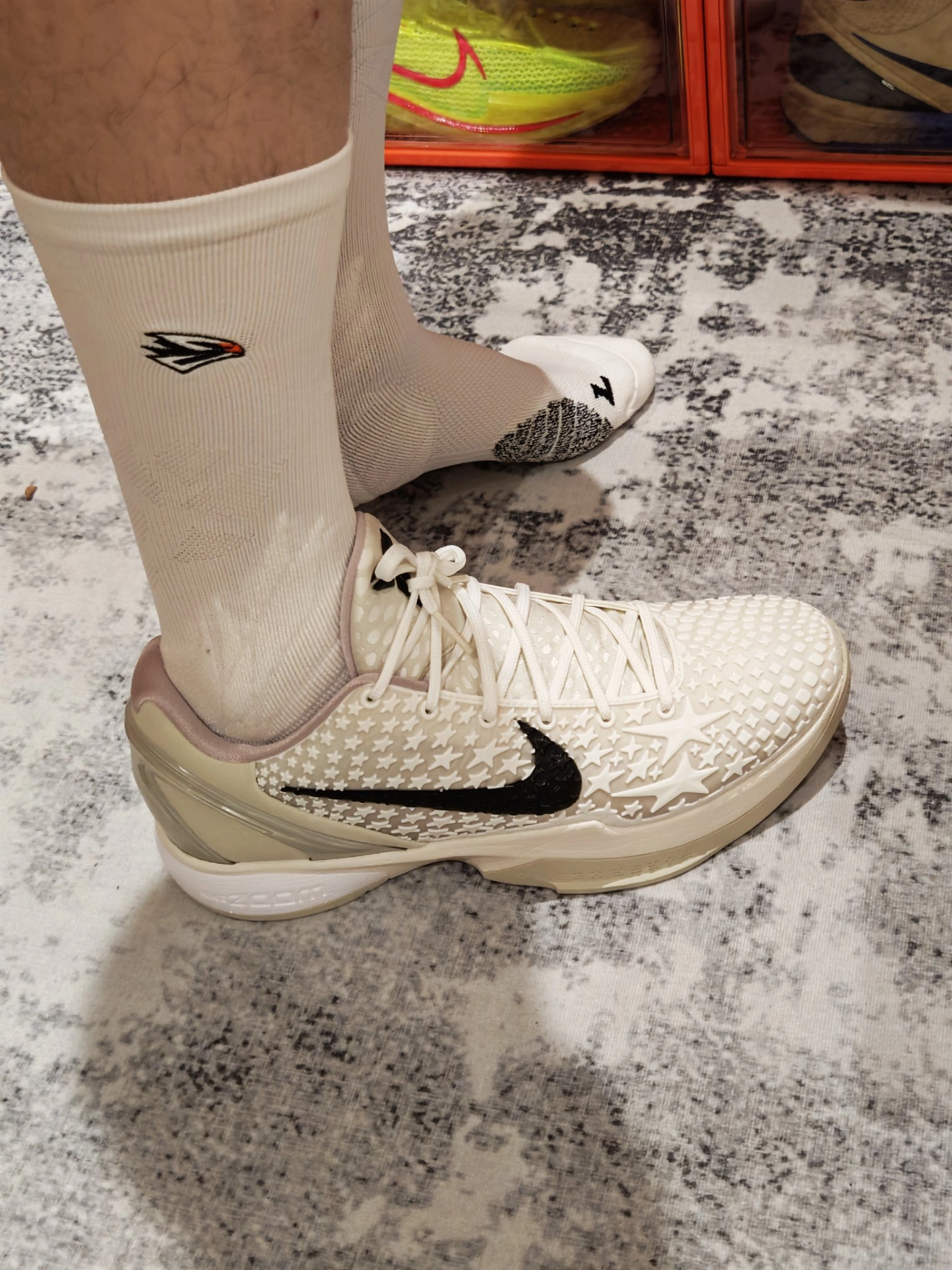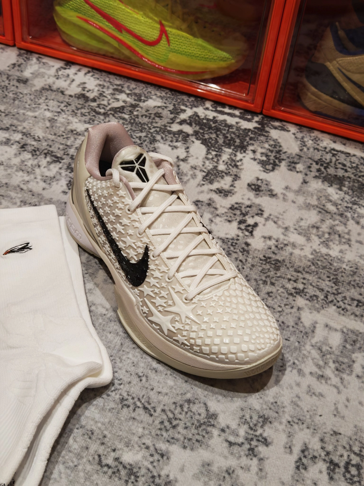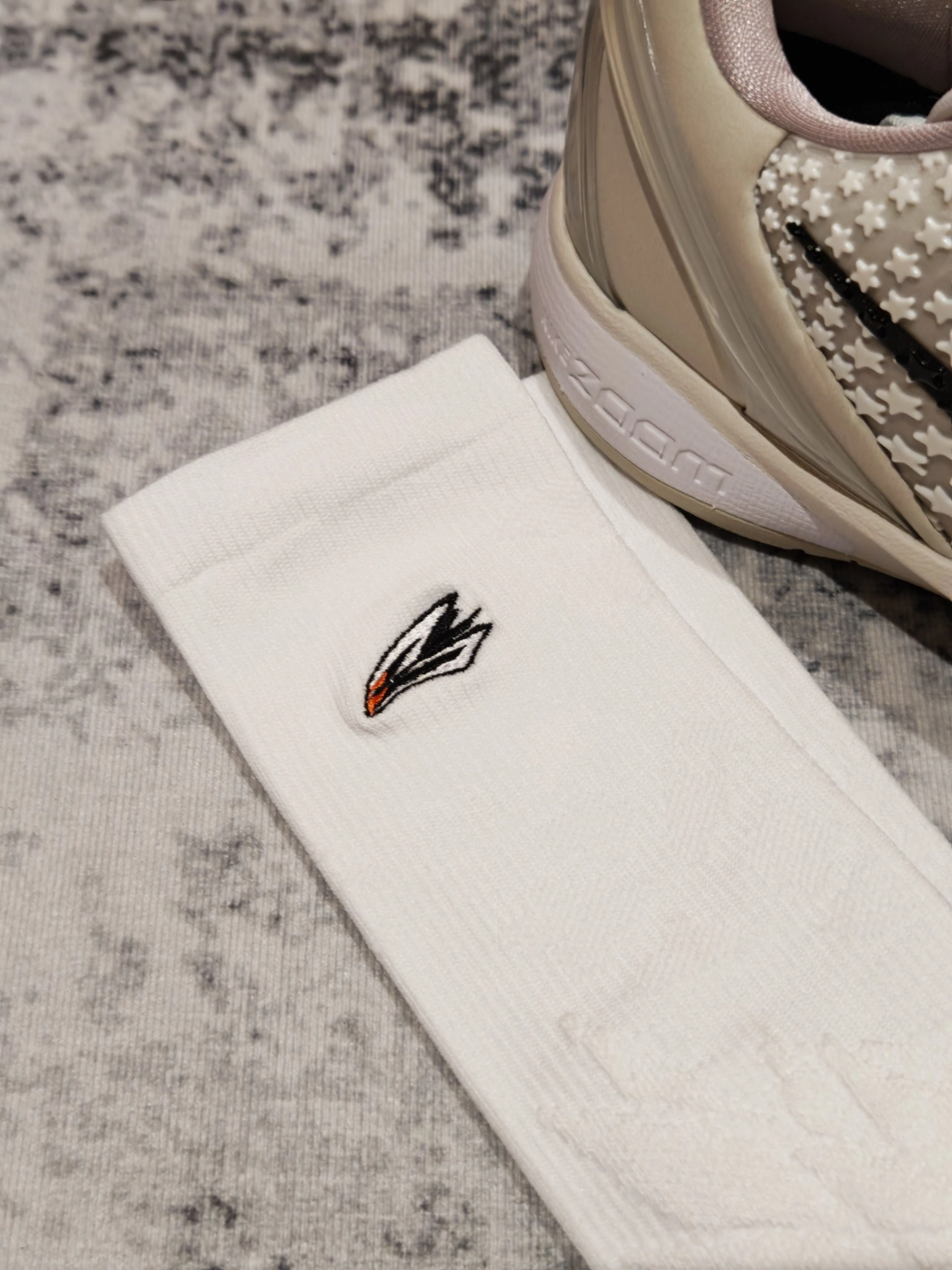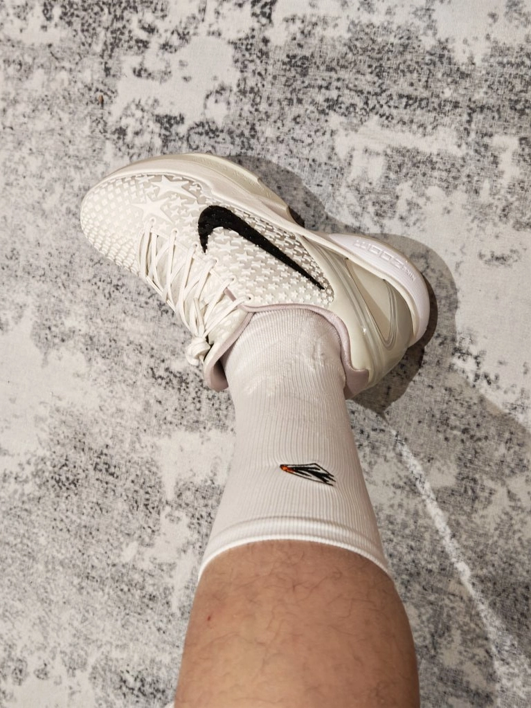 今天的#鞋袜搭配计划 玩的是全白精英风,这套“白袜+白鞋”CP,把低调高级感直接拉满,球场出街都能稳站C位。 鞋子我选的是Kobe 6 Protro 全明星,全白鞋身满印星星纹理,搭配黑色Swoosh点睛,干净利落里藏着华丽细节,水晶底更是把精致感拉满。鞋型流畅又百搭,加上科比战靴的实战底子,不管是球场变向、急停,还是日常出街暴走,都能轻松hold住,颜值与性能双在线。 袜子我pick的是维动...