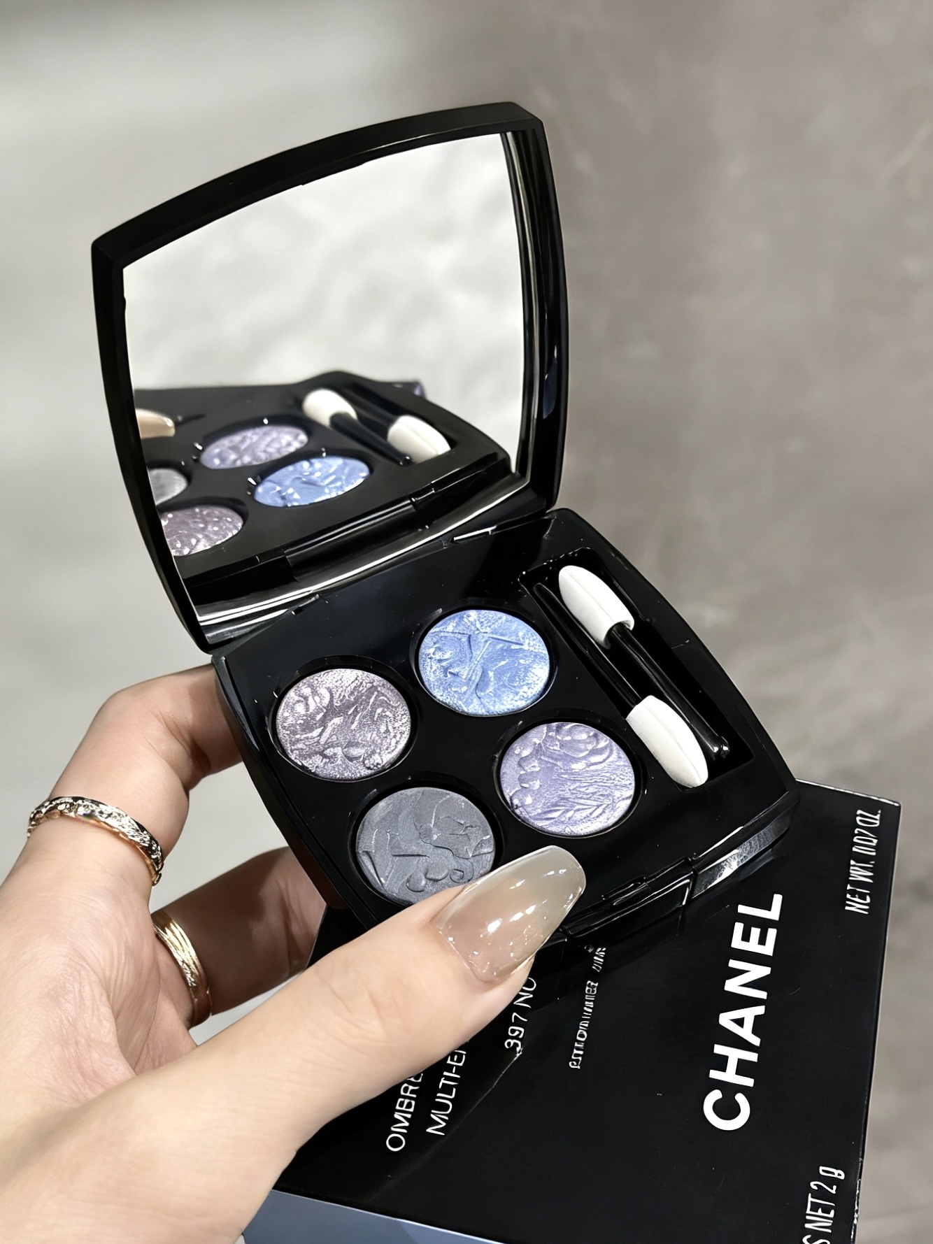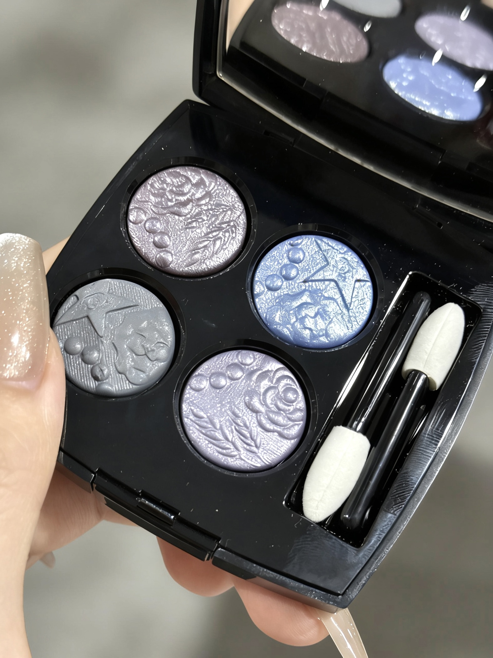 香奈儿这盘蓝紫眼影直接把清冷感拿捏了 这浮雕花纹精致得像艺术品 蓝紫细色闪上眼是碎钻星河的效果 灰调打底又能中和跳脱感 其实日常涂也不突兀 质地丝滑显色 好晕染叠加也不会显脏 约会 聚会涂它直接成为焦点 画出来的眼妆hin有特点 清冷感满满