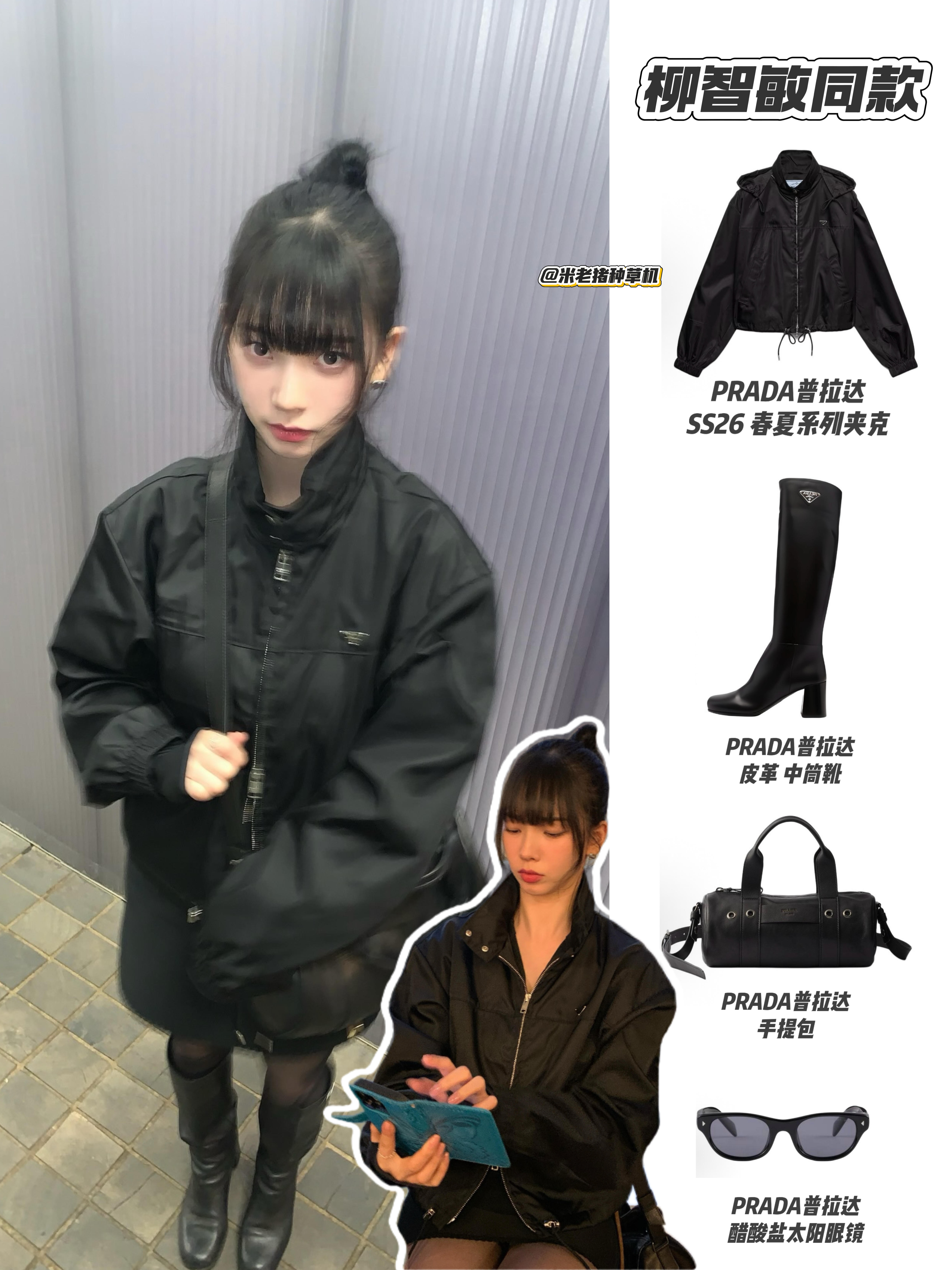 柳姐全黑穿搭把松弛随性的活人感拉满!宽松的PRADA夹克自带慵懒随性的氛围,没有刻意紧绷的精致感。黑丝+高跟长靴又悄悄透出小性感,再配上随性的丸子头和墨镜,整个造型自在又不费力,完美诠释了街头时髦精的松弛感,让人觉得真实又有魅力。