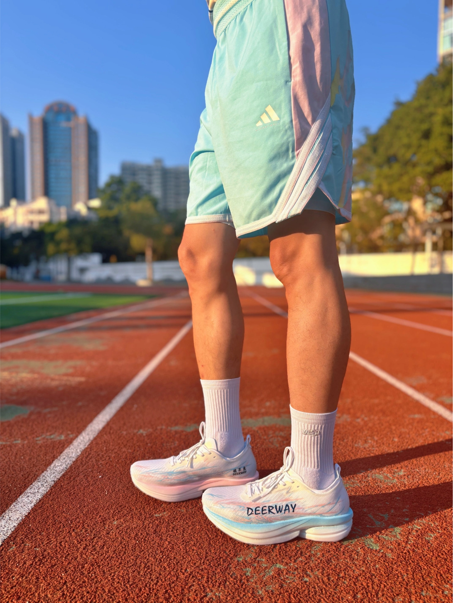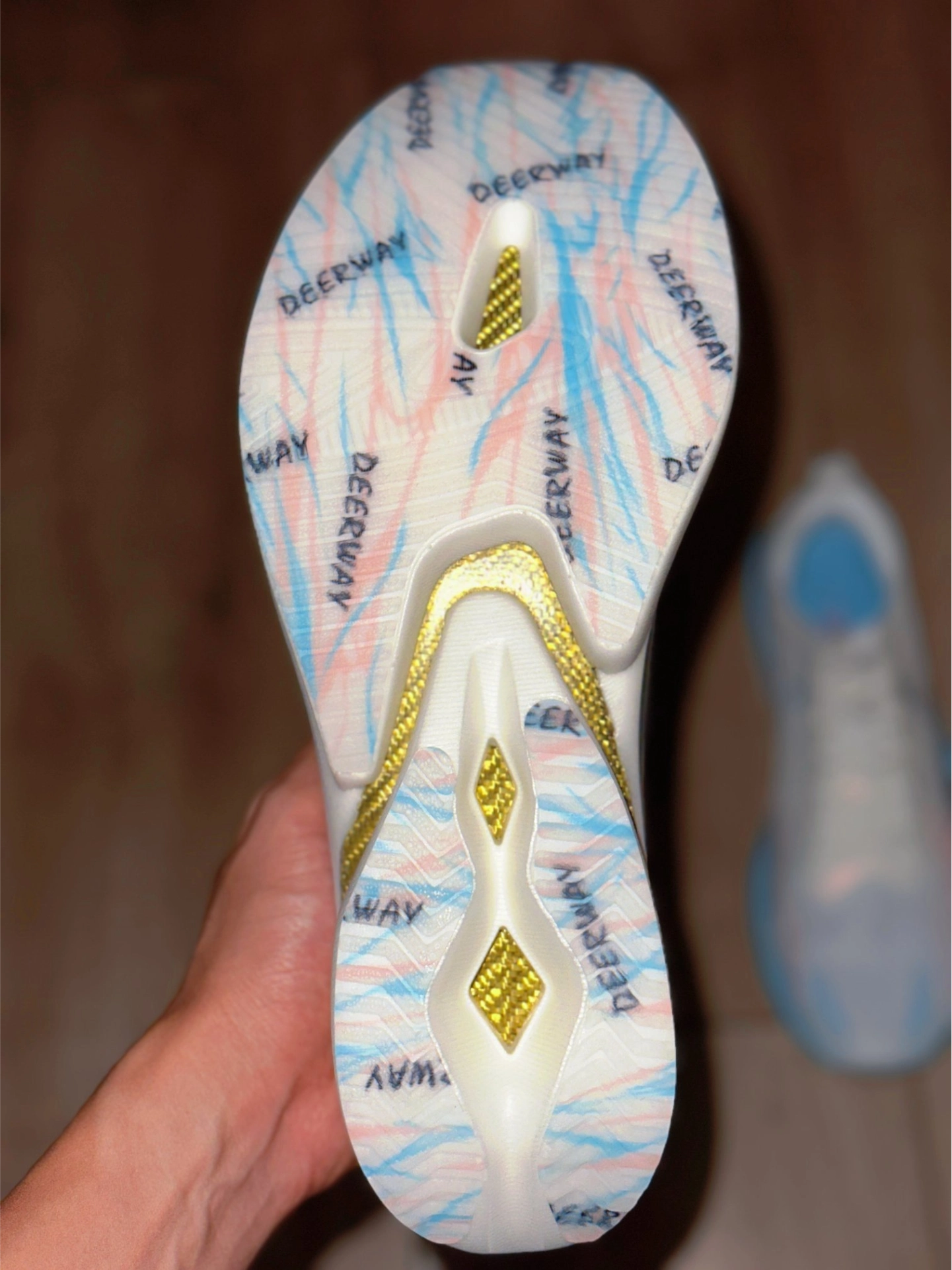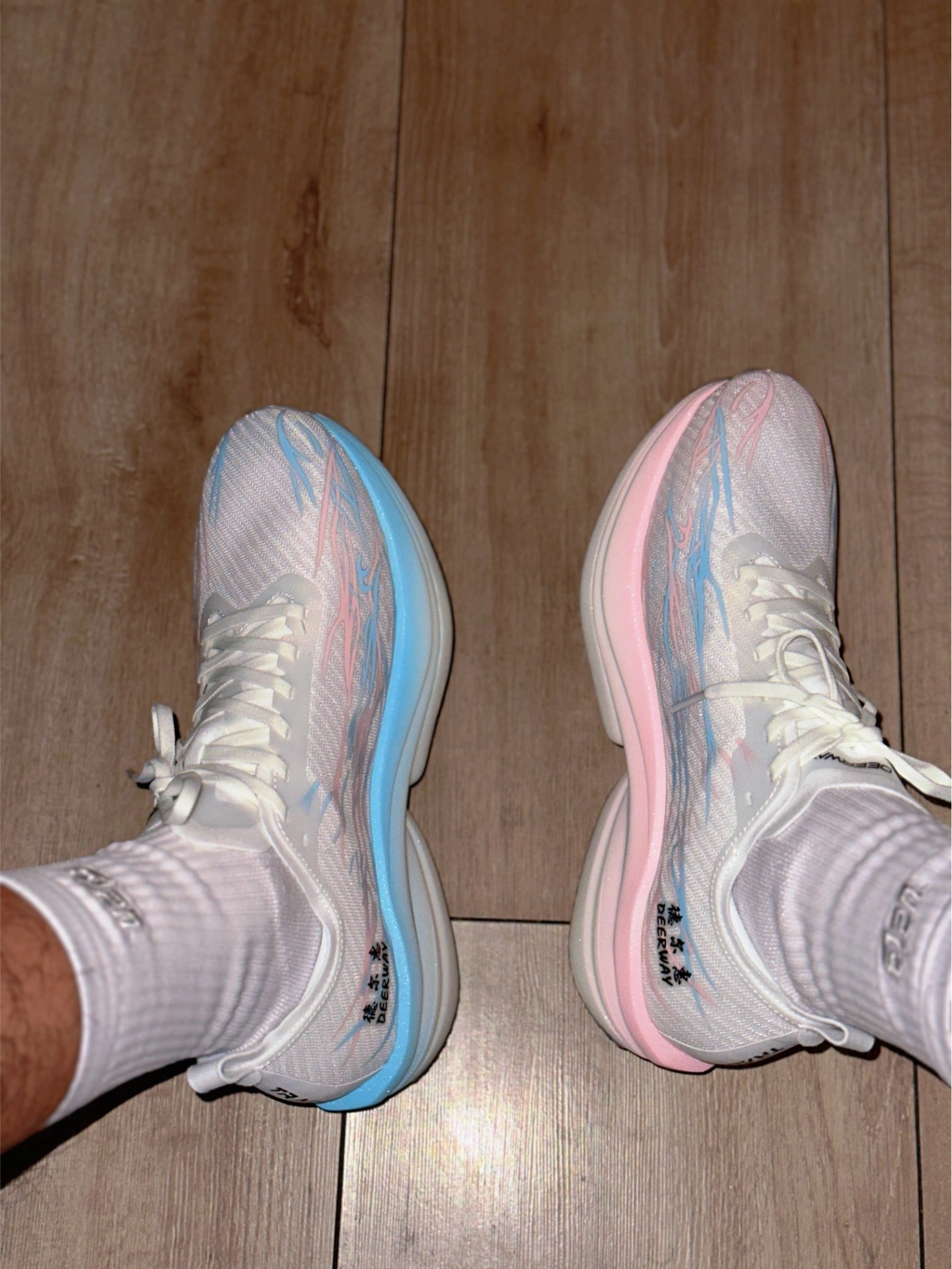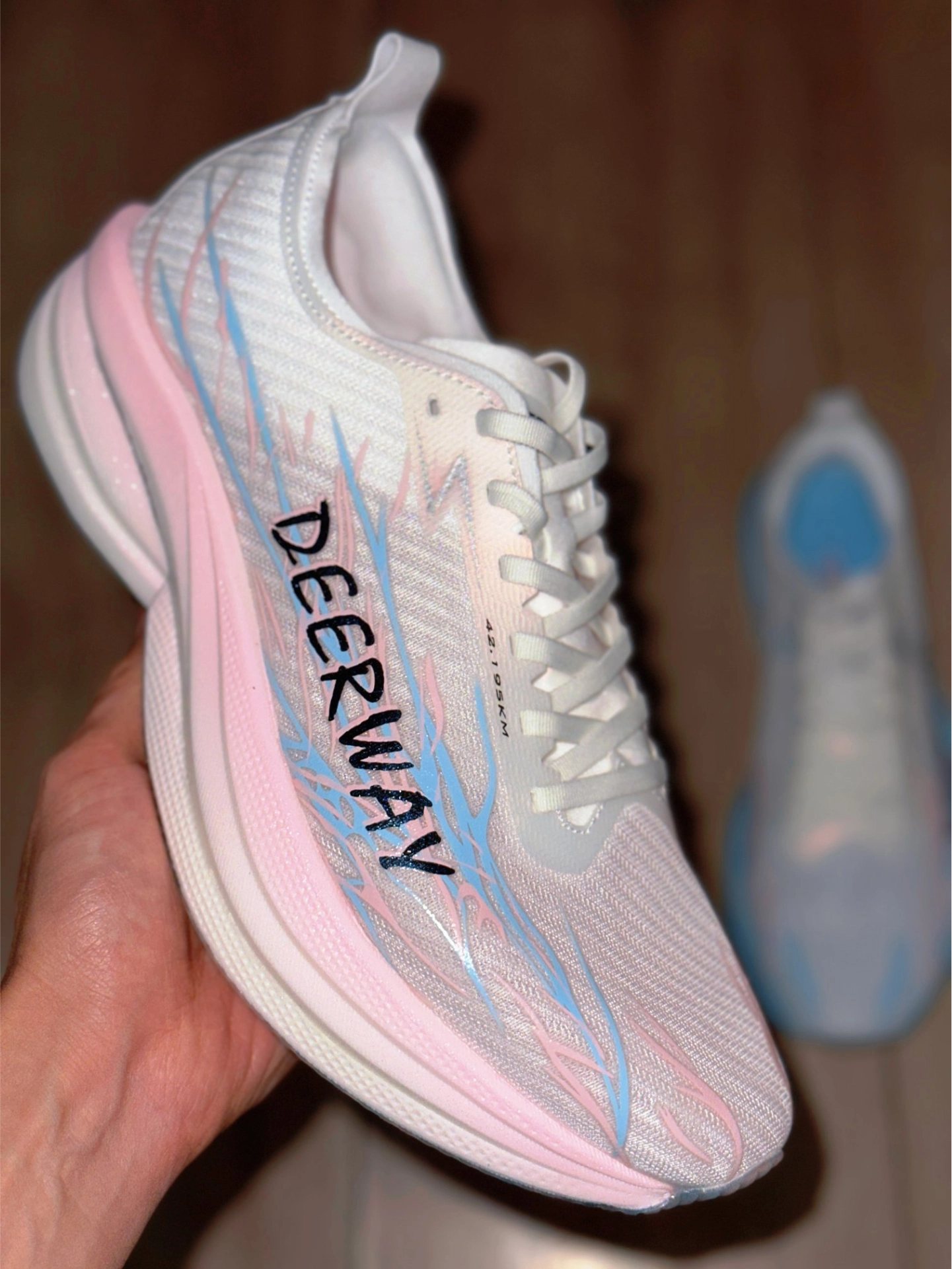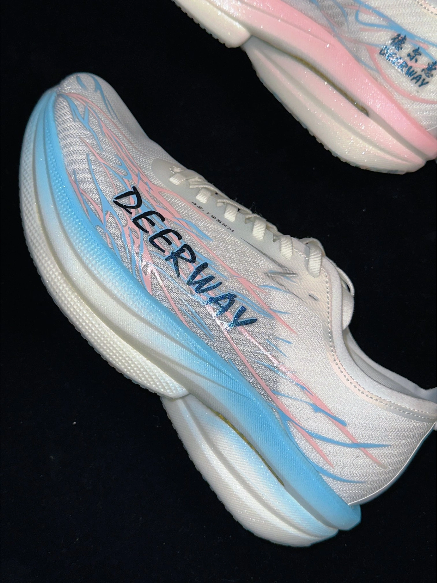 这双德尔惠的蓝粉鸳鸯闪电⚡4x4黄金碳板颜值太高了🤟🤟🤟感觉拍了十张图片都不够展现它的美,鸳鸯配色是那种莫兰迪色系,都是淡淡的色,然后中底材料还加了很多闪粉在里面。后面几张特写都可以看到。真的很美[惊喜_blue][惊喜_blue][惊喜_blue] 配置也很给力,4×4橡胶大底是CPU防滑款,比普通橡胶更轻更耐磨;全掌黄金碳板+超临界EVA中底,支撑回弹拉满,跑步更高效还护脚;涤纶鱼丝鞋面韧实...