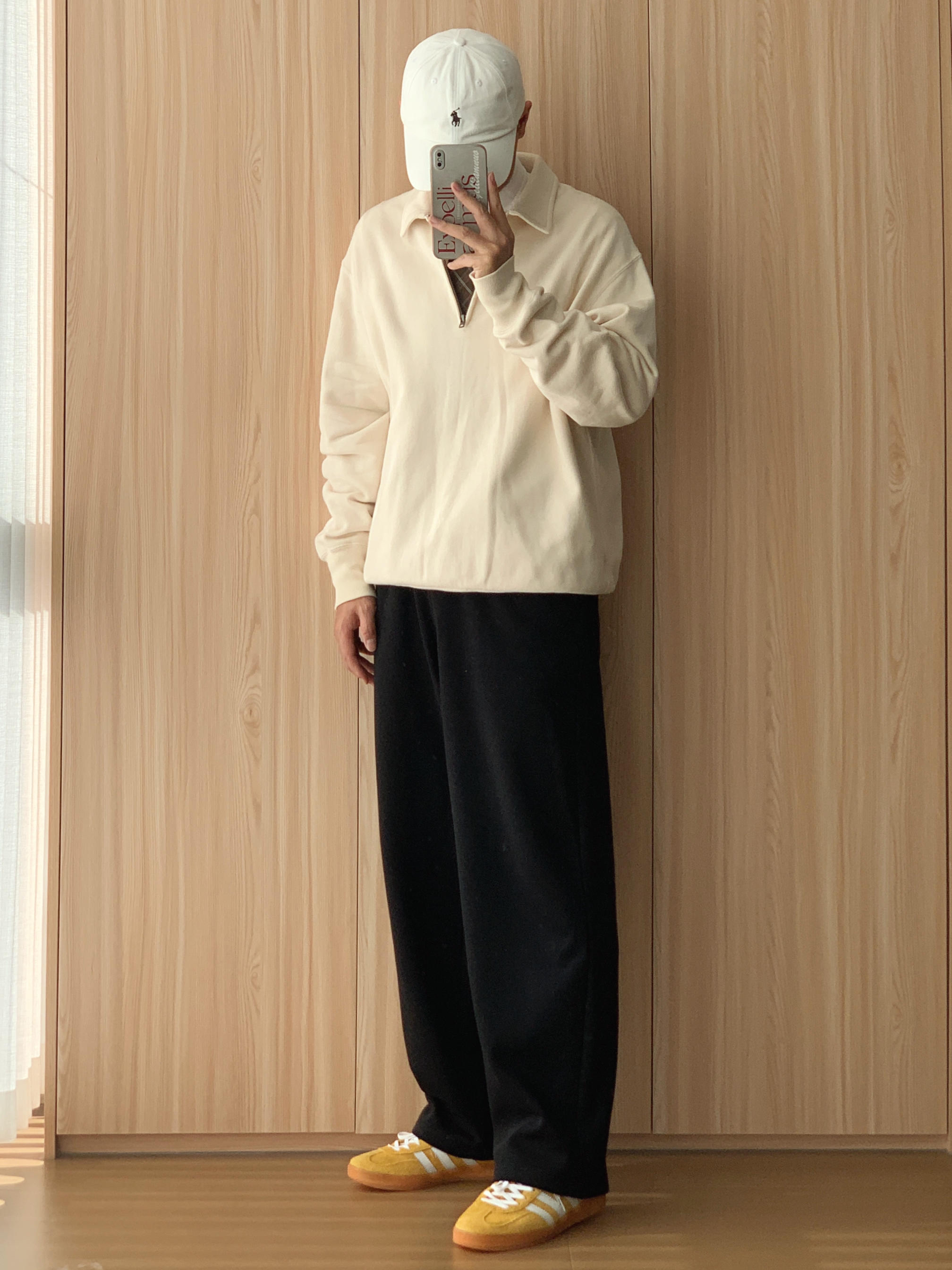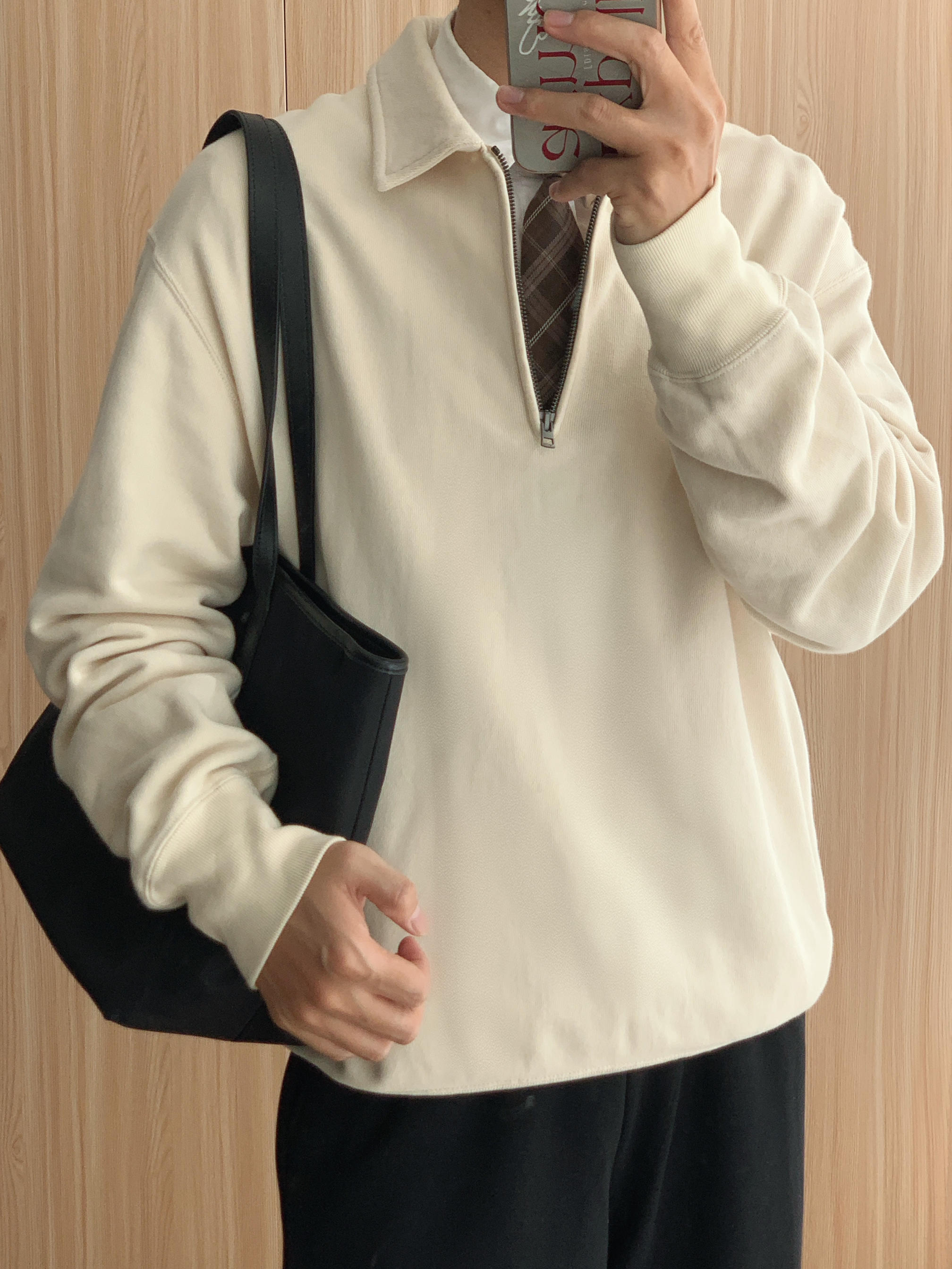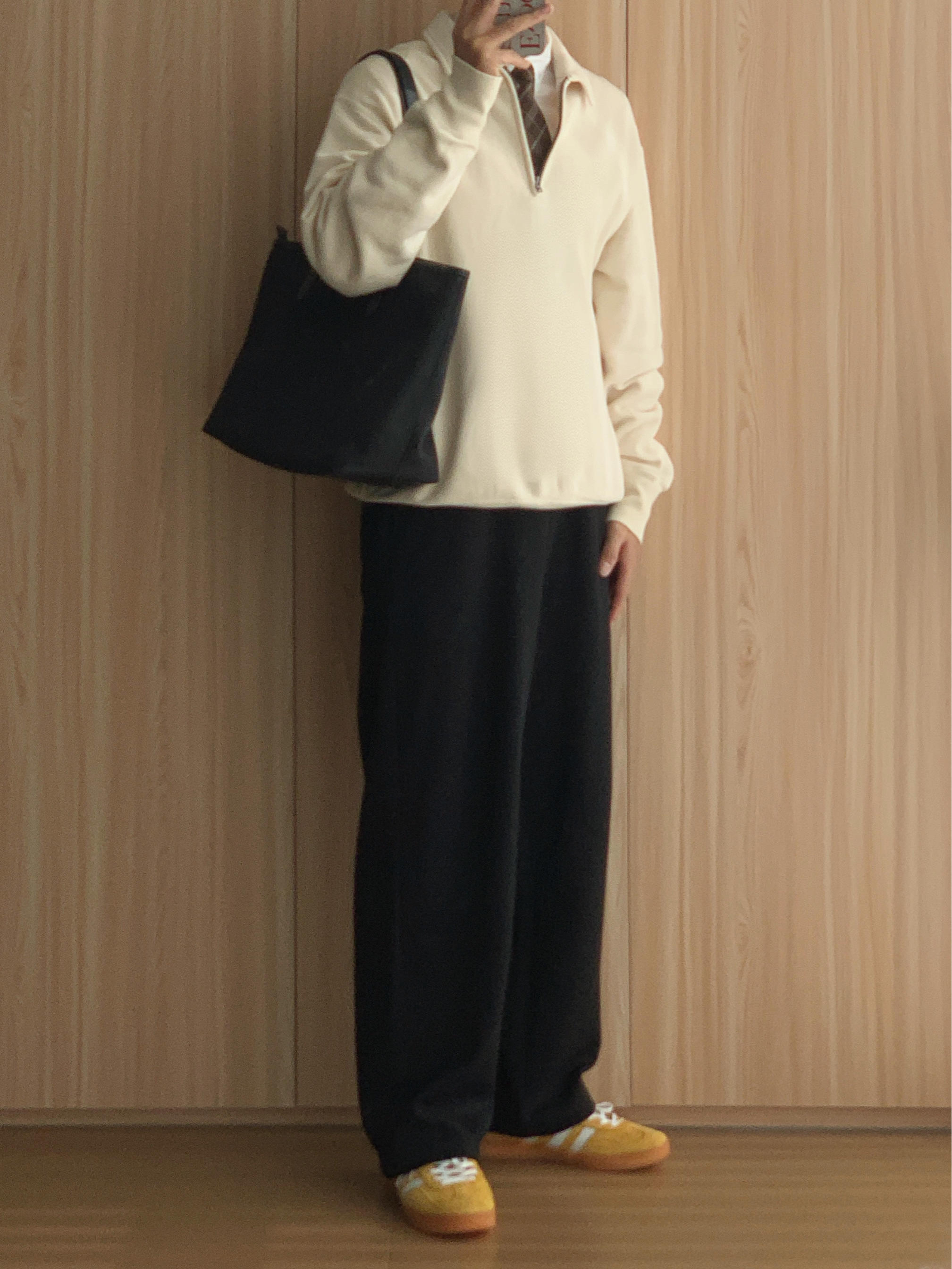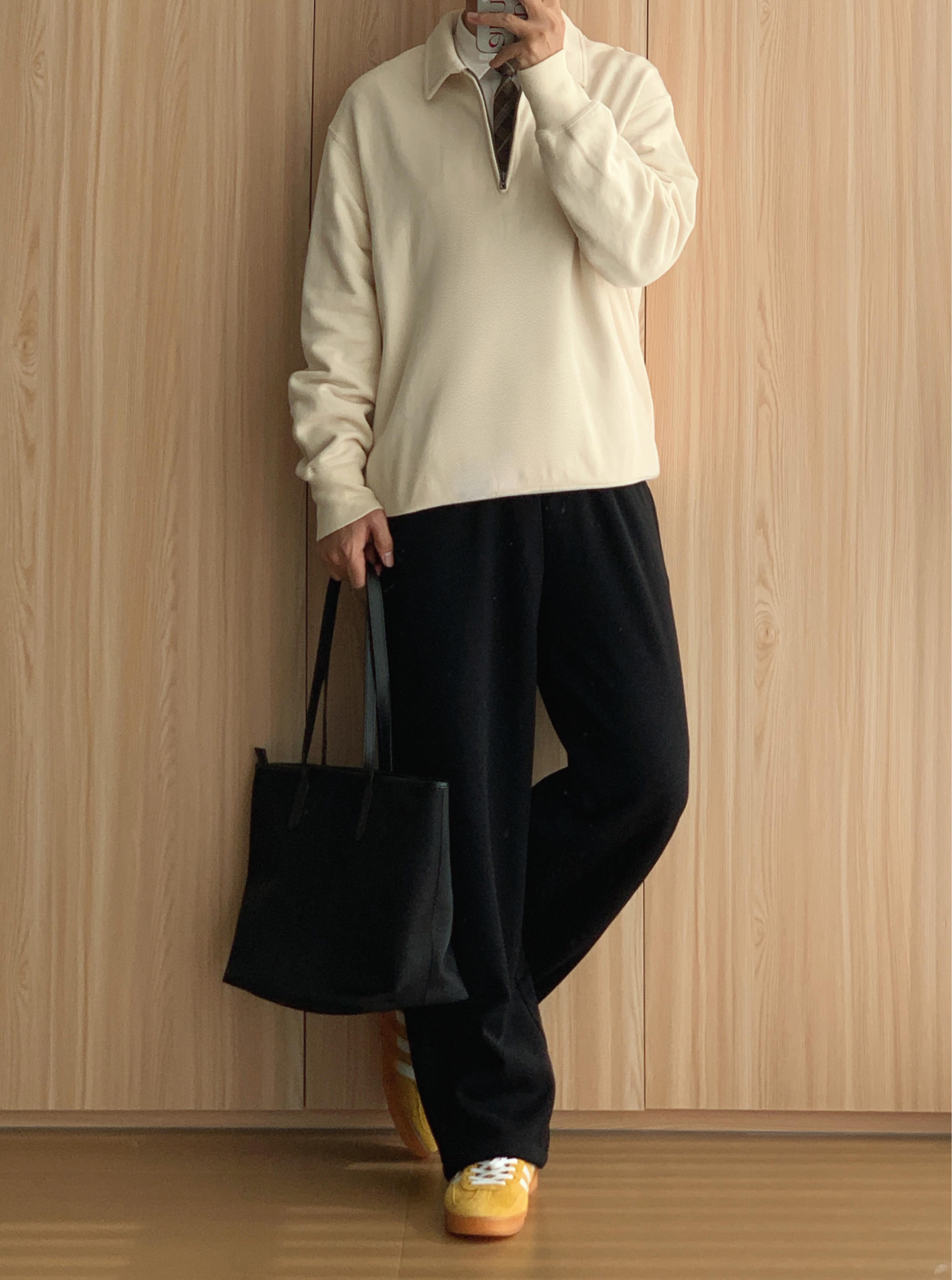 衬衫叠穿半拉链卫衣老钱一下✌🏻 🤳🏻OOTD 👨🏻💻175cm|70kg|42码 ▪️米色半拉链卫衣 ▪️黑色直筒休闲裤 ▪️姜黄德训鞋 ▪️黑色托特包 🙅🏻♂️个人观点,不喜勿喷,欢迎指点🙏🏻