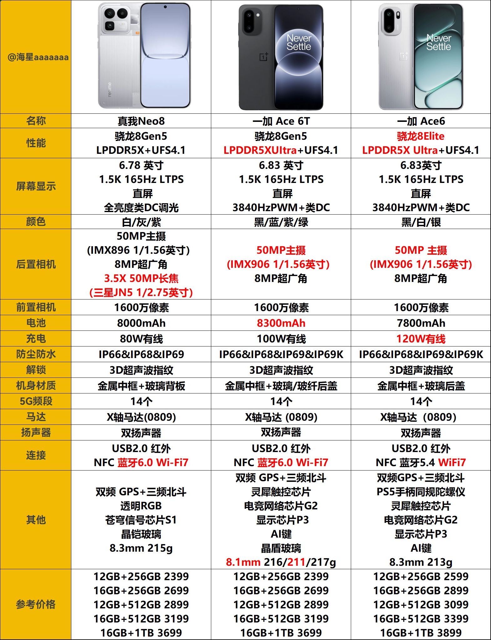 真我Neo8详细对比一加Ace6/6T ★性能:骁龙8Elite>骁龙8Gen5 ★续航:一加Ace6 (7.7小时)<真我Neo8(7.87小时)<一加Ace6T(7.98小时) ★快充:一加Ace6 (51分钟)>一加Ace6T(69分钟)>真我Neo8 (81分钟) 数据来源:@小白测评 ———————— ★售后:2026年4月真我售后将全面接入OPPO,门店数量全面增加,服务水平更好(...