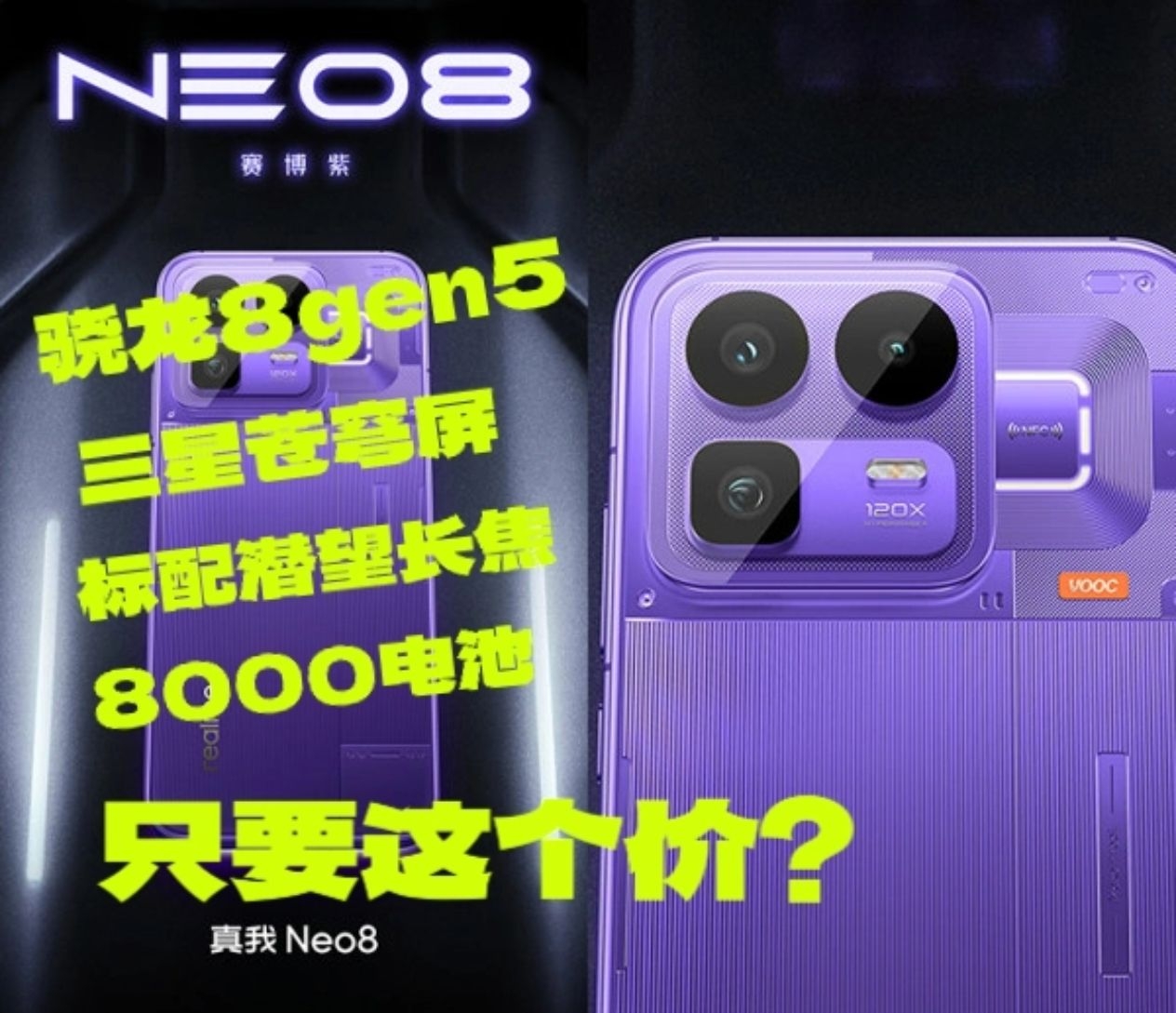 搭载骁龙8GEN5!真我Neo8 正式发布 带有长焦 真我NEO系列属于次旗舰 处理器性能比较不错 影像之前是比较入门 不过这代 居然用上了长焦 外形是很机甲风 颜色有 塞博紫 机甲灰 起源白 机身支持IP66 68 69防尘防水 处理器为第五代骁龙8 带有大面积散热 安兔兔跑分超过300万 游戏是没啥压力 可玩一些PC游戏 比如丝之歌 古墓丽影等 系统为7.0 支持三个大版本更新 影像这台提升不...