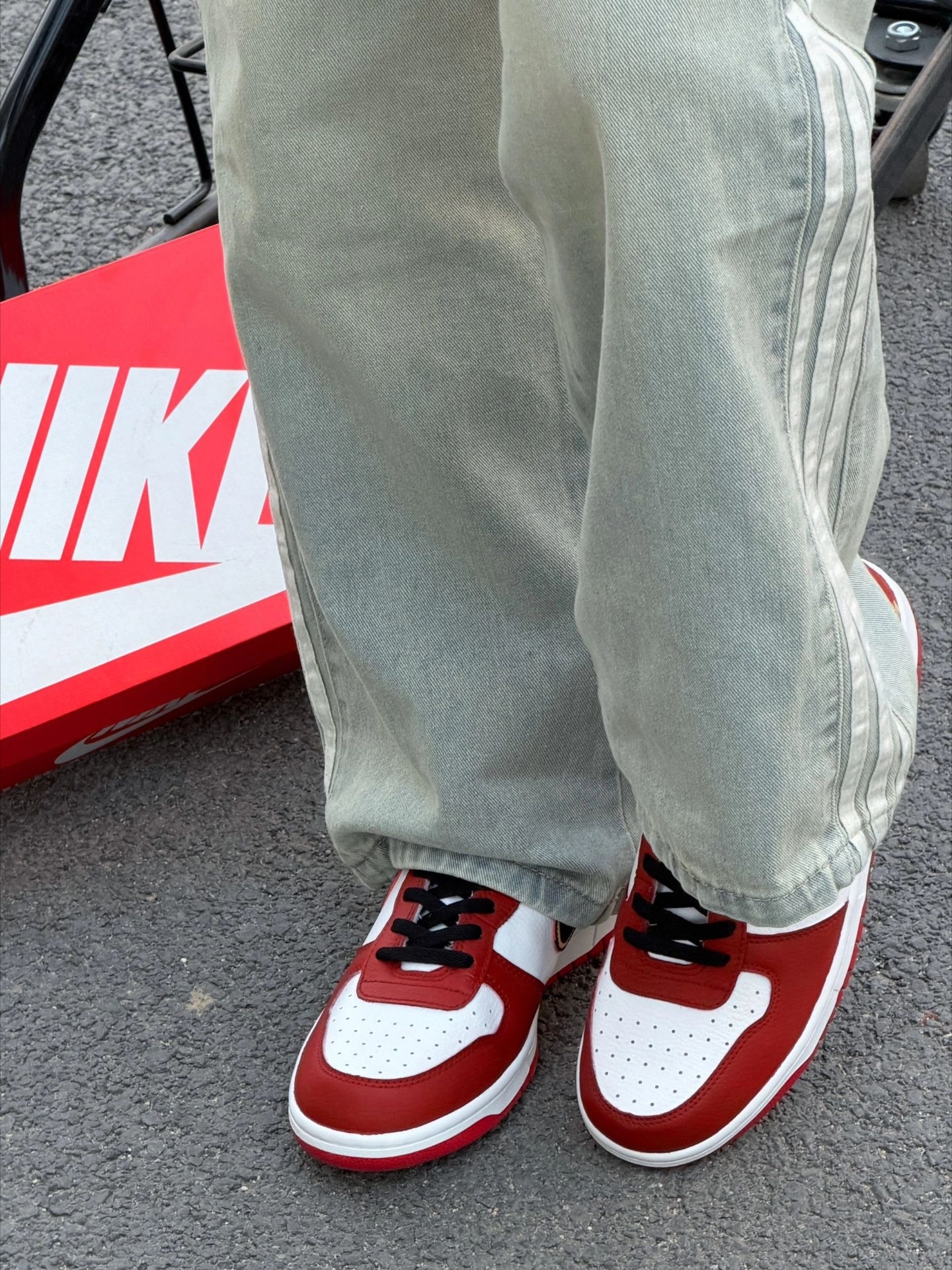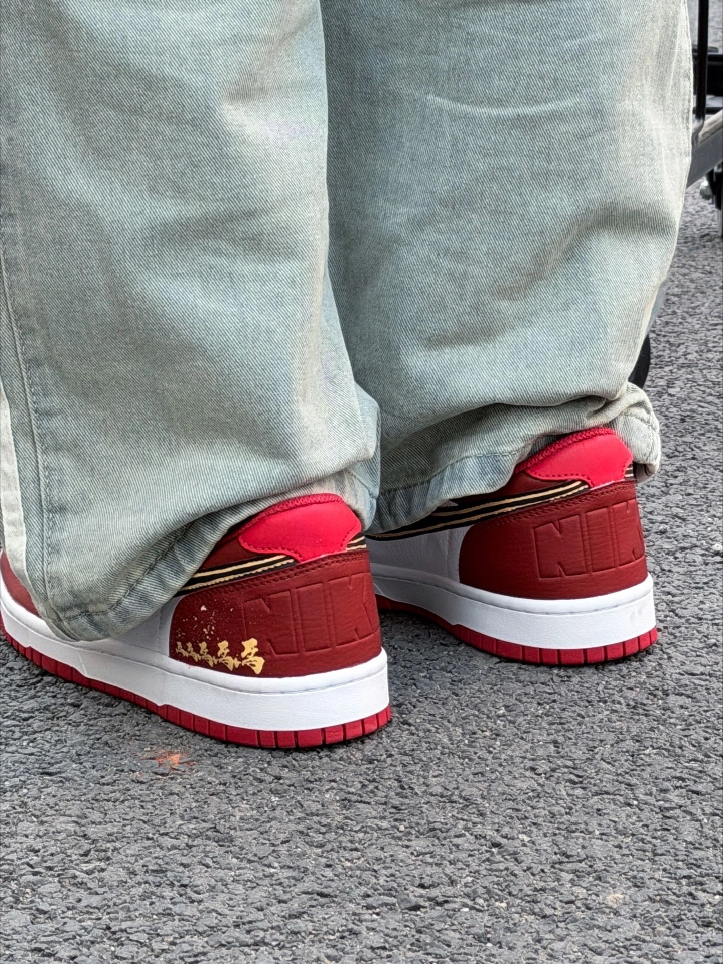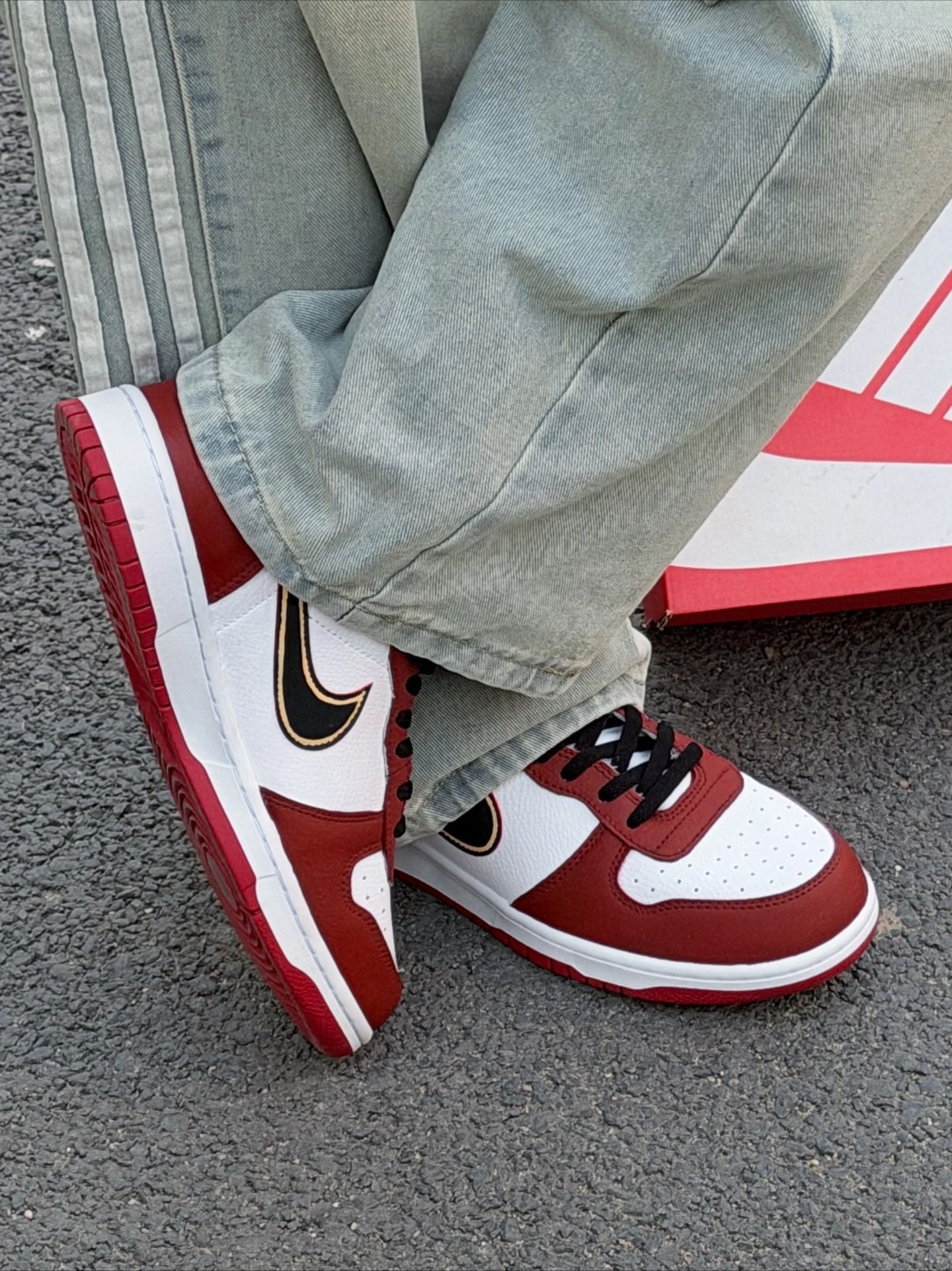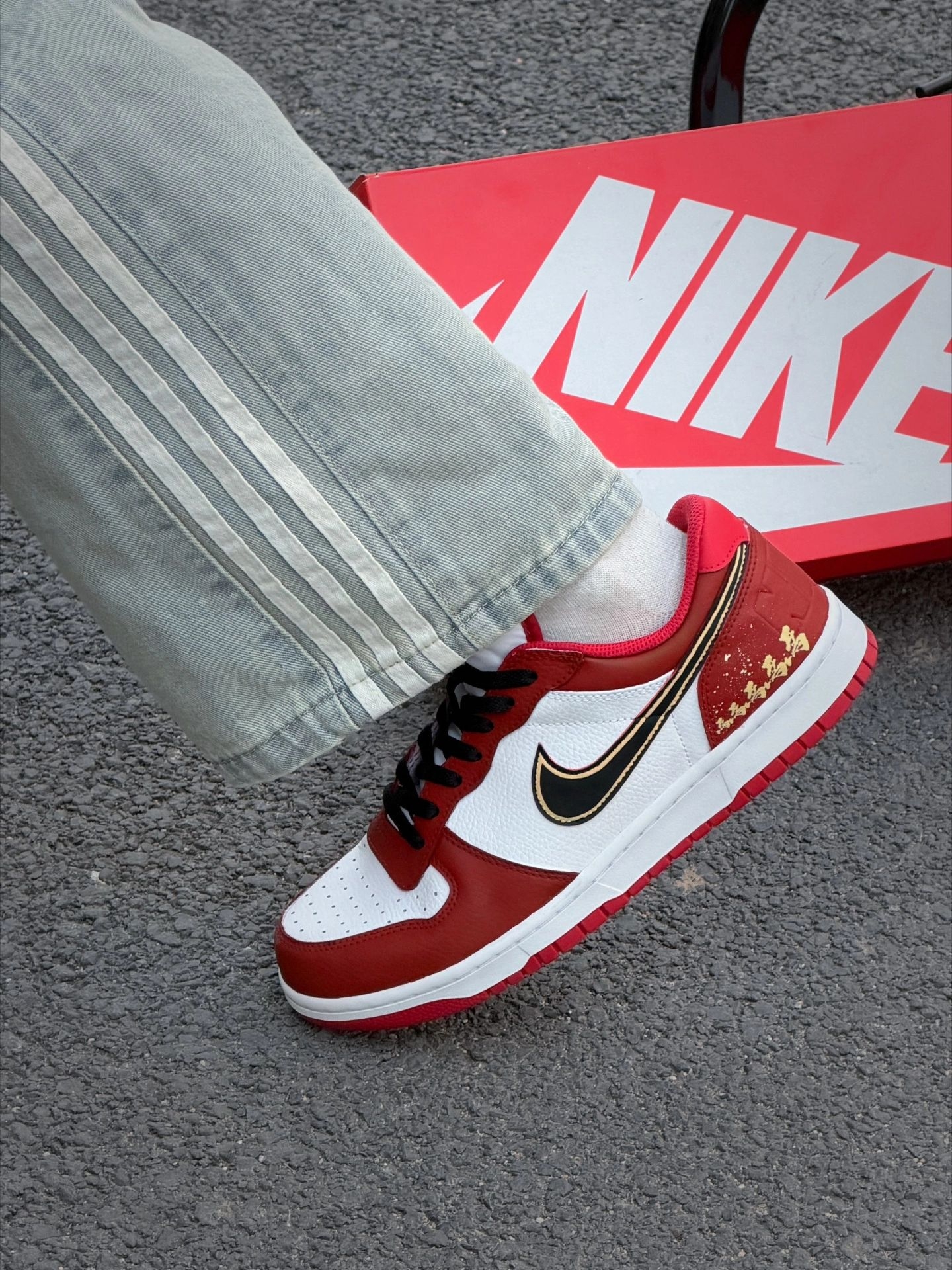 红金配色yyds!这双Dunk我先冲了|||最近新入手的这双红白金配色Dunk,上脚真的太对味了! 红白撞色特别正,配上金色勾子点缀,新年穿出门回头率直接拉满。 鞋型很百搭,配我这条做旧牛仔裤刚好,街头感一下就出来了。 脚感还是熟悉的软弹,平时上学或者跟朋友逛一天街都不累。#红白金百搭鞋 #dunksb红白 #dunk白红配色 #dunksb白红 #红白配色绝了