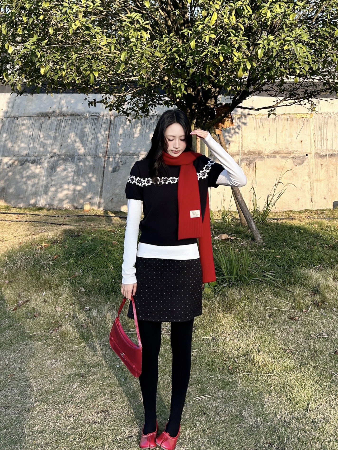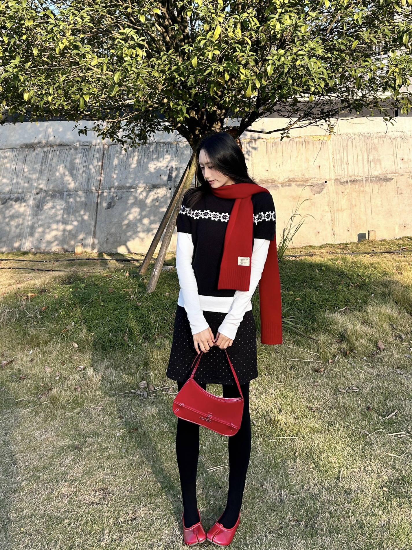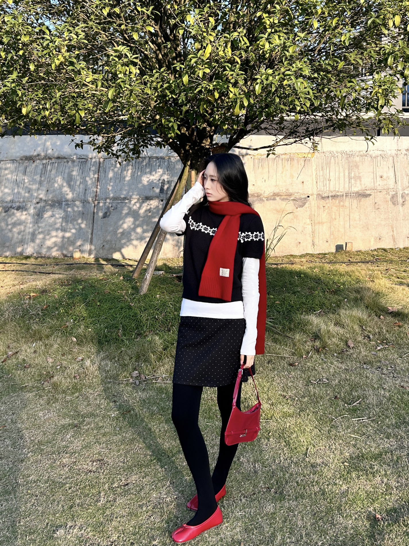 提前解锁新年红穿搭,小面积的红色配饰和黑白主调碰撞,叠穿的针织衫增加层次感,波点裙中和了红色的张扬,日常穿也不会太夸张~