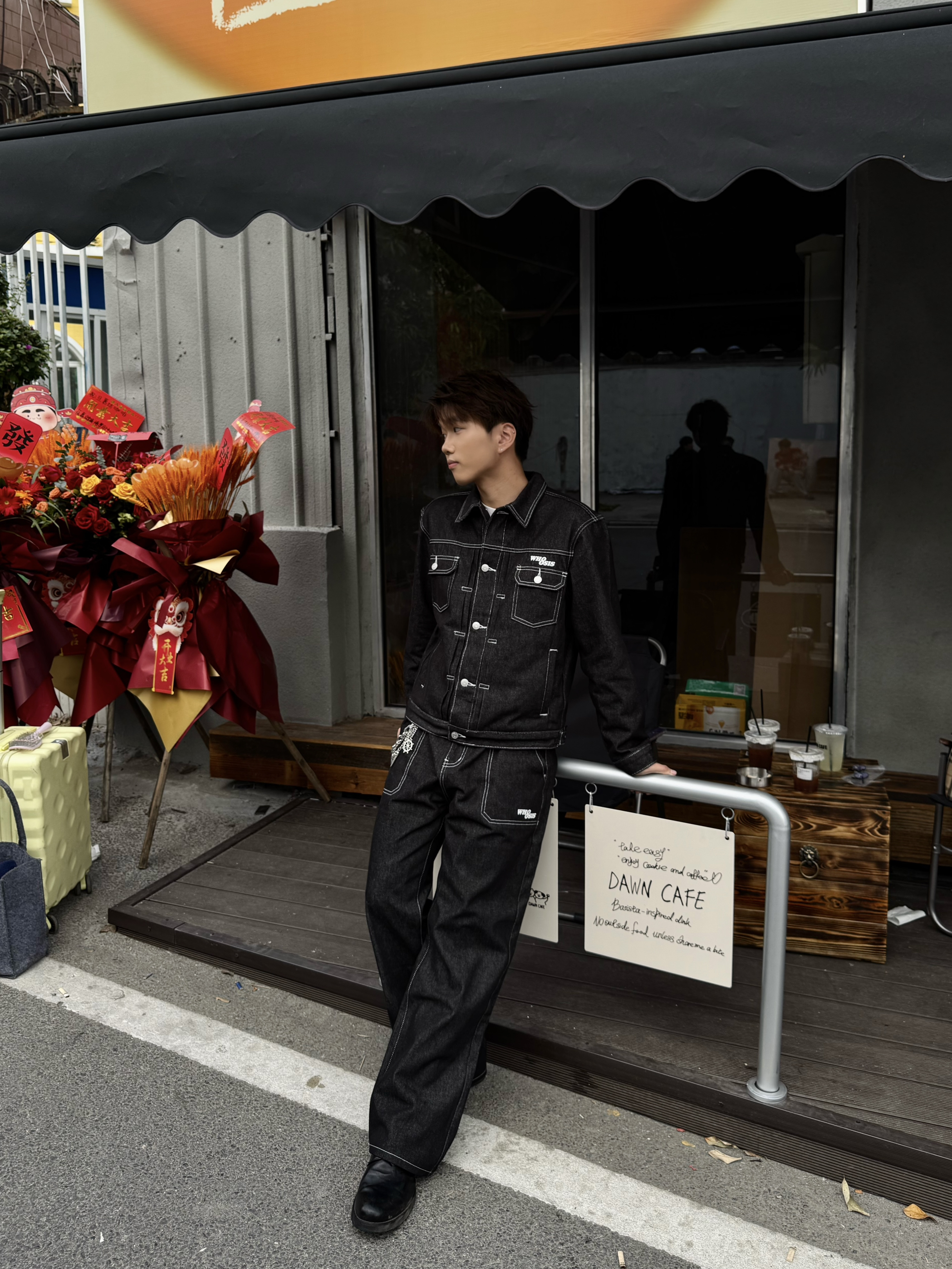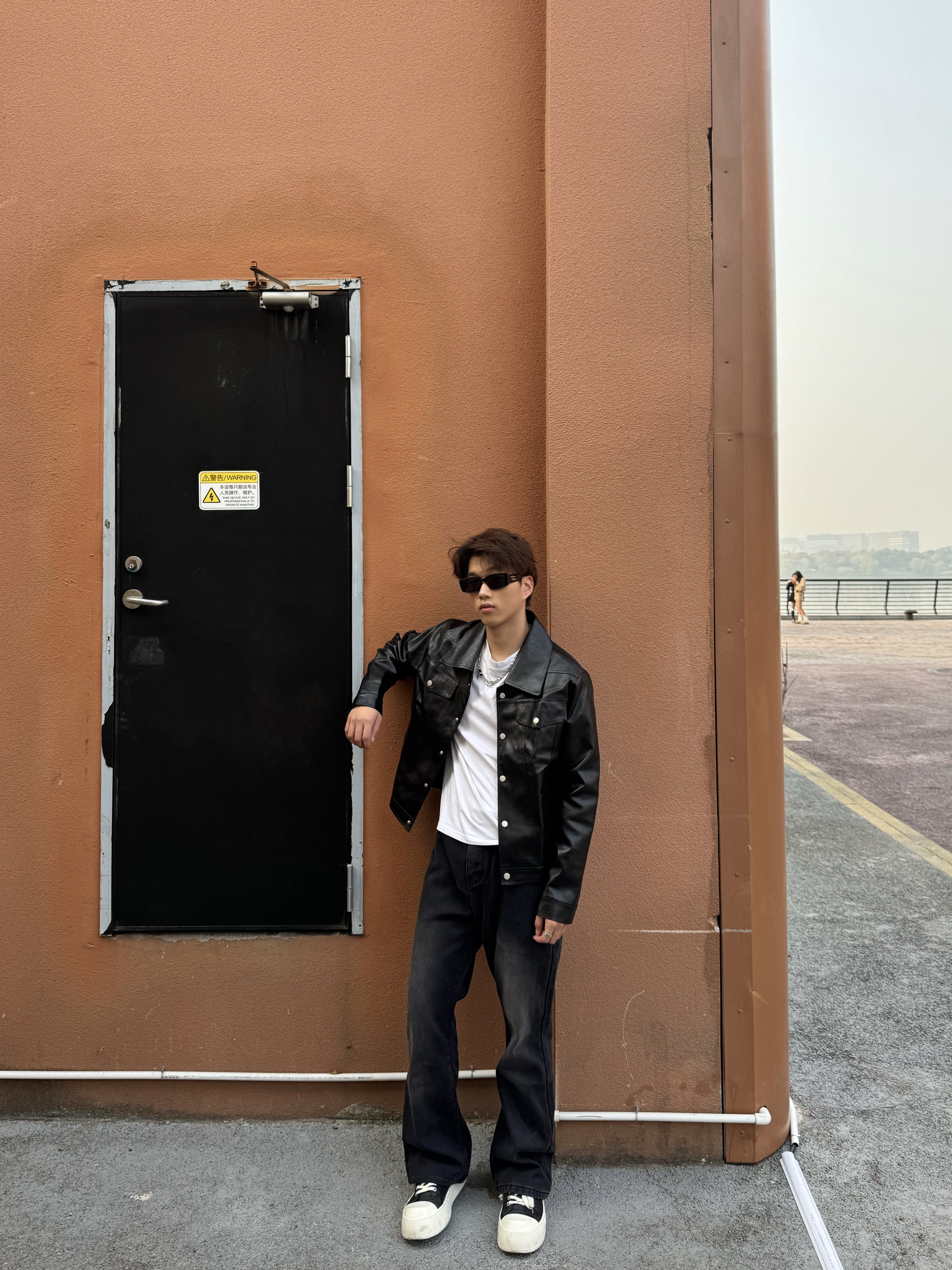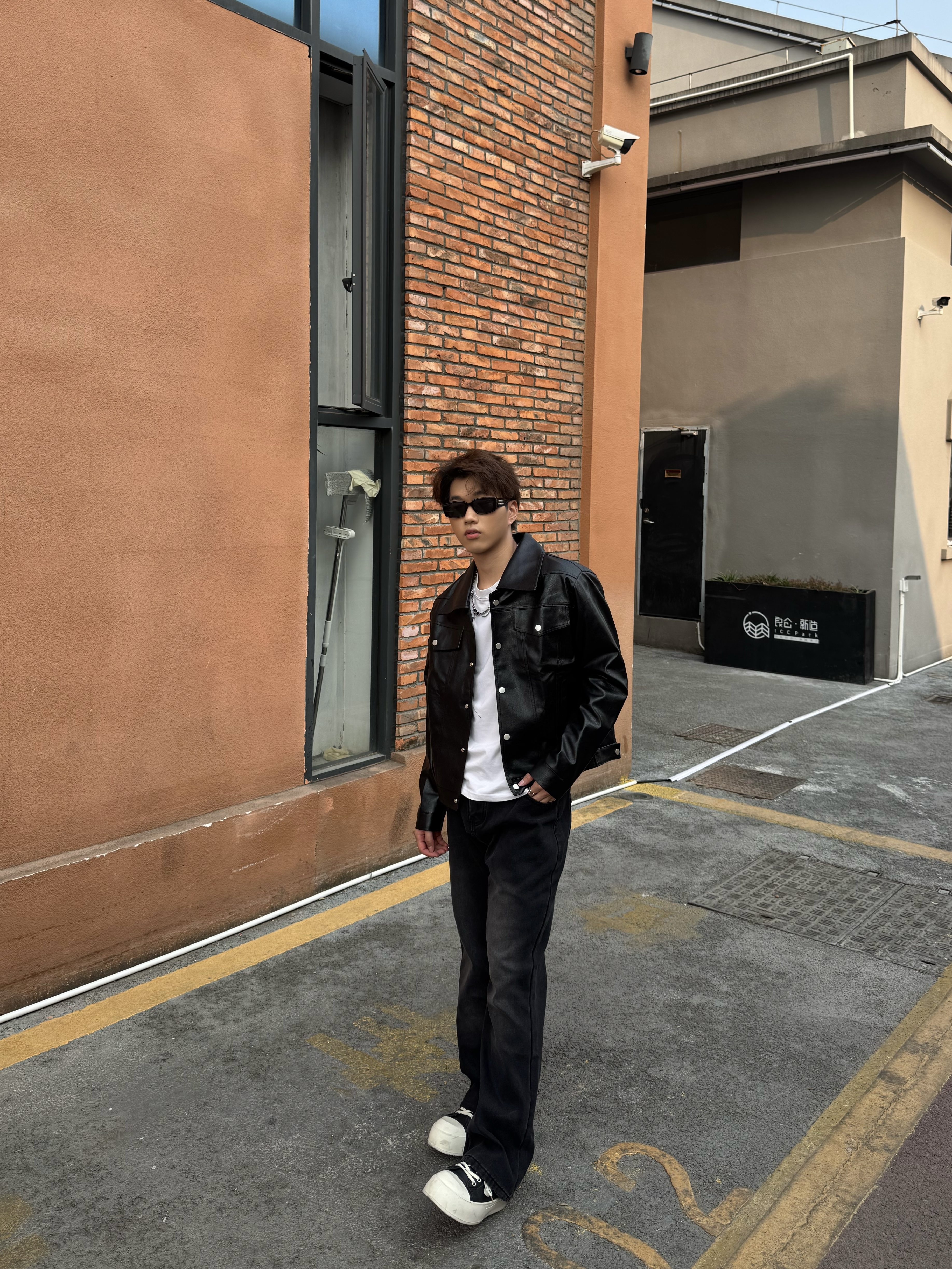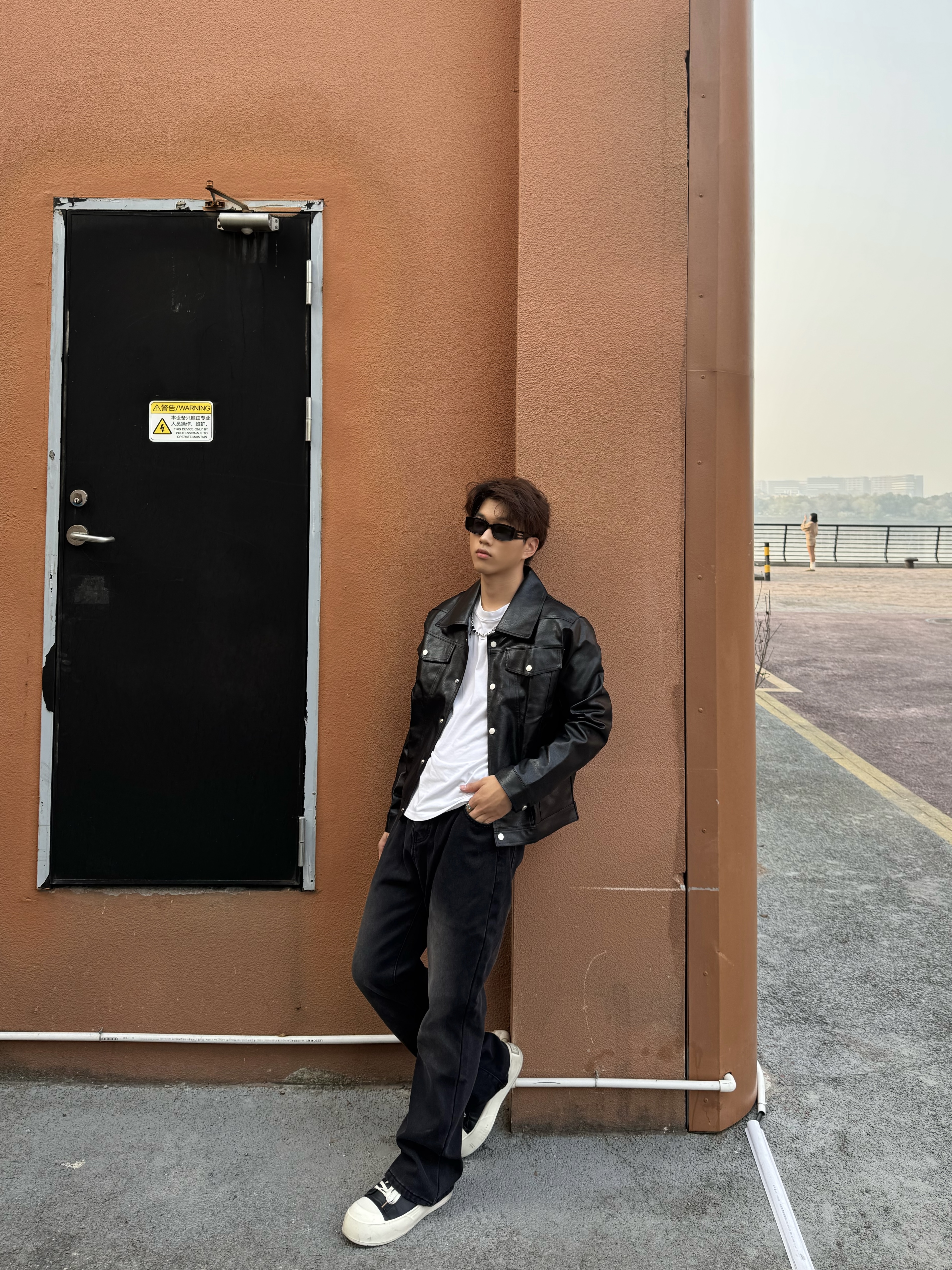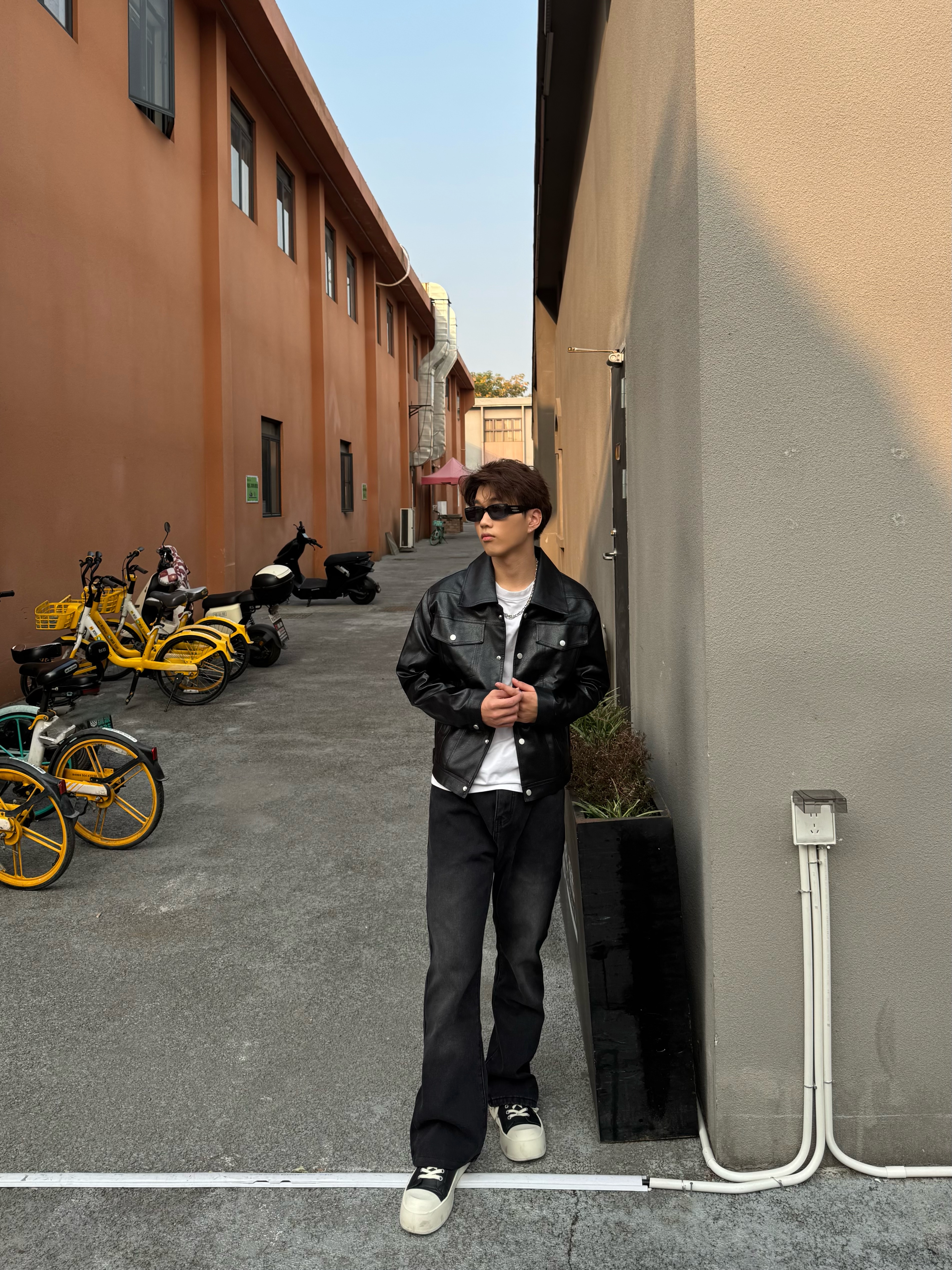 今天这套全黑穿搭直接拿捏住街头松弛感✨ 亮面黑皮夹克自带硬朗质感,版型挺括不塌肩,单穿或叠穿都很有型。 内搭基础白T,下身搭微喇牛仔裤,脚踩黑白板鞋,一身利落又带点痞帅。 墨镜一戴,随便走两步都出片