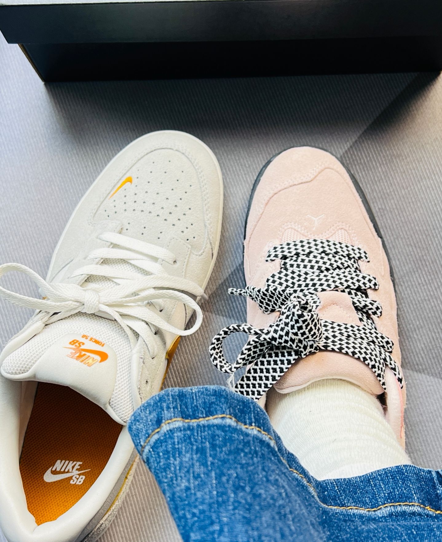 左边这双粉调的,麂皮面摸着手感软,但沾灰太明显,出门走一圈鞋头就蒙层薄灰,得随身带块布擦👀。刚穿那两天鞋帮卡后跟,贴了创可贴才好点,鞋底软度刚好,走半小时脚不酸,但雨天不敢穿——麂皮沾湿会留印子。 右边这双白灰拼黄的,帆布面透气,不过鞋头偏窄,脚宽的穿久了挤脚趾。黄色皮质部分容易蹭脏,拿湿巾擦完会有点泛白。鞋底偏硬,逛超市还行,走超过一小时脚底发沉。 俩鞋搭牛仔裤都挺顺眼,但确实得接受它们“娇...