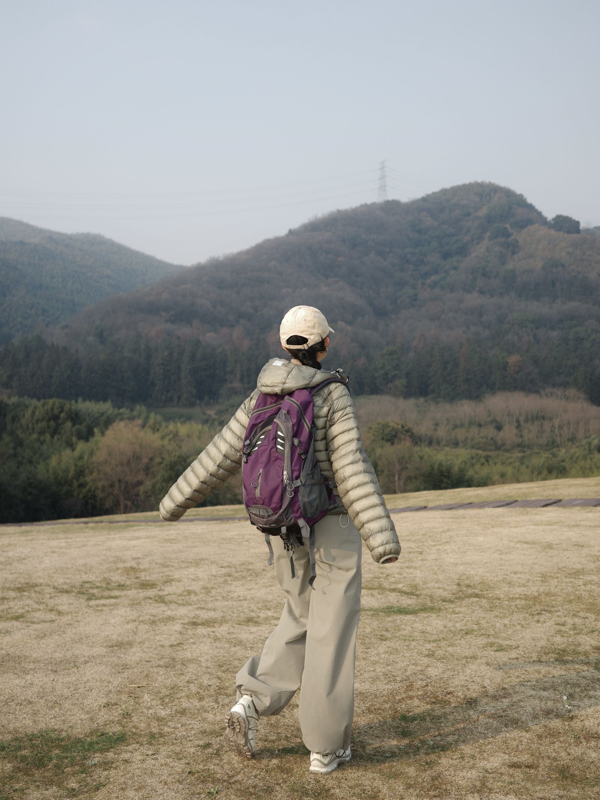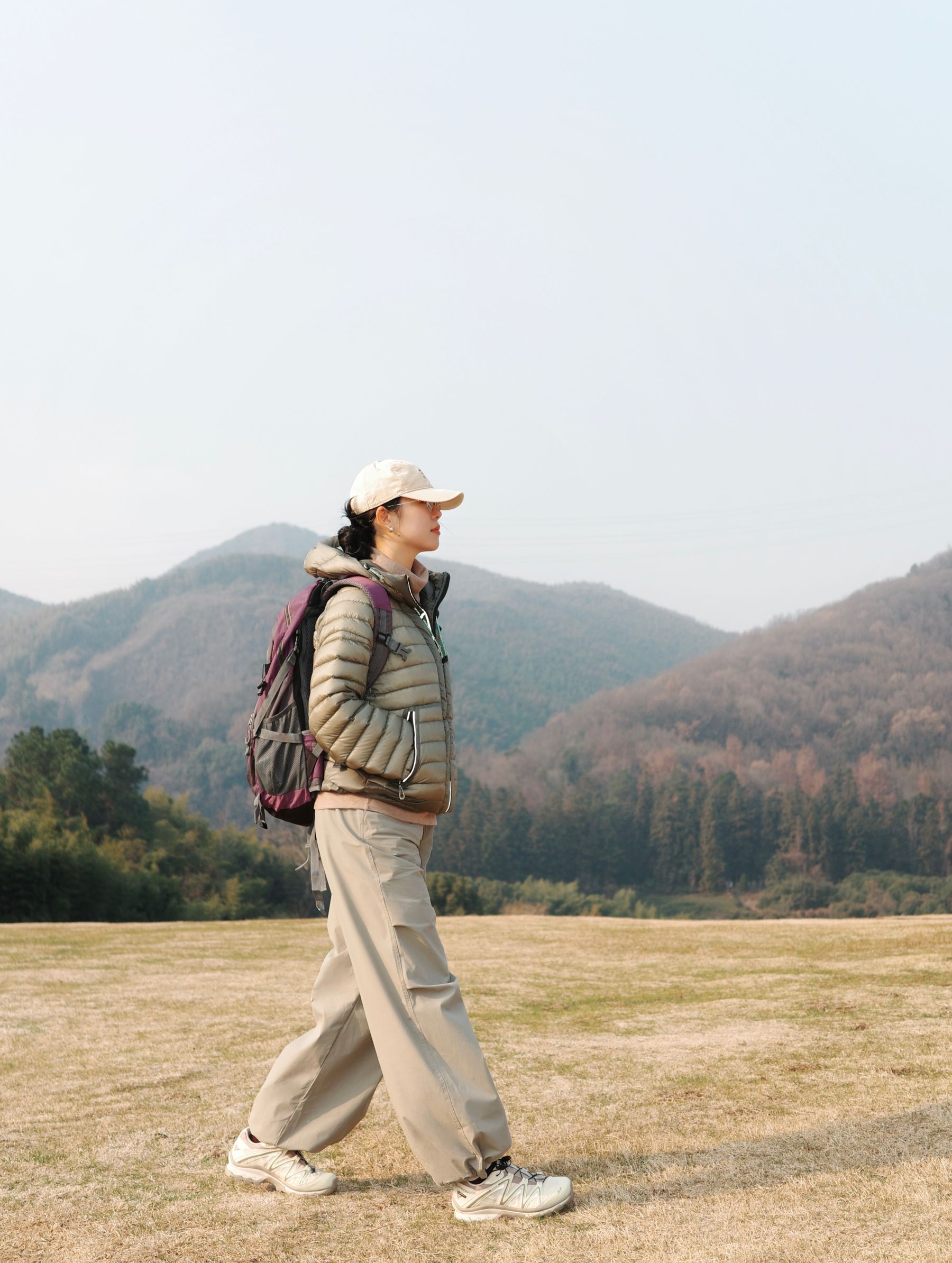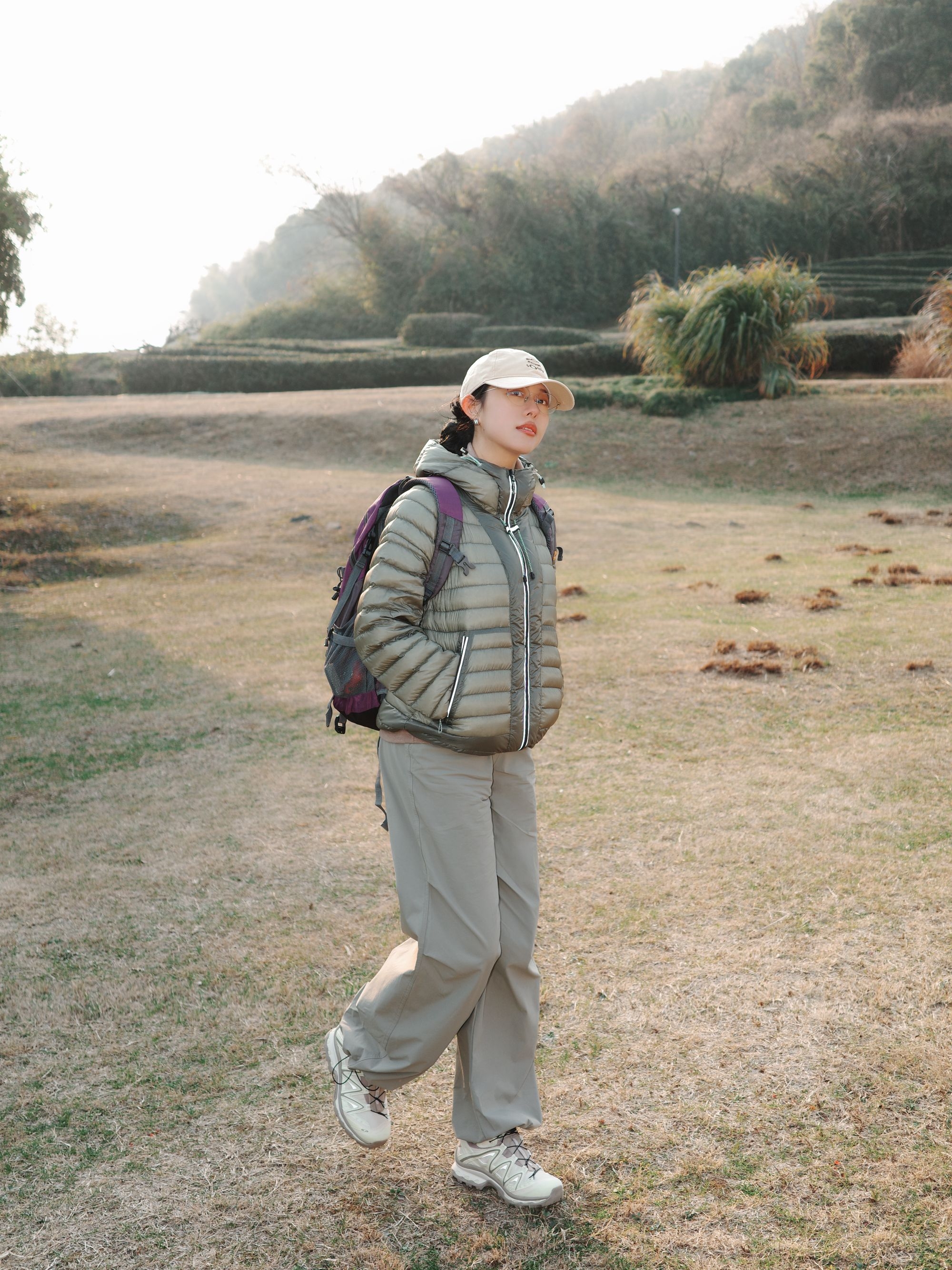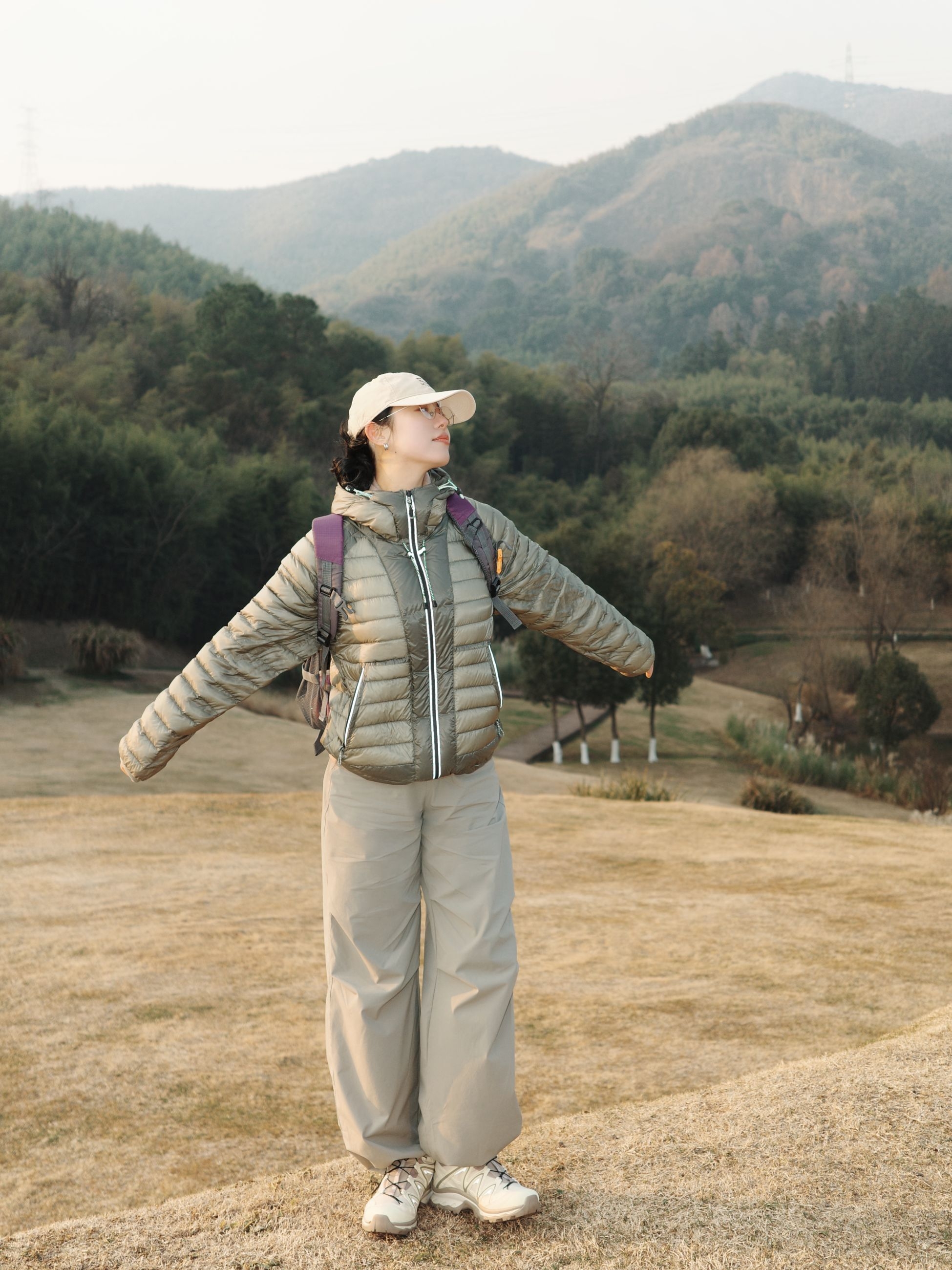晒着冬日暖阳往山里钻,这一身轻装适配度拉满✨ 卡其色排骨羽绒服轻软又保暖,叠穿内搭藏着小层次,风一吹也不晃~ 浅卡其阔腿裤垂感够足,跑跳蹲坐都没束缚感,裤脚抽绳还能切换造型 Salomon运动鞋配色柔和,踩在干草坡上抓地力稳稳的,走久了也不累 棒球帽+撞色背包把户外感拉满,条纹袜子悄悄露个边,细节里藏着小趣味🌿 往山野里走,把旧年的疲惫踩在脚下,朝着新一年的鲜活出发