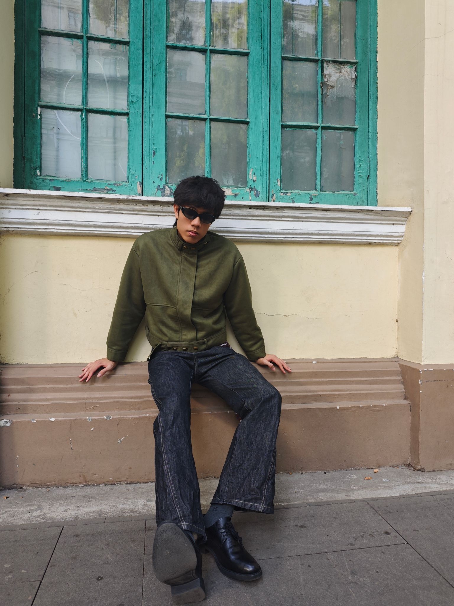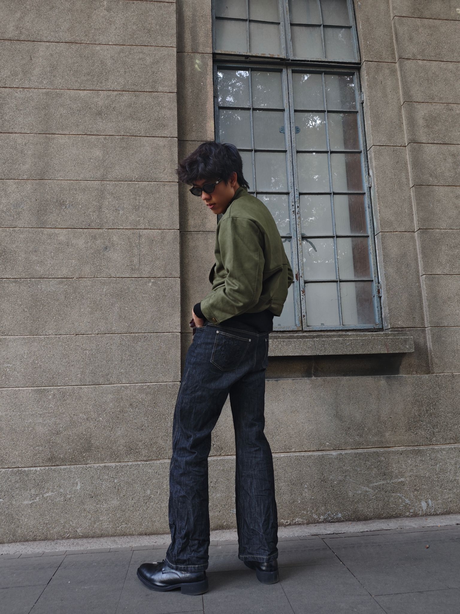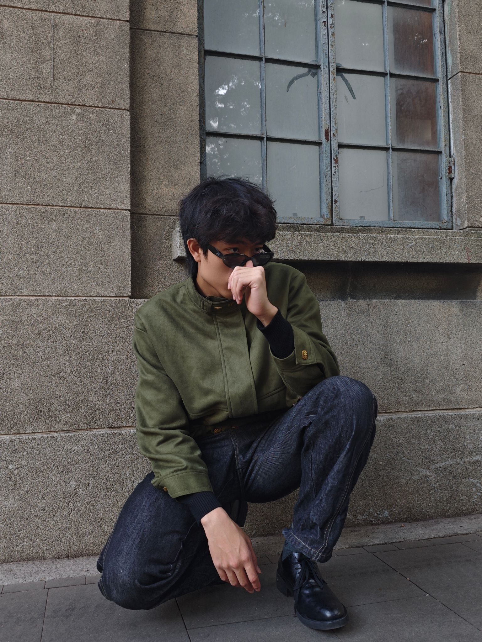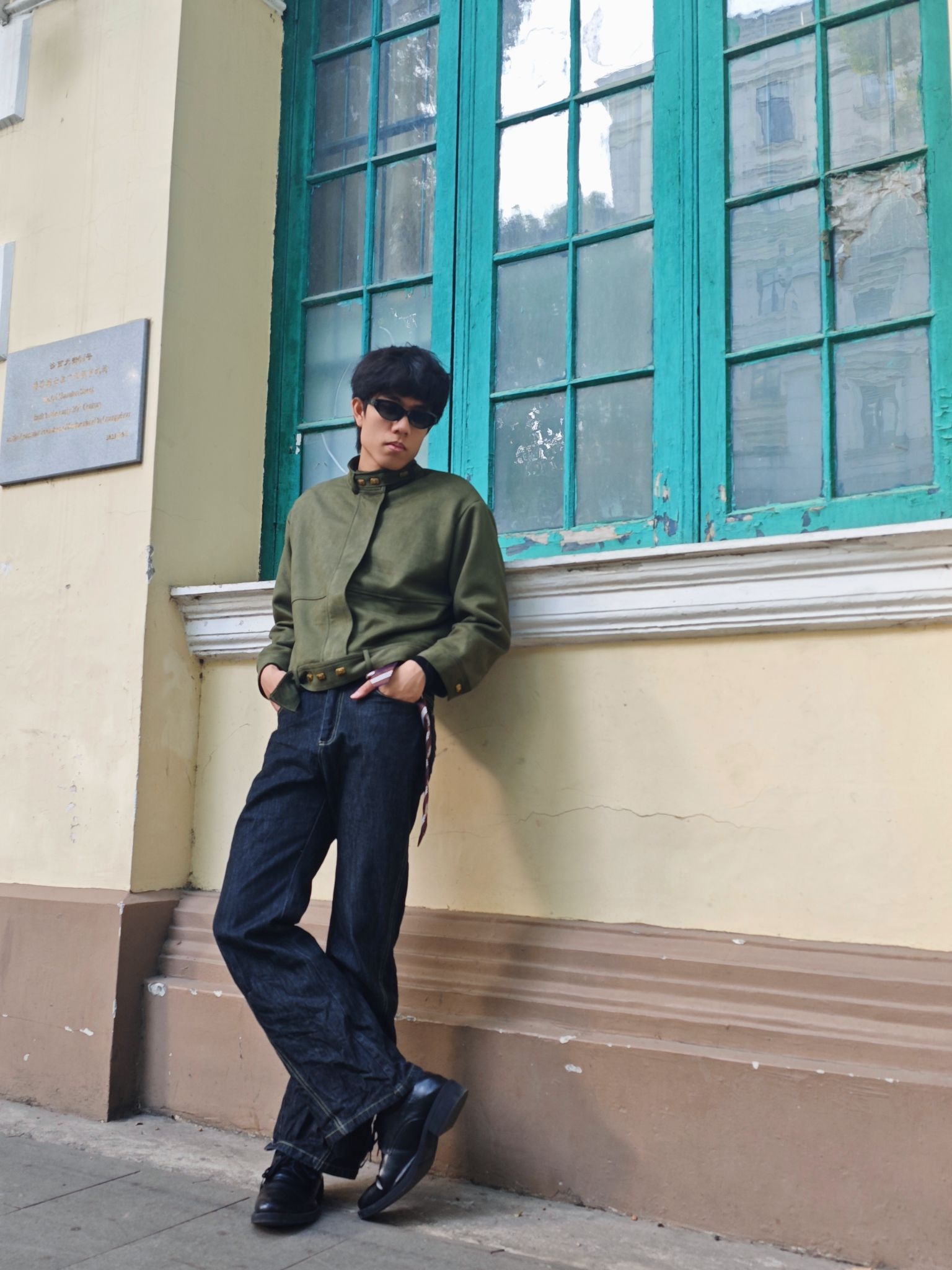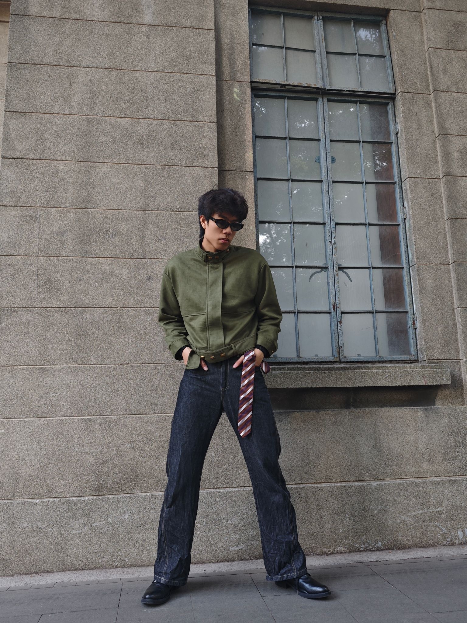分享今日穿搭 上衣军绿色短款夹克 工装风的立领与简约版型营造出利落的复古氛围 短款设计还能优化身材比例🥰🥰🥰 下装黑灰色原色牛仔裤 阔腿版型延续休闲松弛感 条纹领带作为配饰随意挂在裤腰 打破整体的工装硬朗感😎😎😎 黑色皮靴则提升了造型的精致度 这样一套穿搭你get了吗😍😍😍