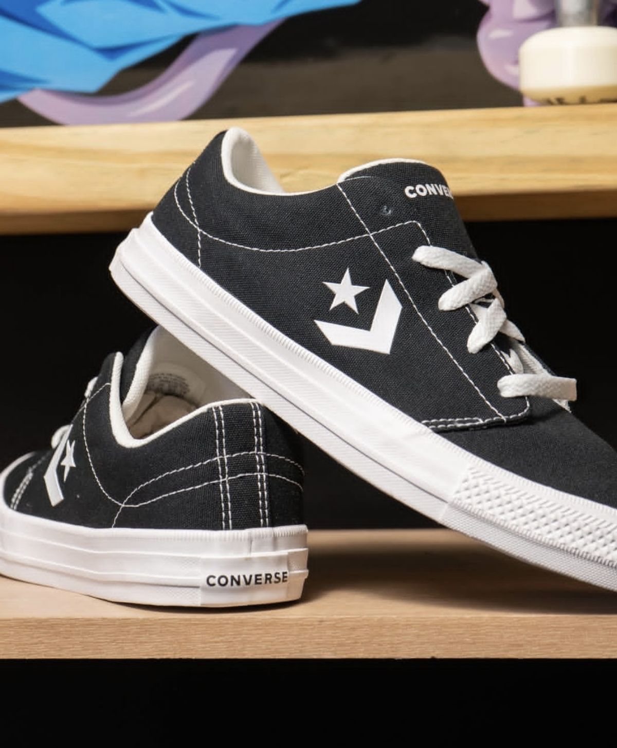 - 标志性星箭Logo:鞋身侧面的星箭图案是Converse运动支线的经典标识,区别于All Star的圆形标志。 - 帆布材质:鞋面采用耐磨透气的帆布面料,搭配硫化橡胶中底,兼顾舒适与耐用性。 - 简约百搭:黑白配色经典不出错,适合日常穿搭、滑板运动等多种场景。
